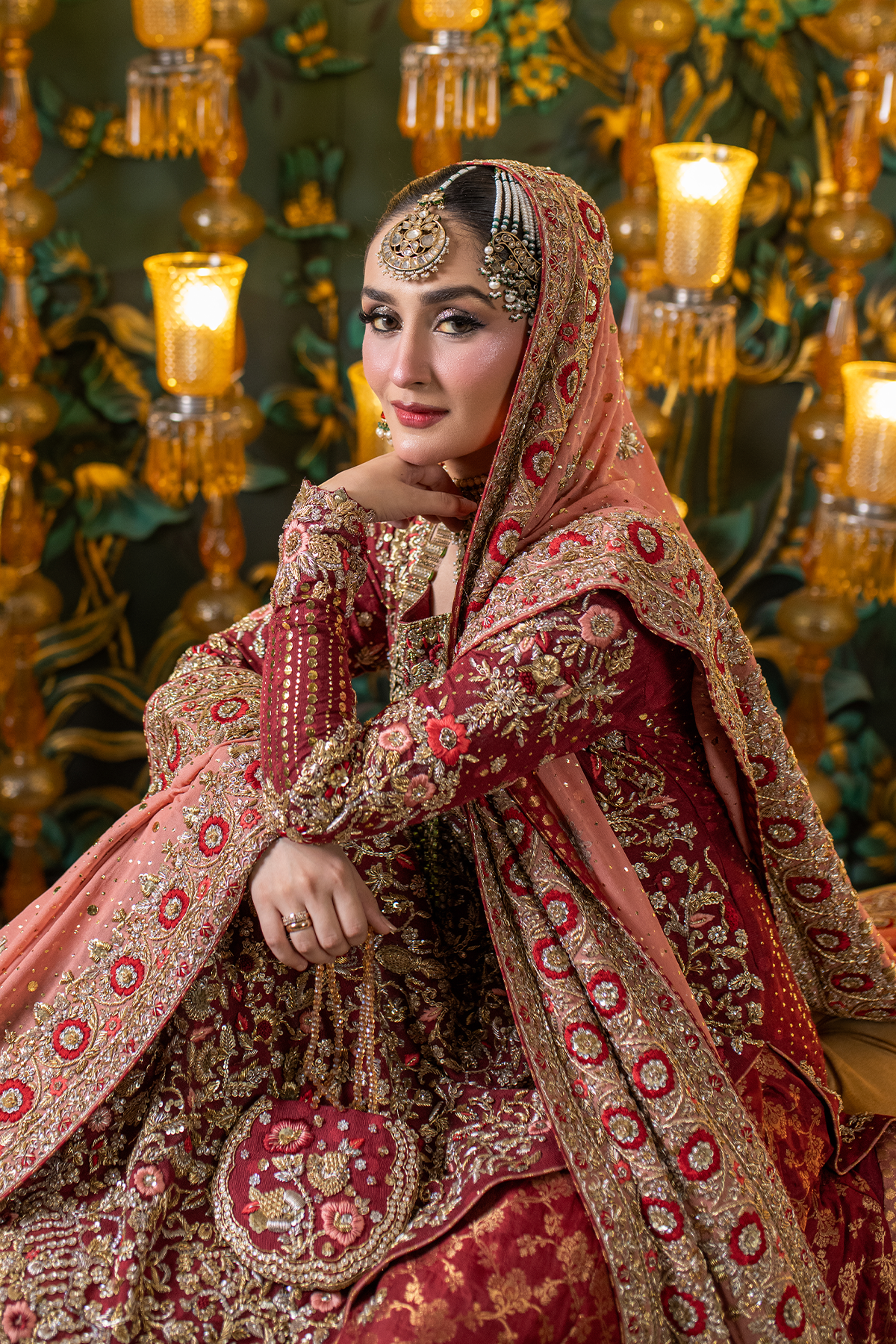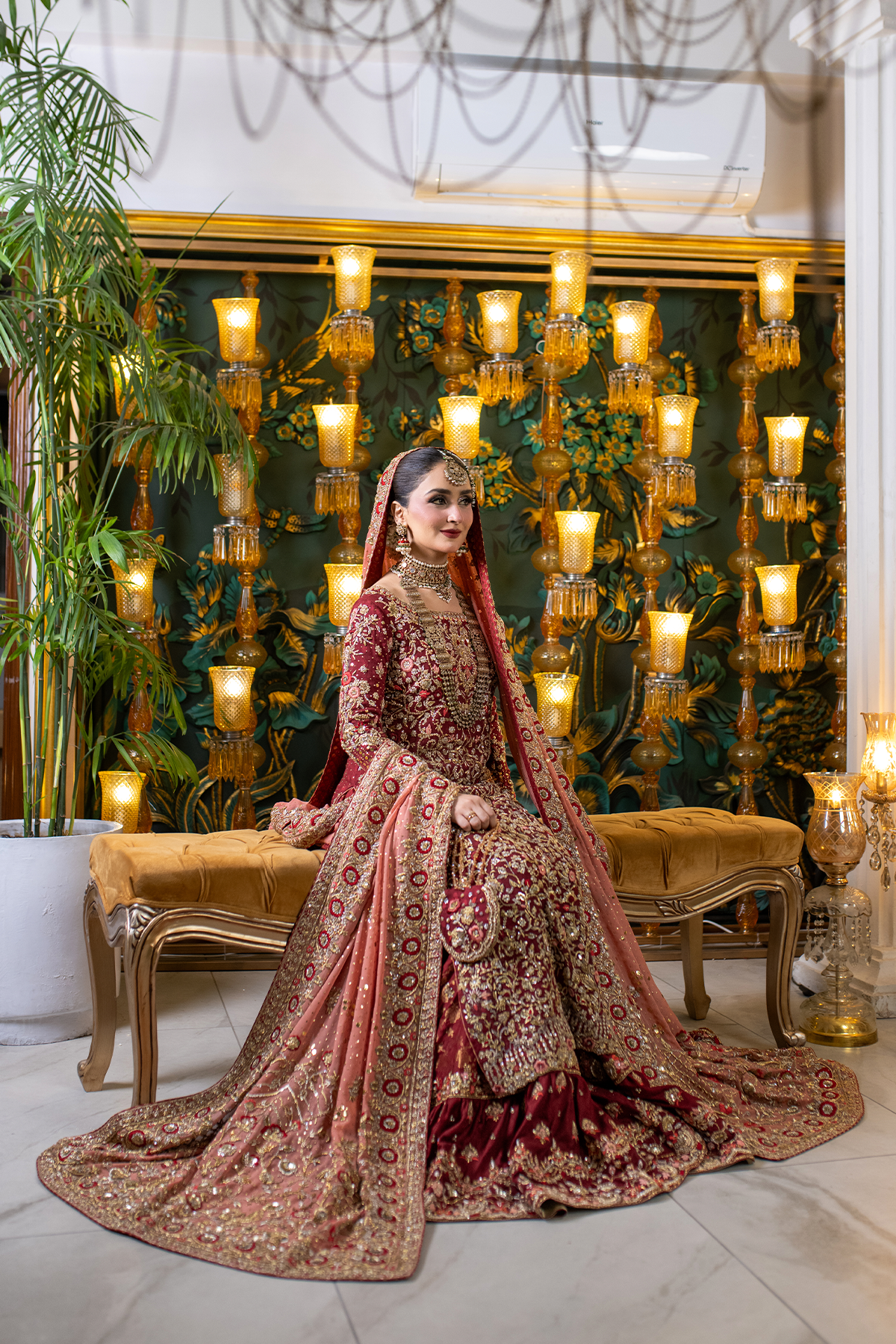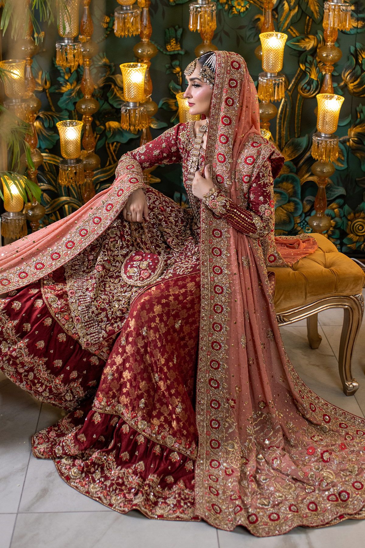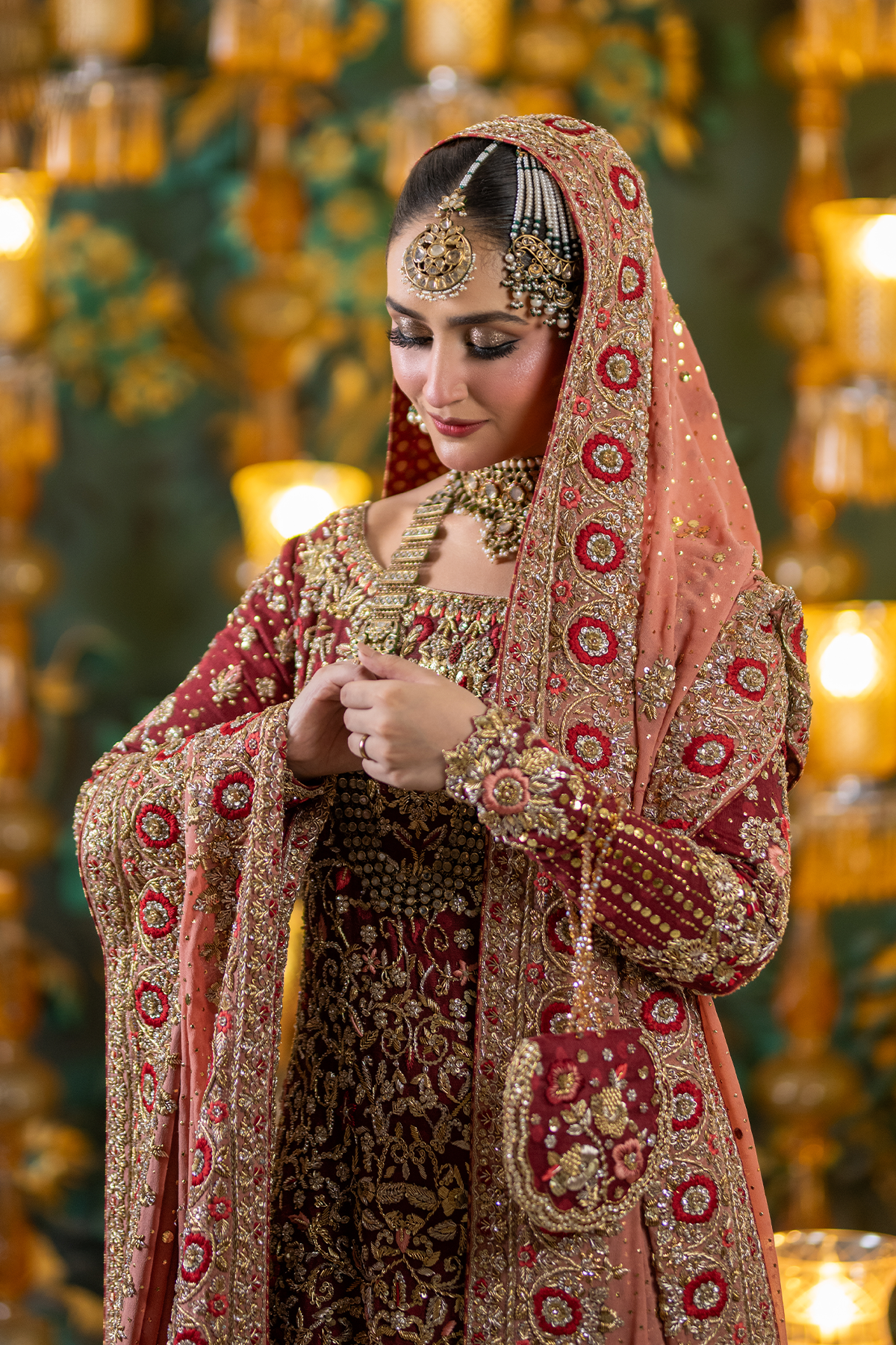 A light gold kalidar paired with a copper dupatta. This intricately handcrafted bridal kalidar is crafted with dabka, resham, kora, naqshi and sequins. Paired with a jamwar lehnga with handworked border.