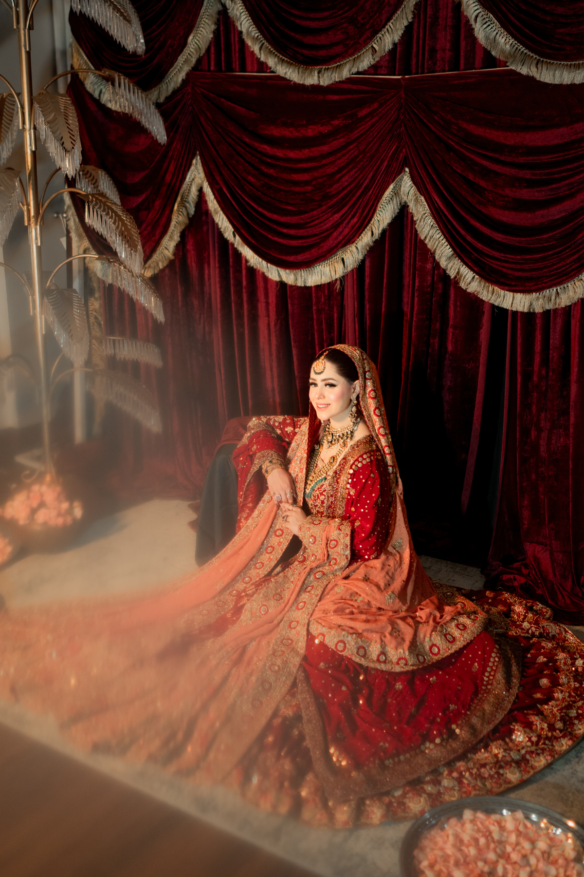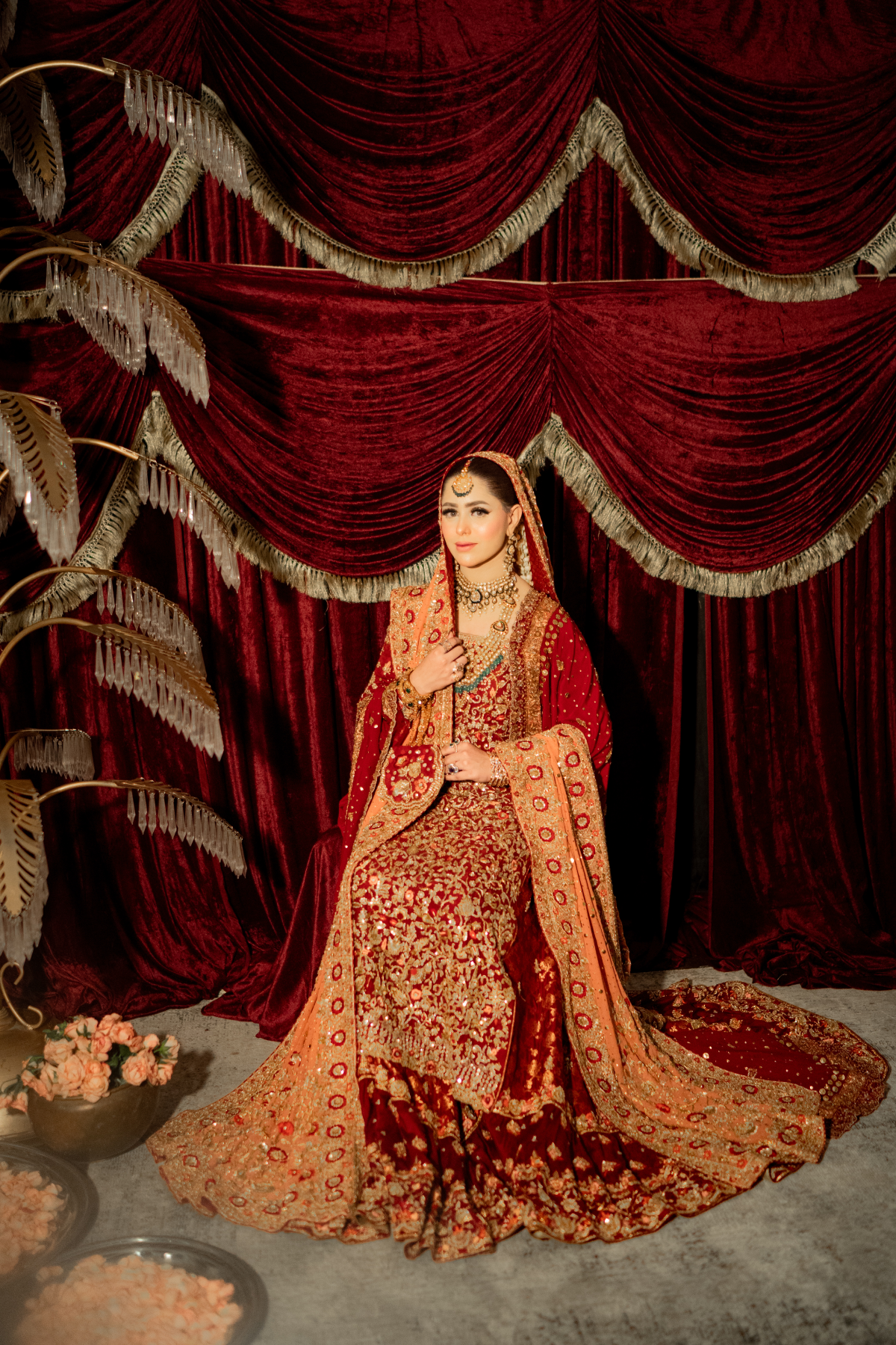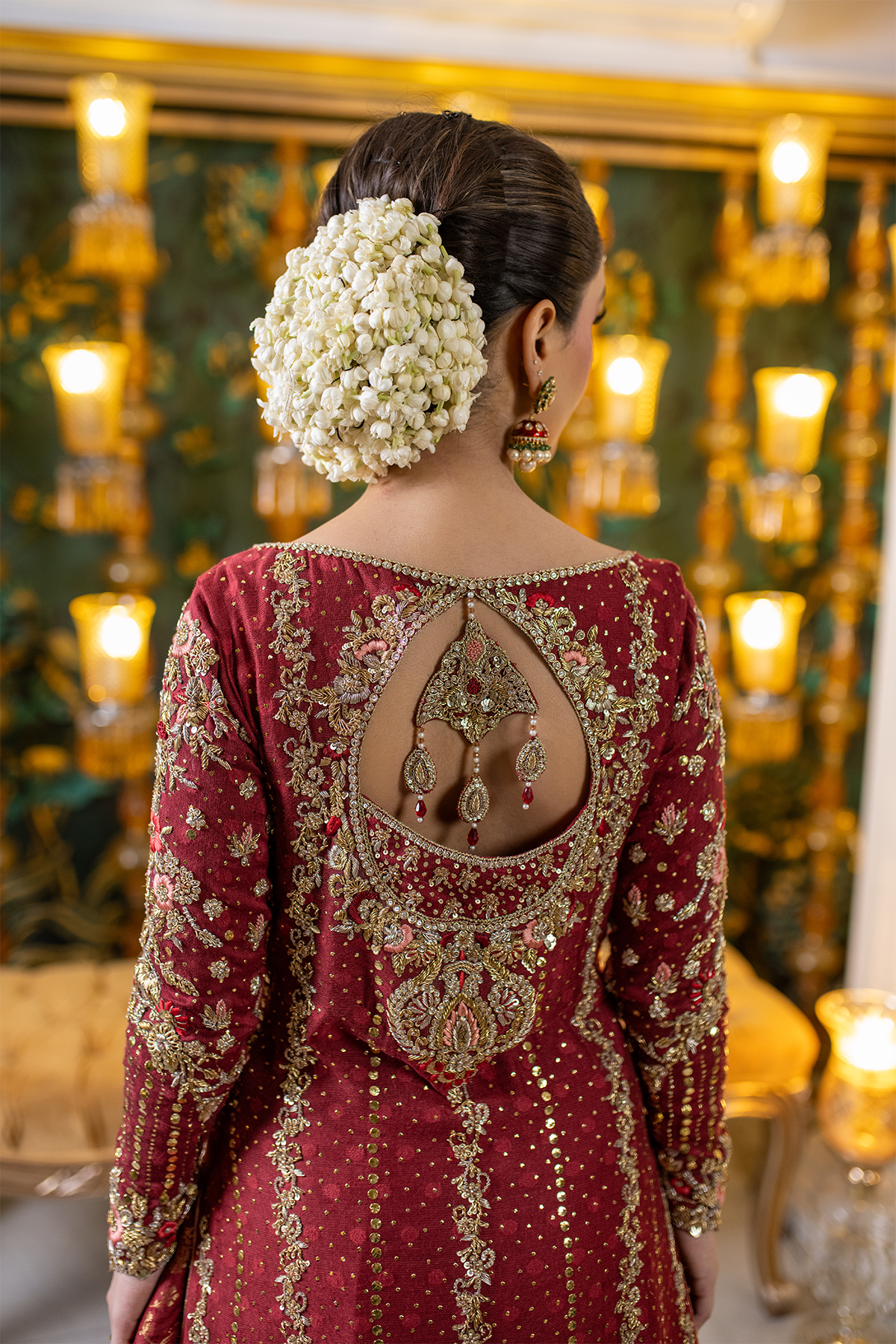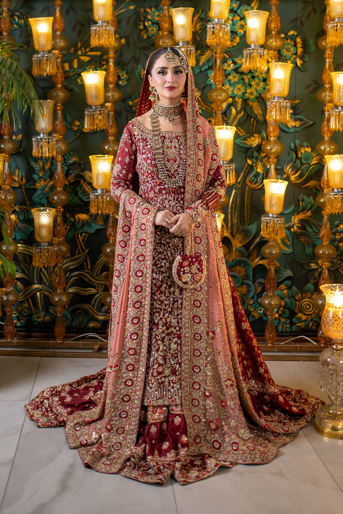 A light gold kalidar paired with a copper dupatta. This intricately handcrafted bridal kalidar is crafted with dabka, resham, kora, naqshi and sequins. Paired with a jamwar lehnga with handworked border.