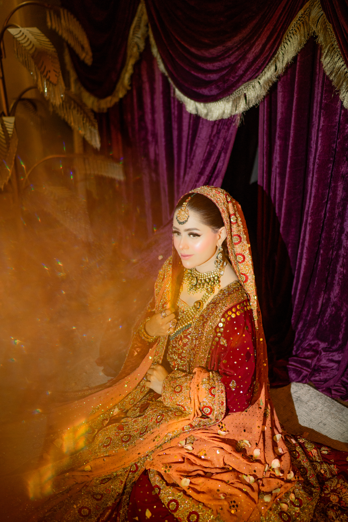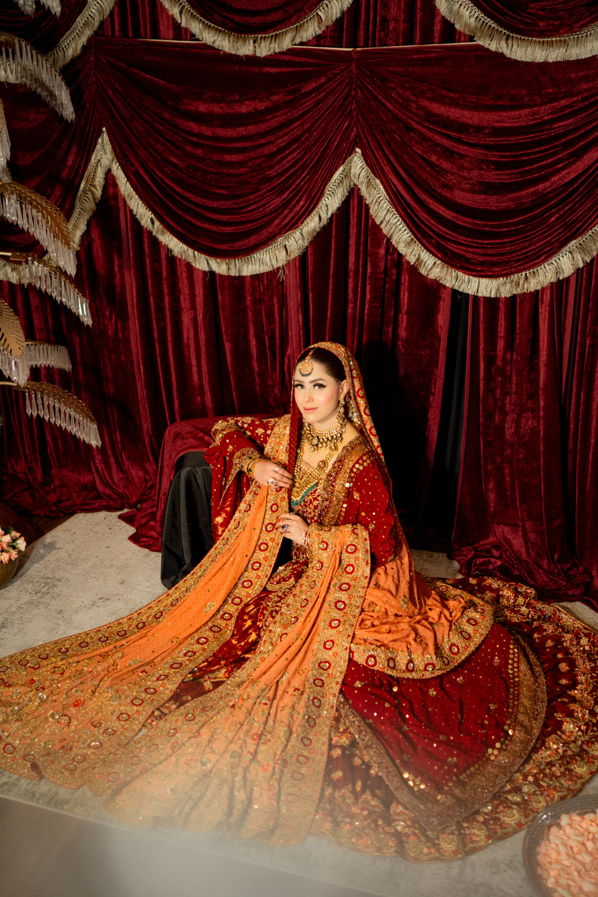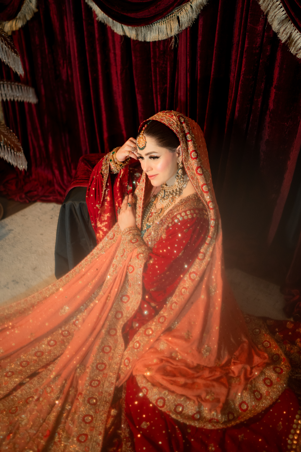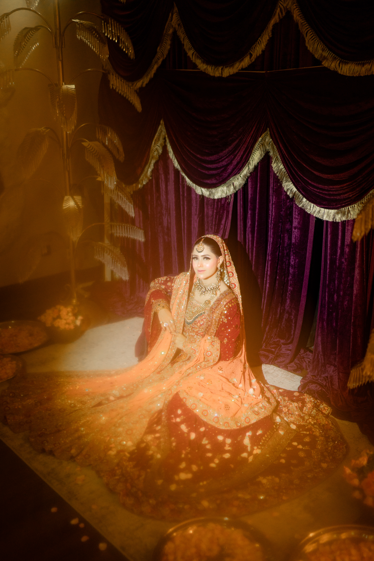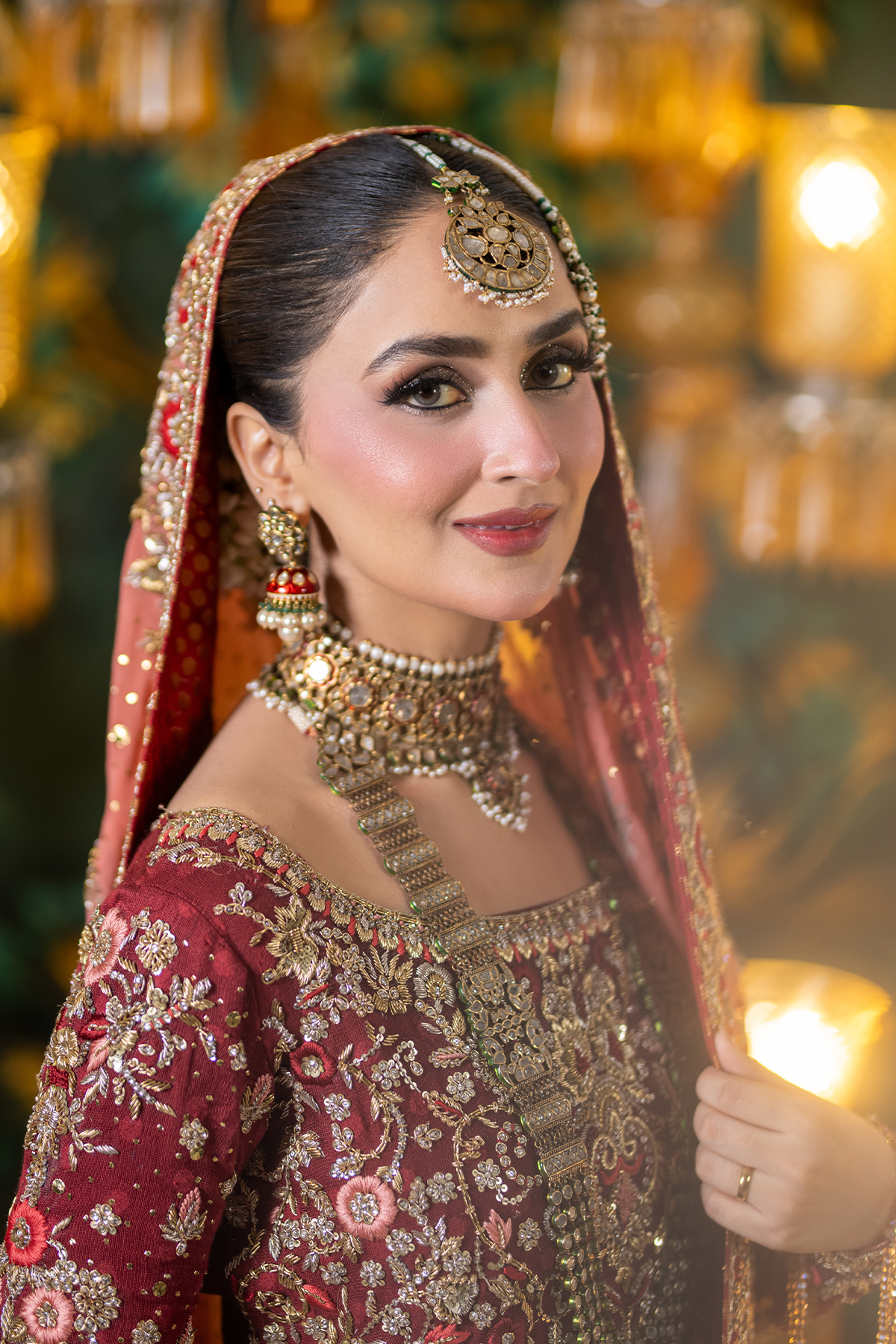 A light gold kalidar paired with a copper dupatta. This intricately handcrafted bridal kalidar is crafted with dabka, resham, kora, naqshi and sequins. Paired with a jamwar lehnga with handworked border.