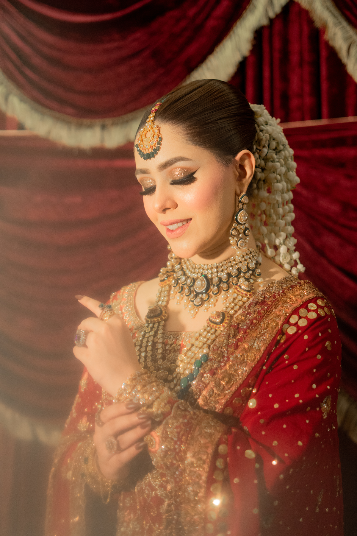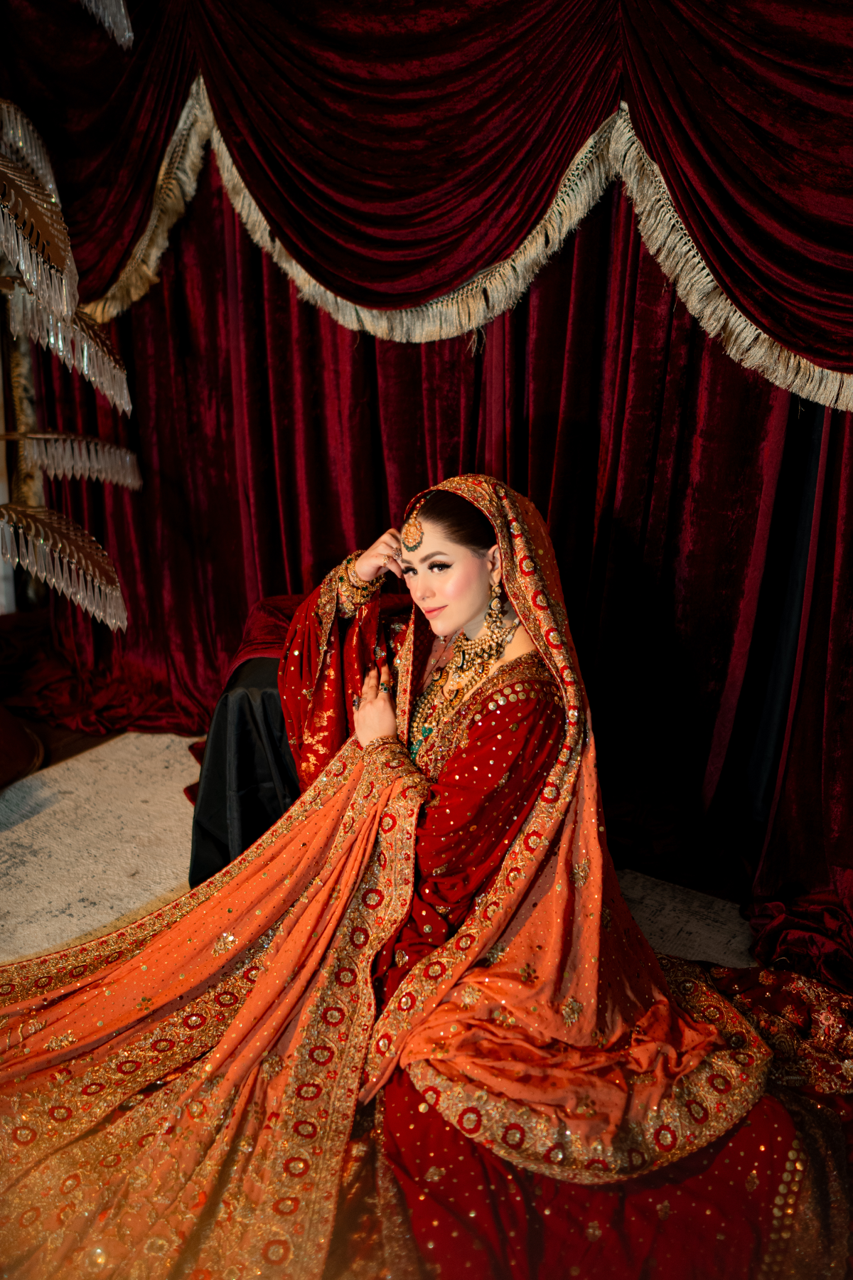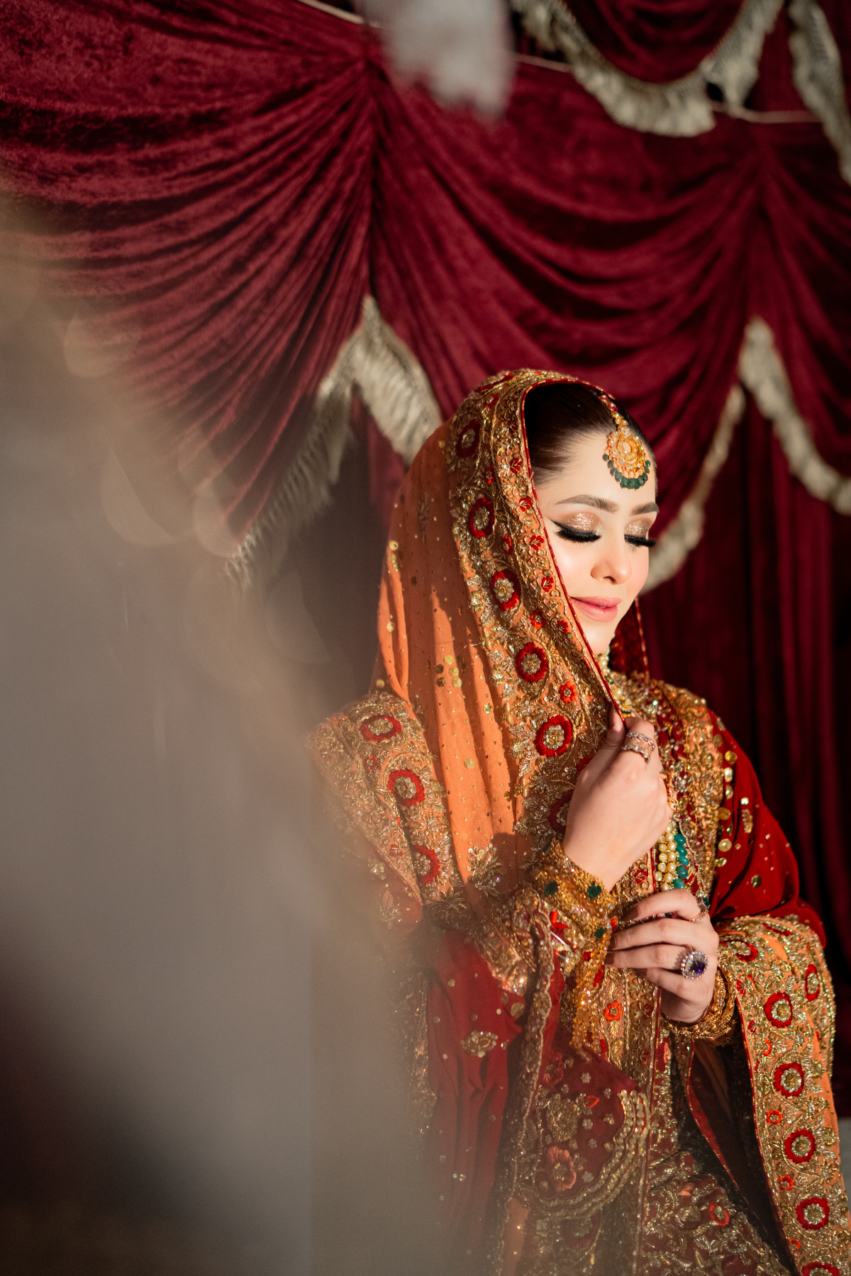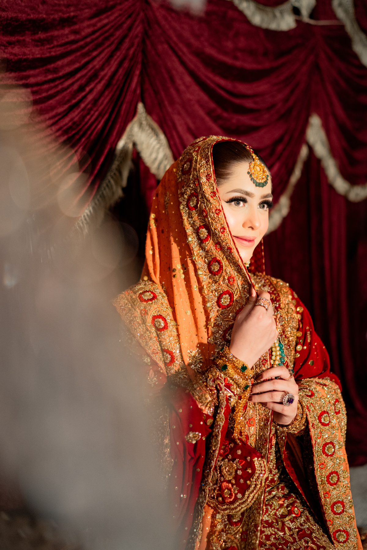 A light gold kalidar paired with a copper dupatta. This intricately handcrafted bridal kalidar is crafted with dabka, resham, kora, naqshi and sequins. Paired with a jamwar lehnga with handworked border.