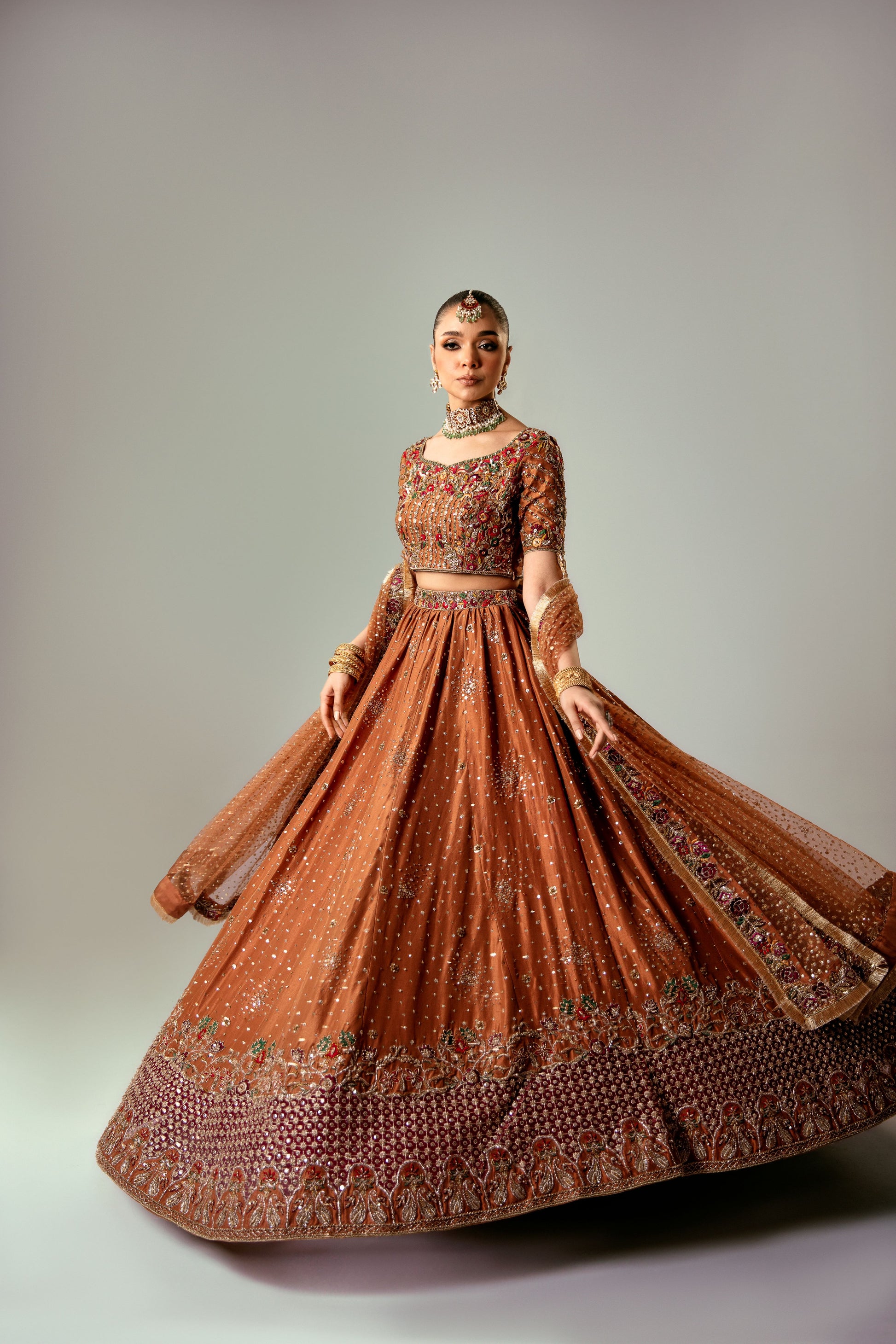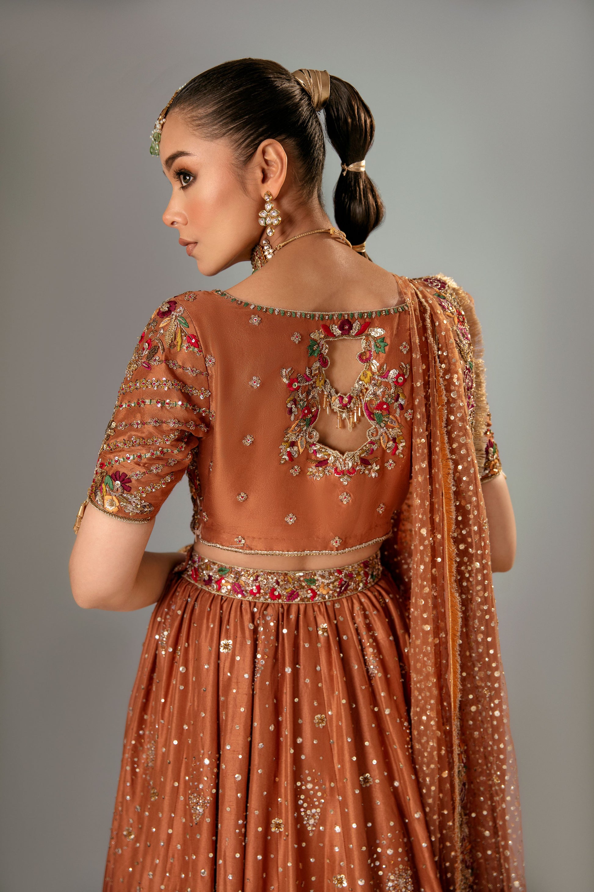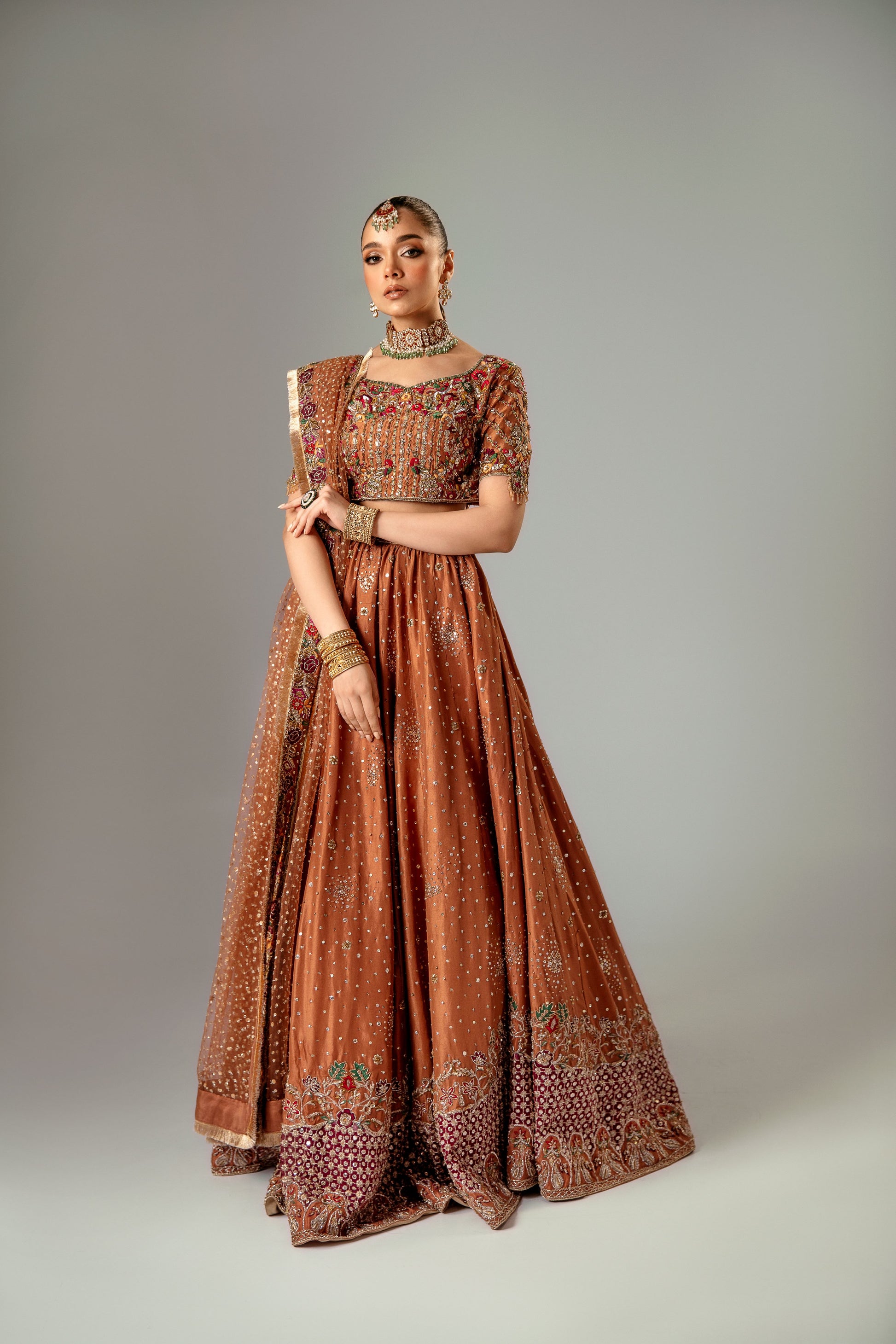 A beautiful brown raw silk lehnga choli with net dupatta. Heavily worked with resham and zardozi work and sequins.