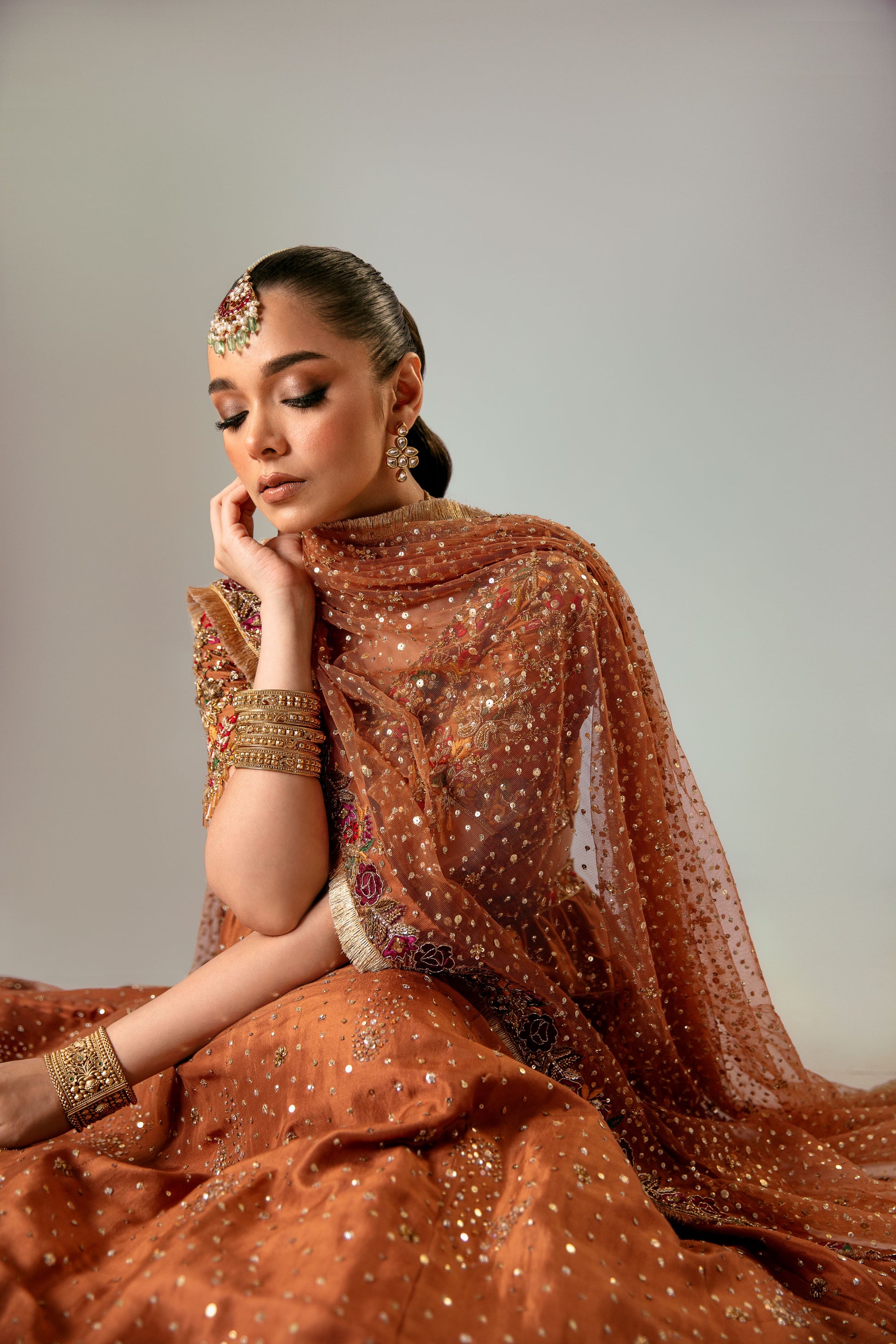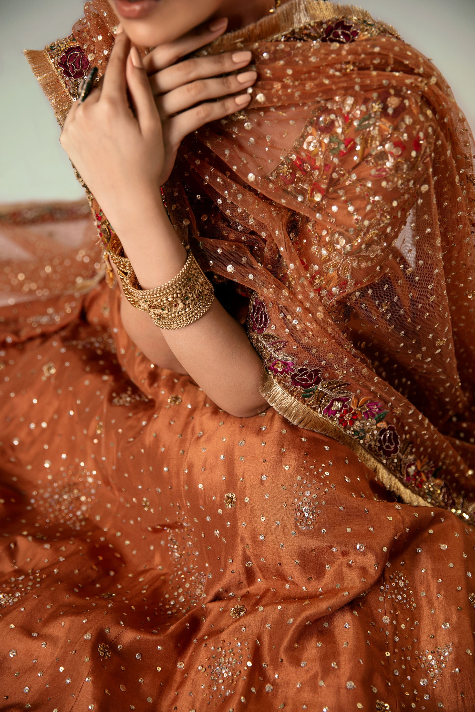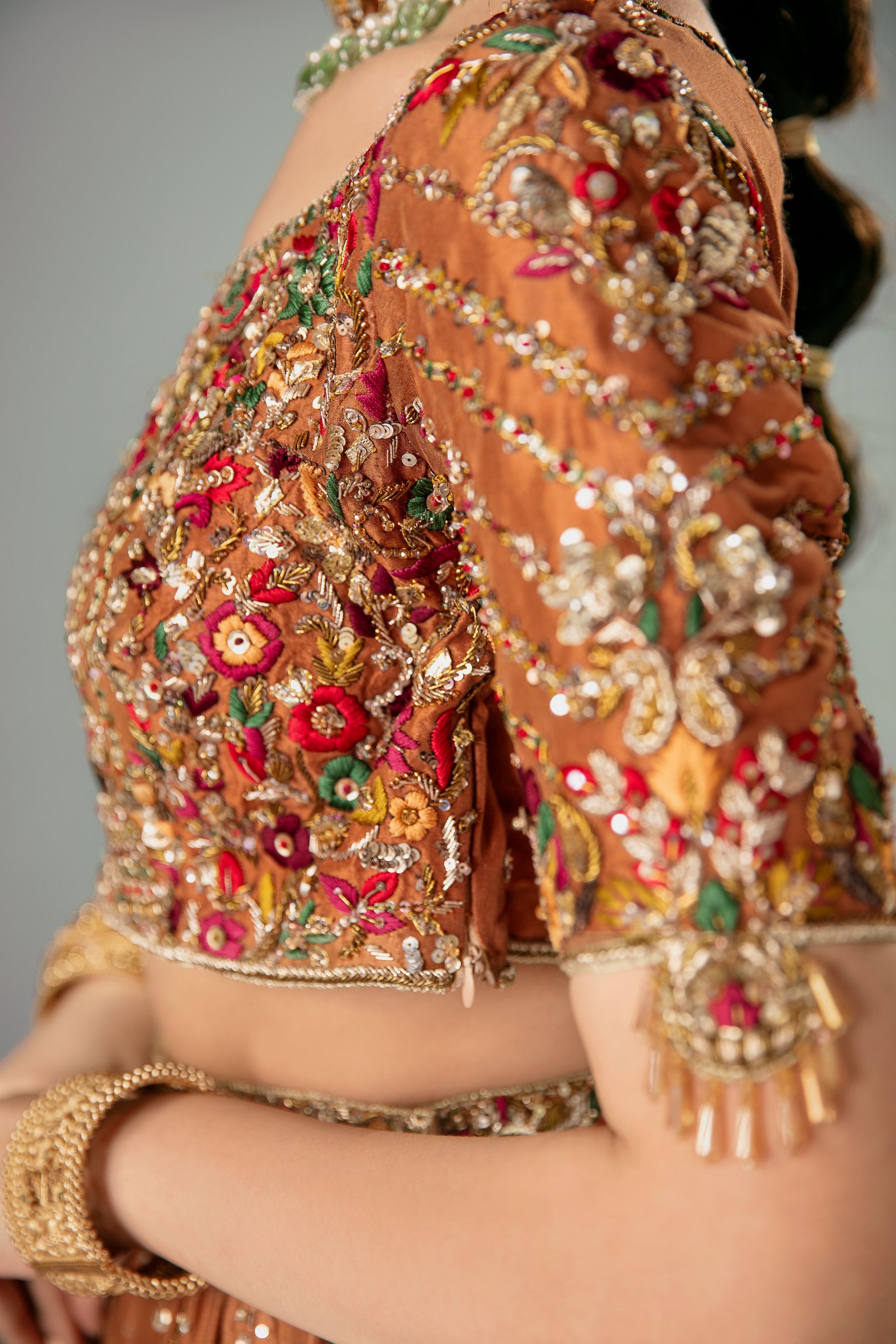 A beautiful brown raw silk lehnga choli with net dupatta. Heavily worked with resham and zardozi work and sequins.