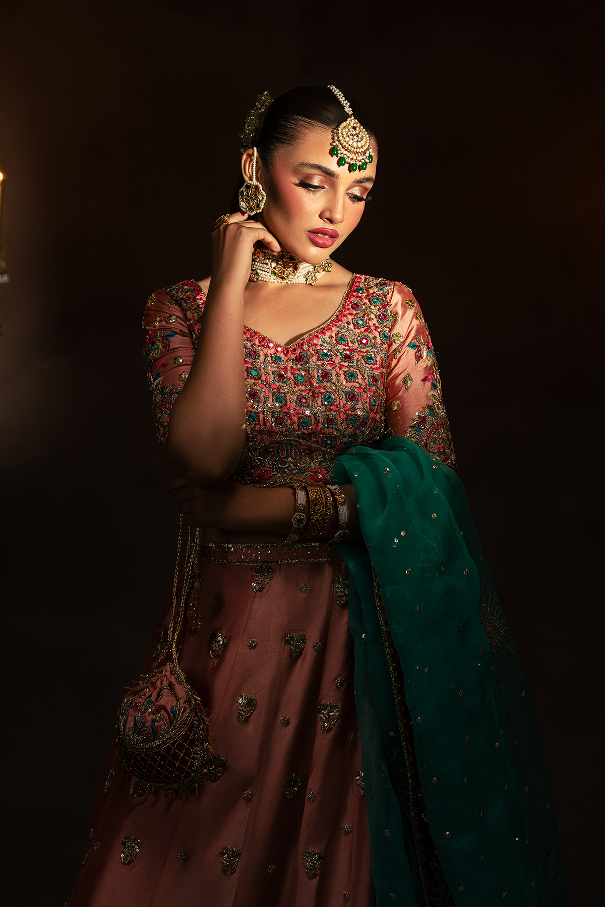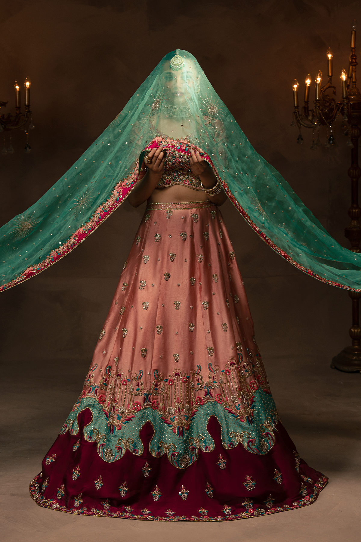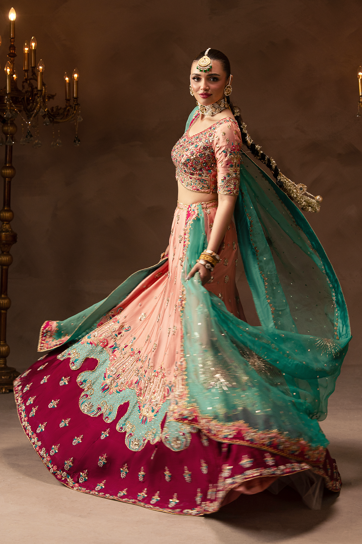 A peach lehnga choli embroidered with reshum, sheesha, gotta, dabka and sequins. An intricately crafted lehenga with magenta and teal color block paired with a teal organza dupatta with scattered embroidery all over and color aplique borders.