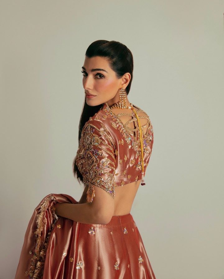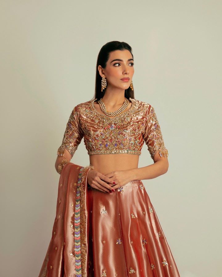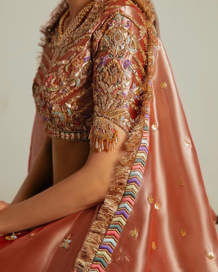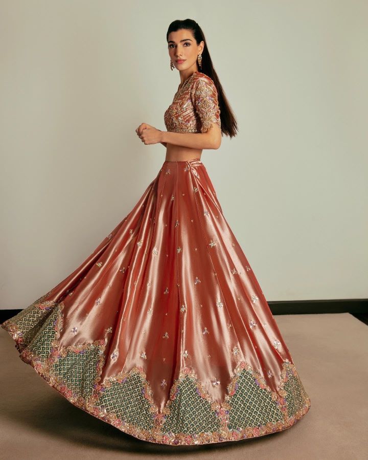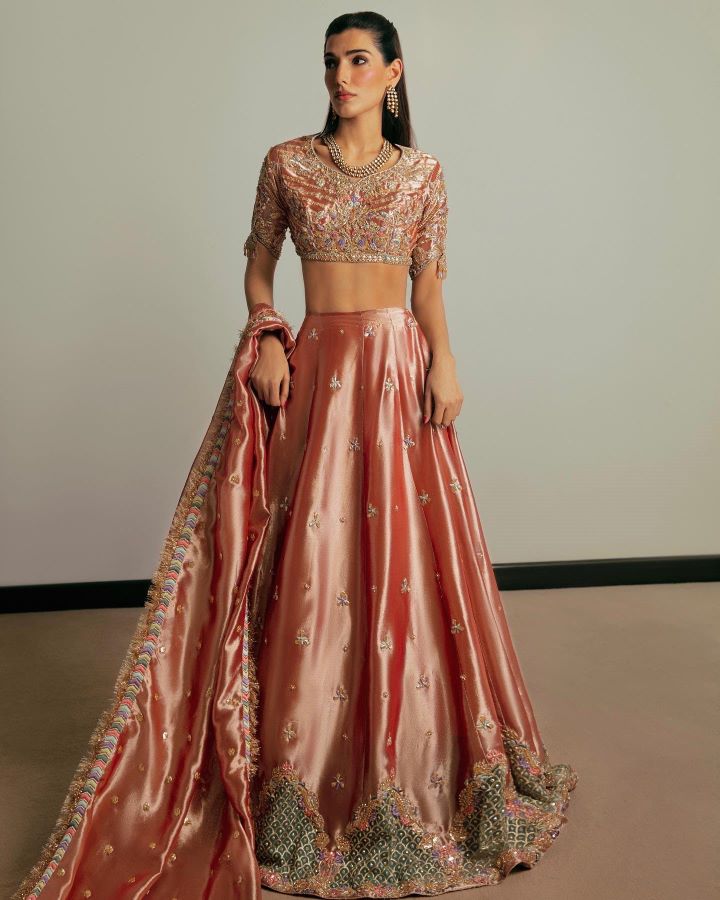 Lush tissue lehnga choli worked with gotta, muakaish, kora, dabka, naqshi, sequins and resham work.