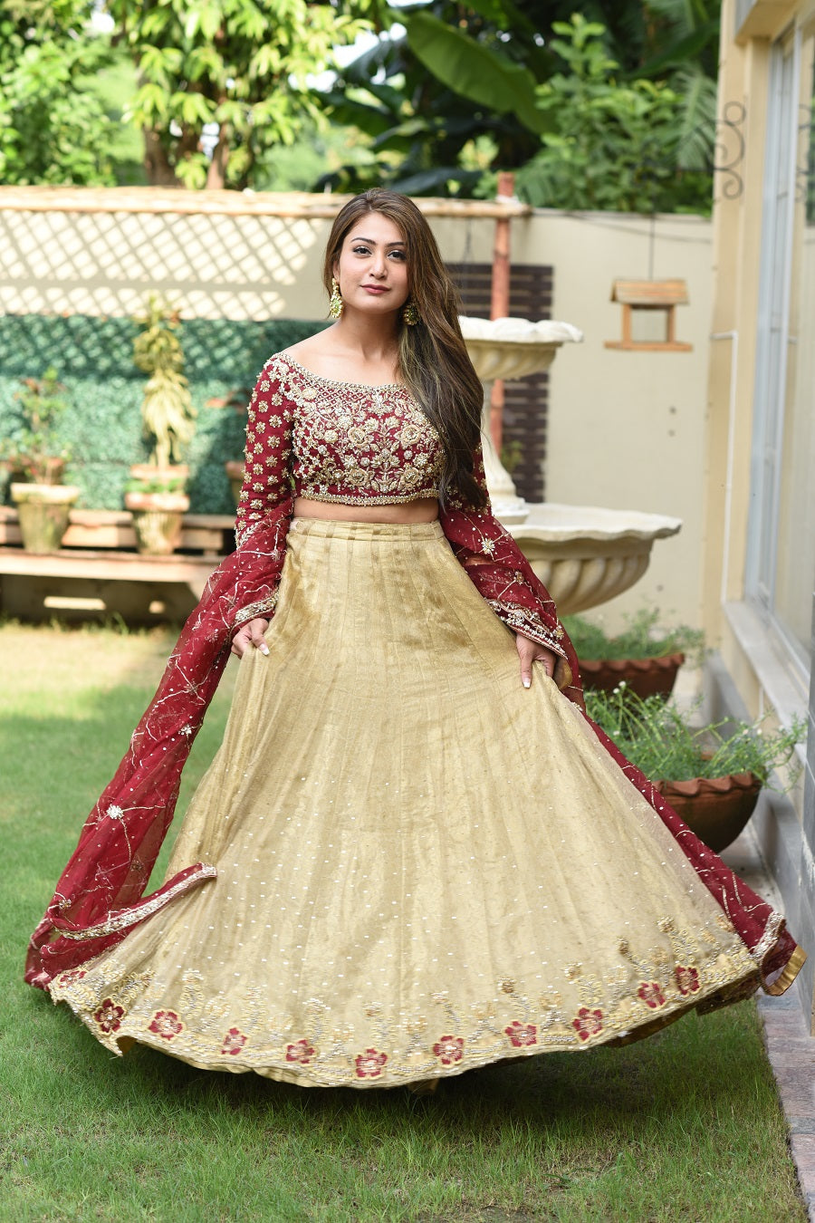 The choli is worked with dabka, naqshi, sequins and beads. Lehnga has a bordwe of tilla, dabka and maroon apliques flowers. Duppata is organza