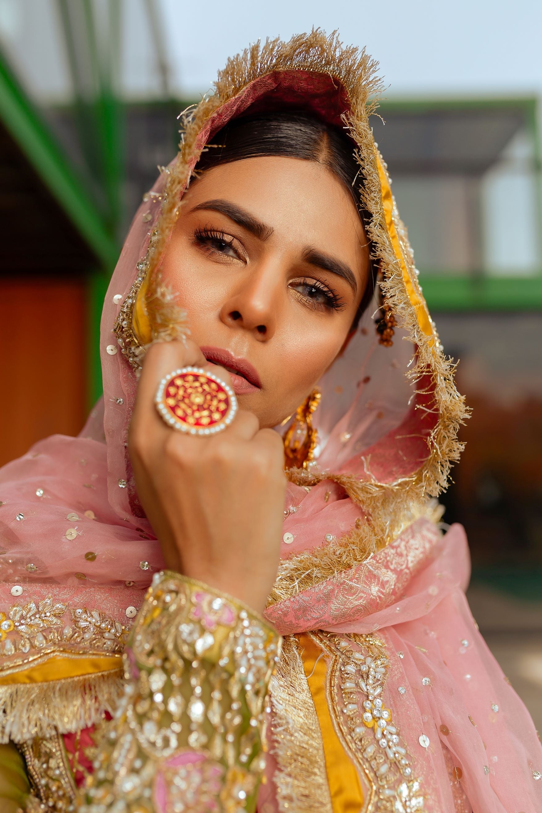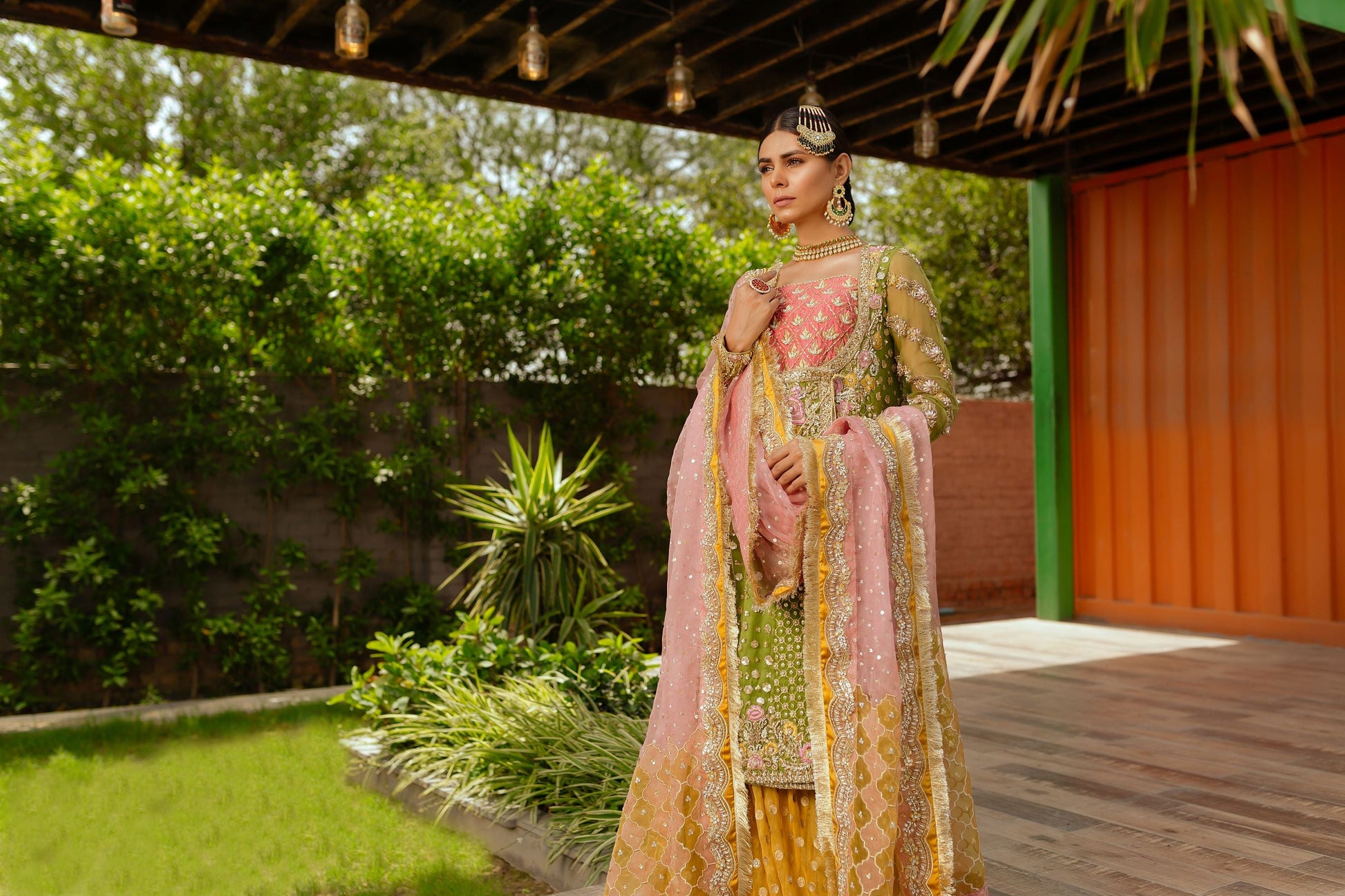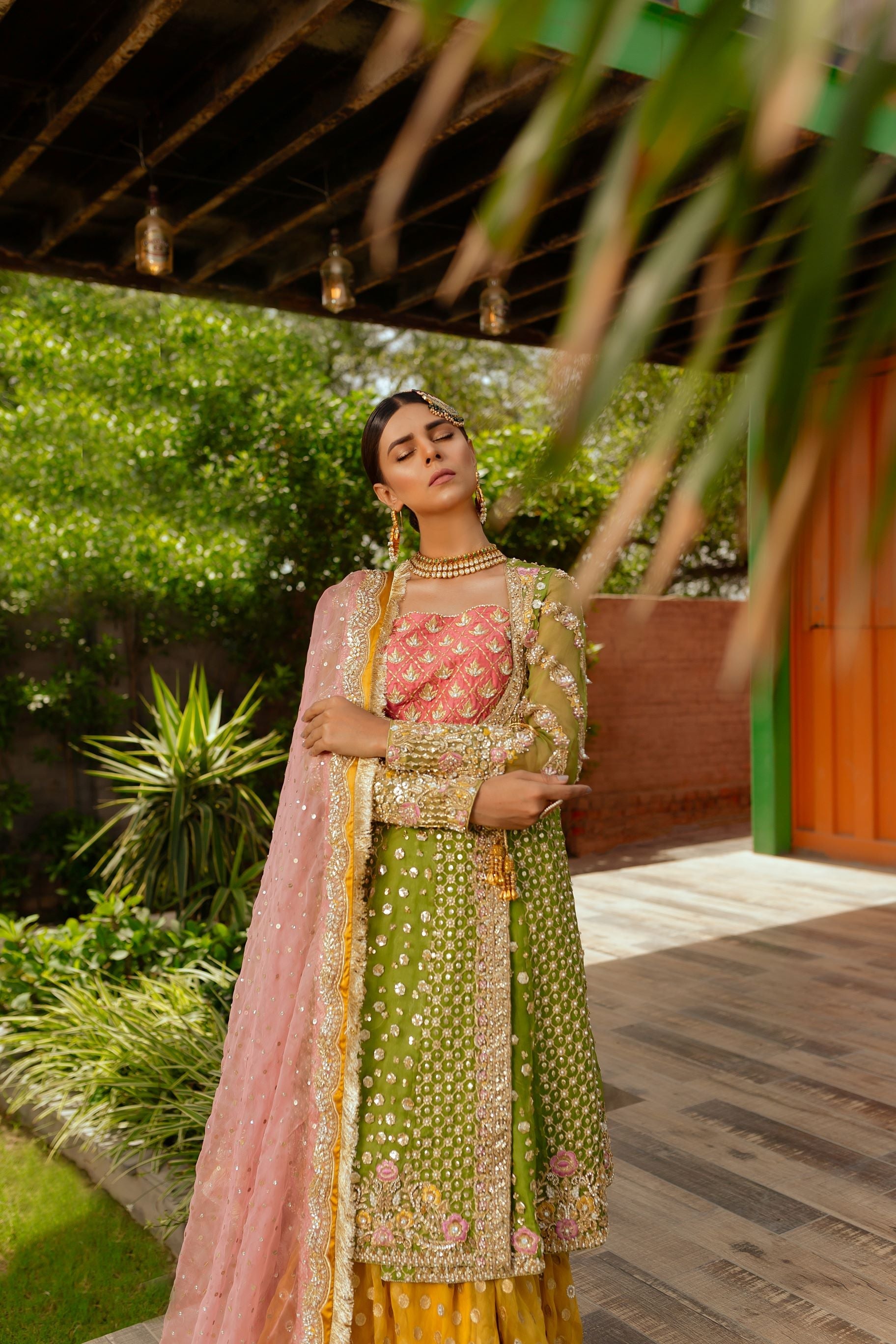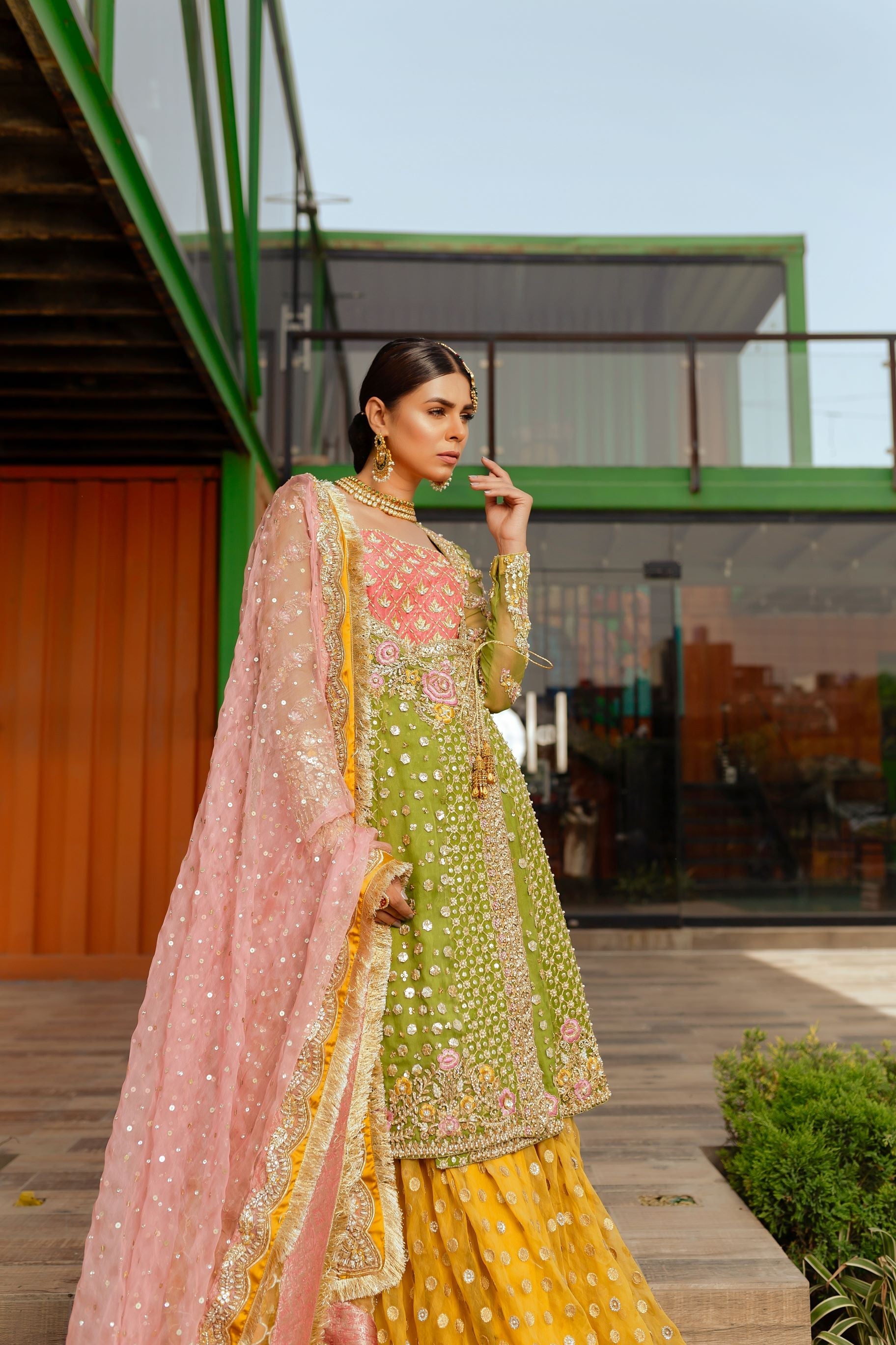 A dreamy confection of colors. An apple green short kaliar angrakha worked with kora, dabka, gota and pearl work etc. Pairedwith a gorgeous yellow embellished gharara with a zadozi border and overall tilla dots. This comes with a gorgeous chatta patti detailed dupatta with four sided hand emberiodered dupatta.