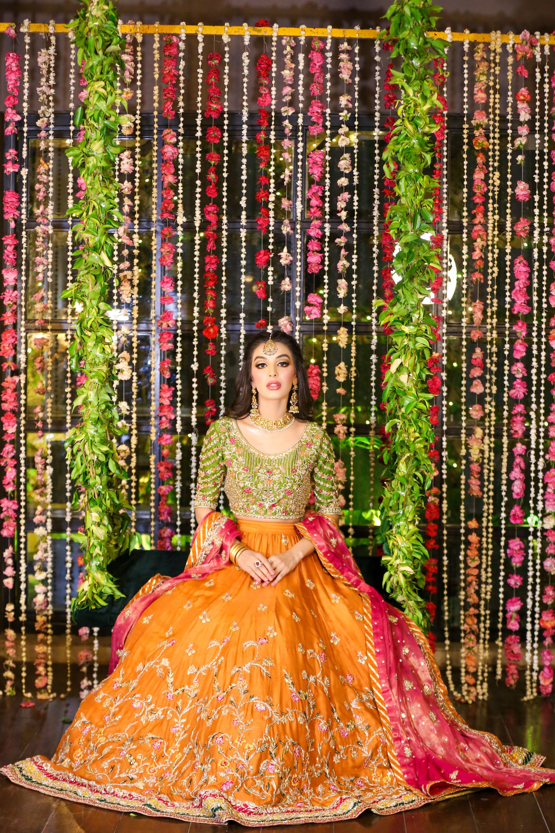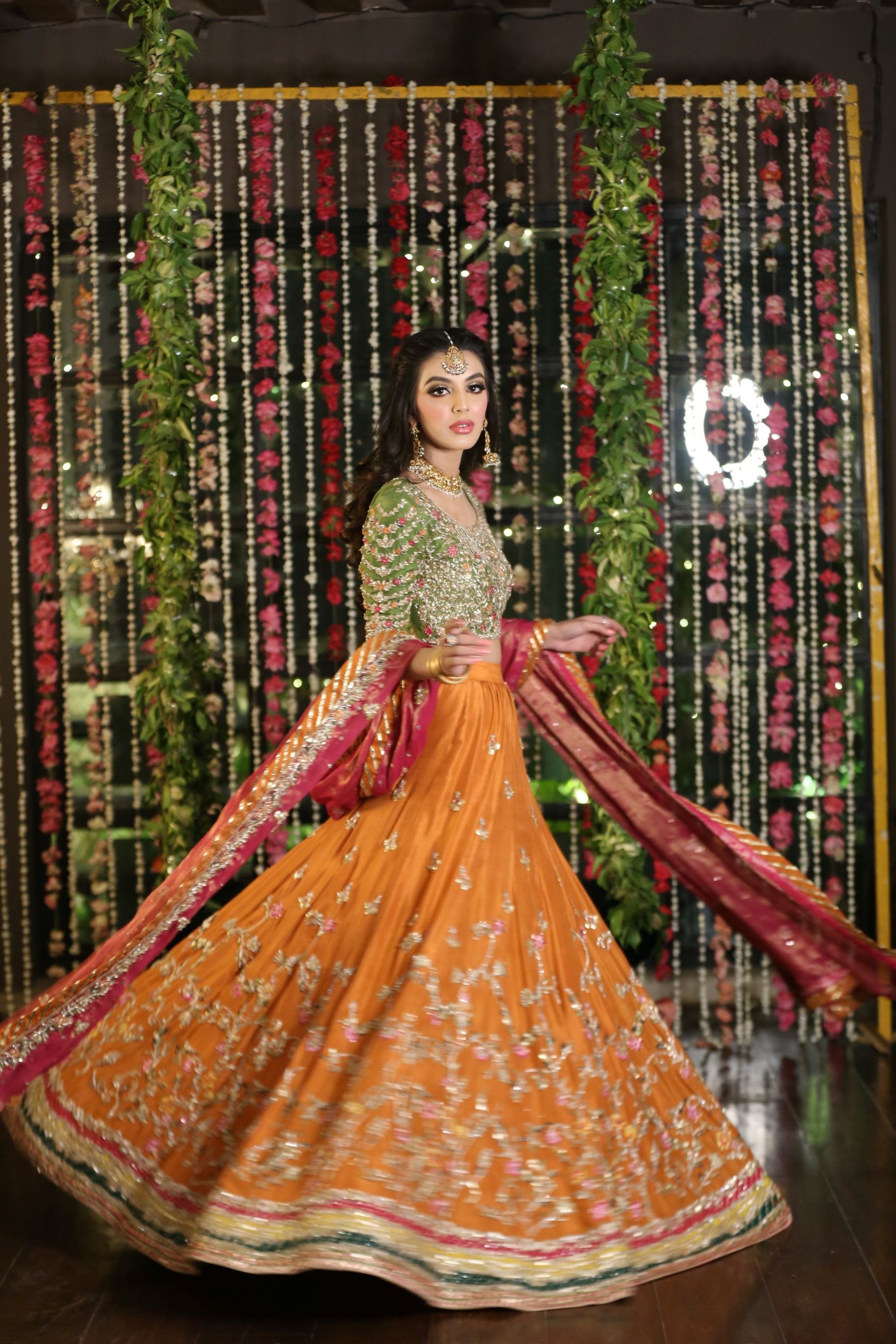 Three colored lehnga choli. The green choli paired with orange zardozi worked lehnga with chatta patti borders and a hot pink kundan zari dupatta.