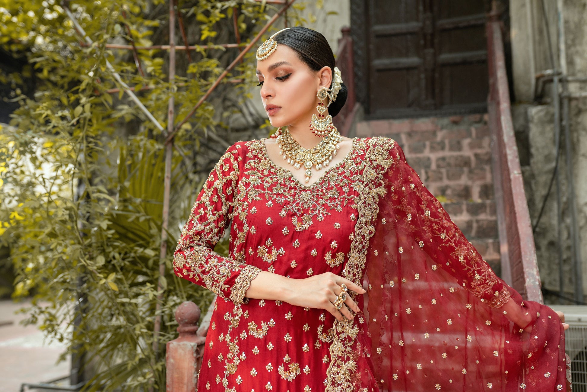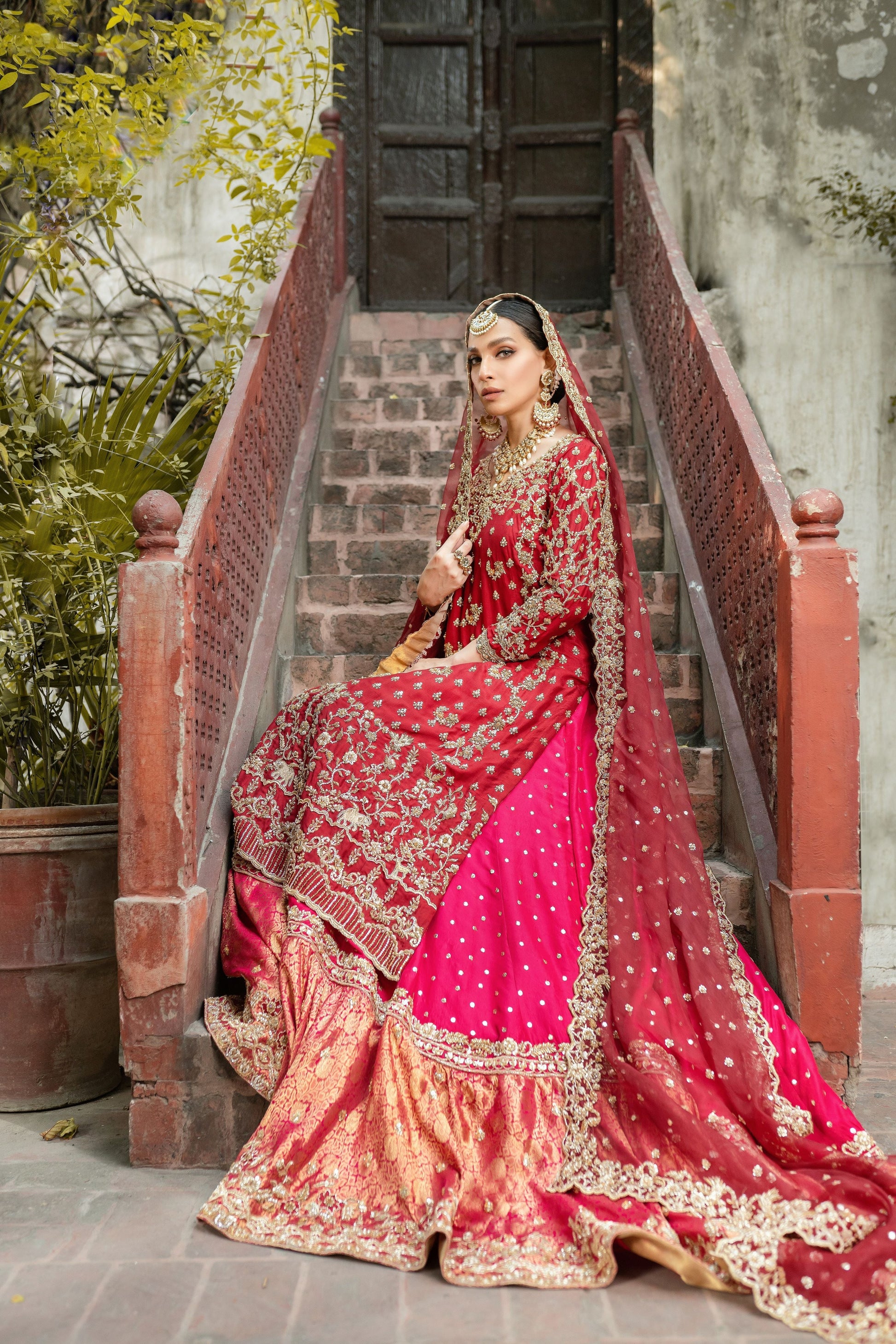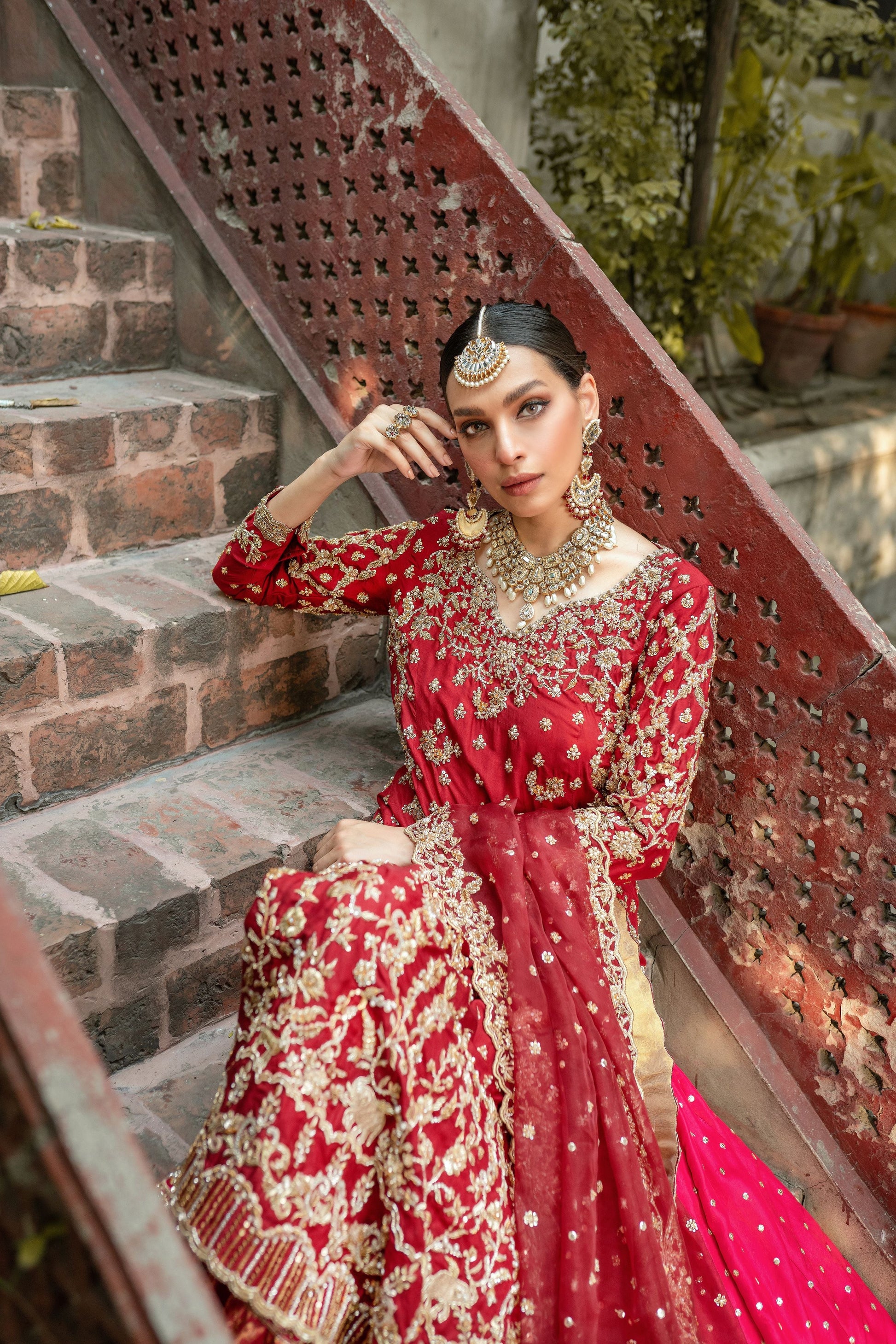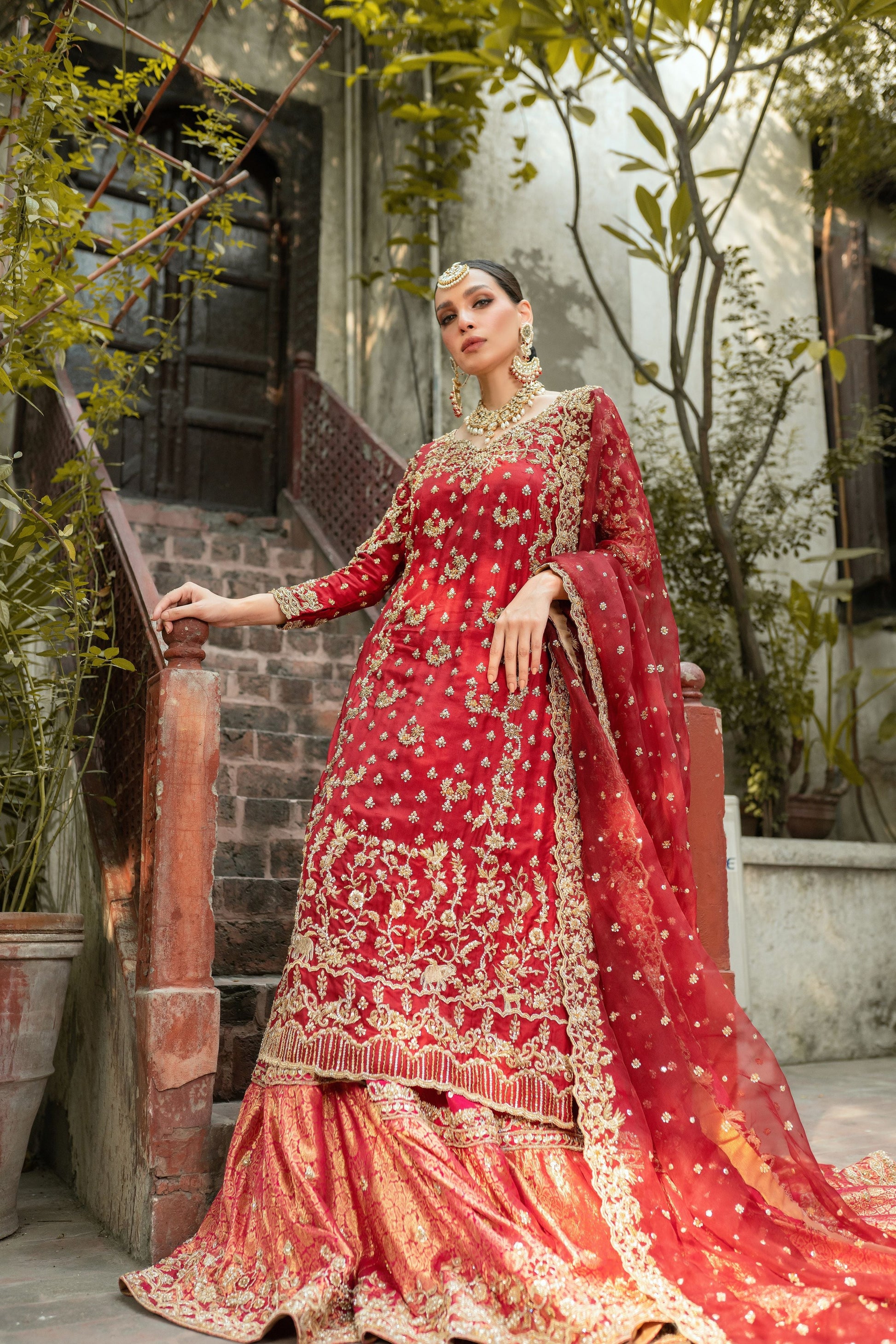 Classic red bridal consisting of crimson hues, rich kora, dabka work. An evergreen silhoutte a long kameez with farshi lehnga.