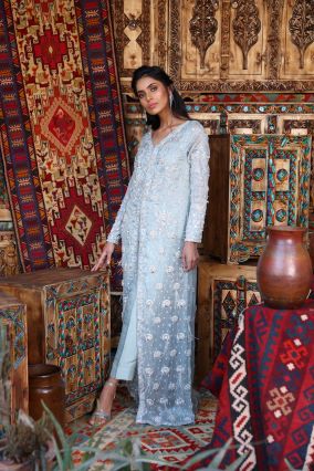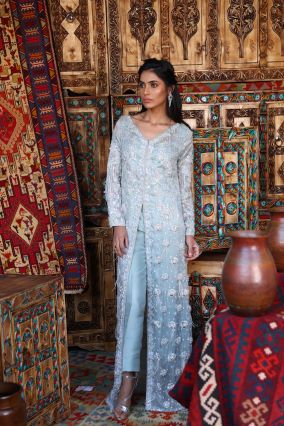 A front slit ice blue floor lehngth jacket worked with pearls, beads, dabka, sequins etc with feather detailing. It paired with raw silk undershirt and pants.