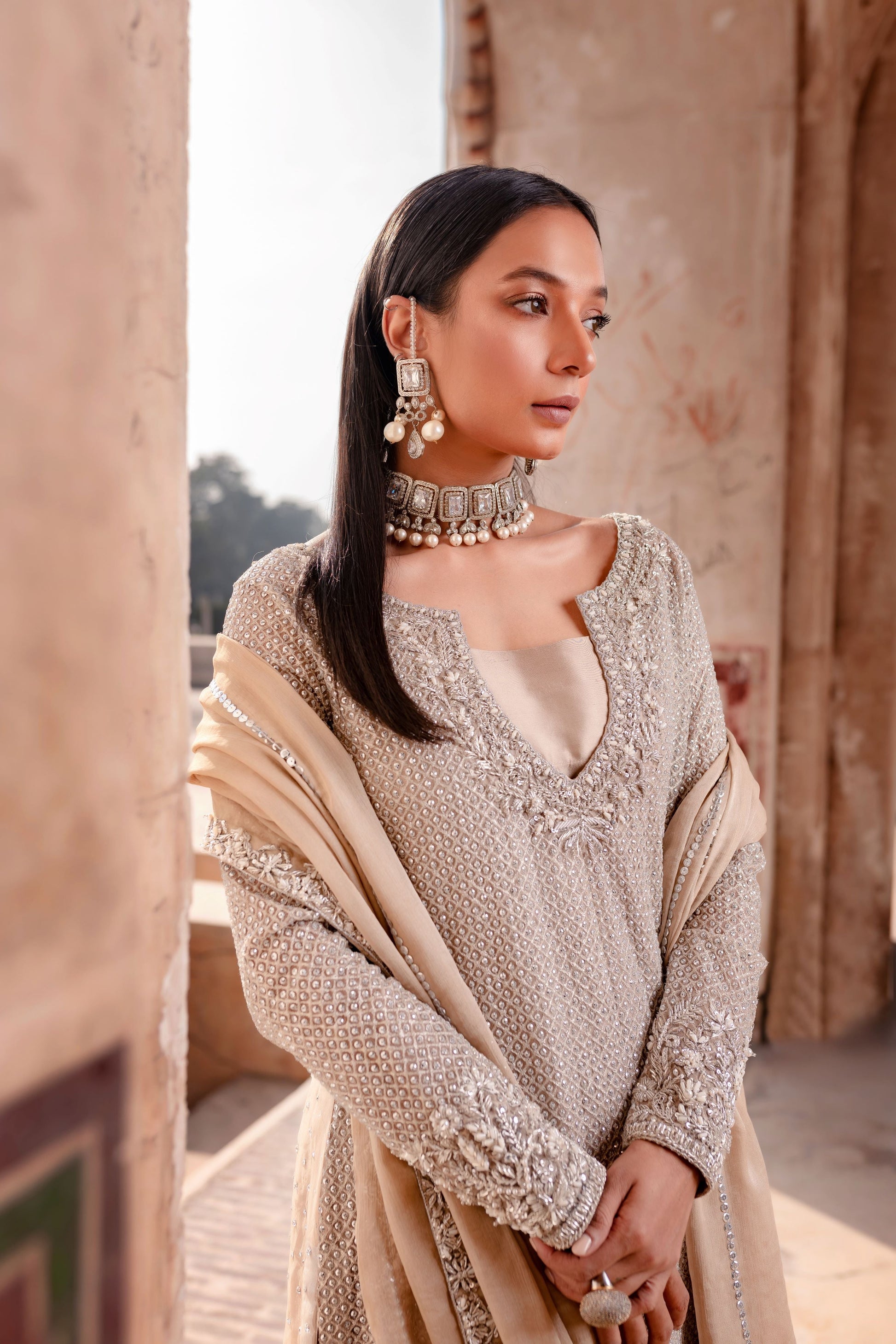 A classic silhoutte. Long straight shirt with azar pants. Silver work on a nude base worked with sitara, kora, dabka and crystal work. With a kundan zari dupatta with hand emberiodered border and sitara detail.
