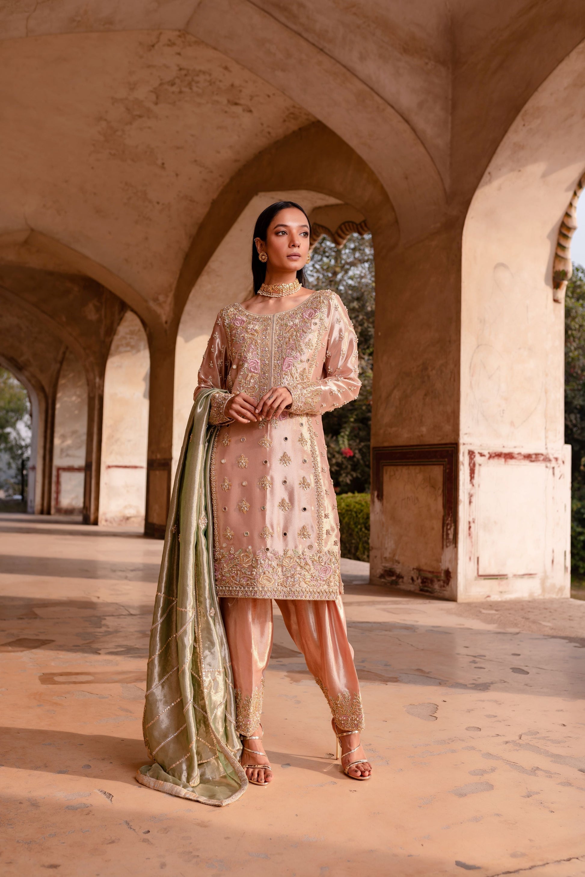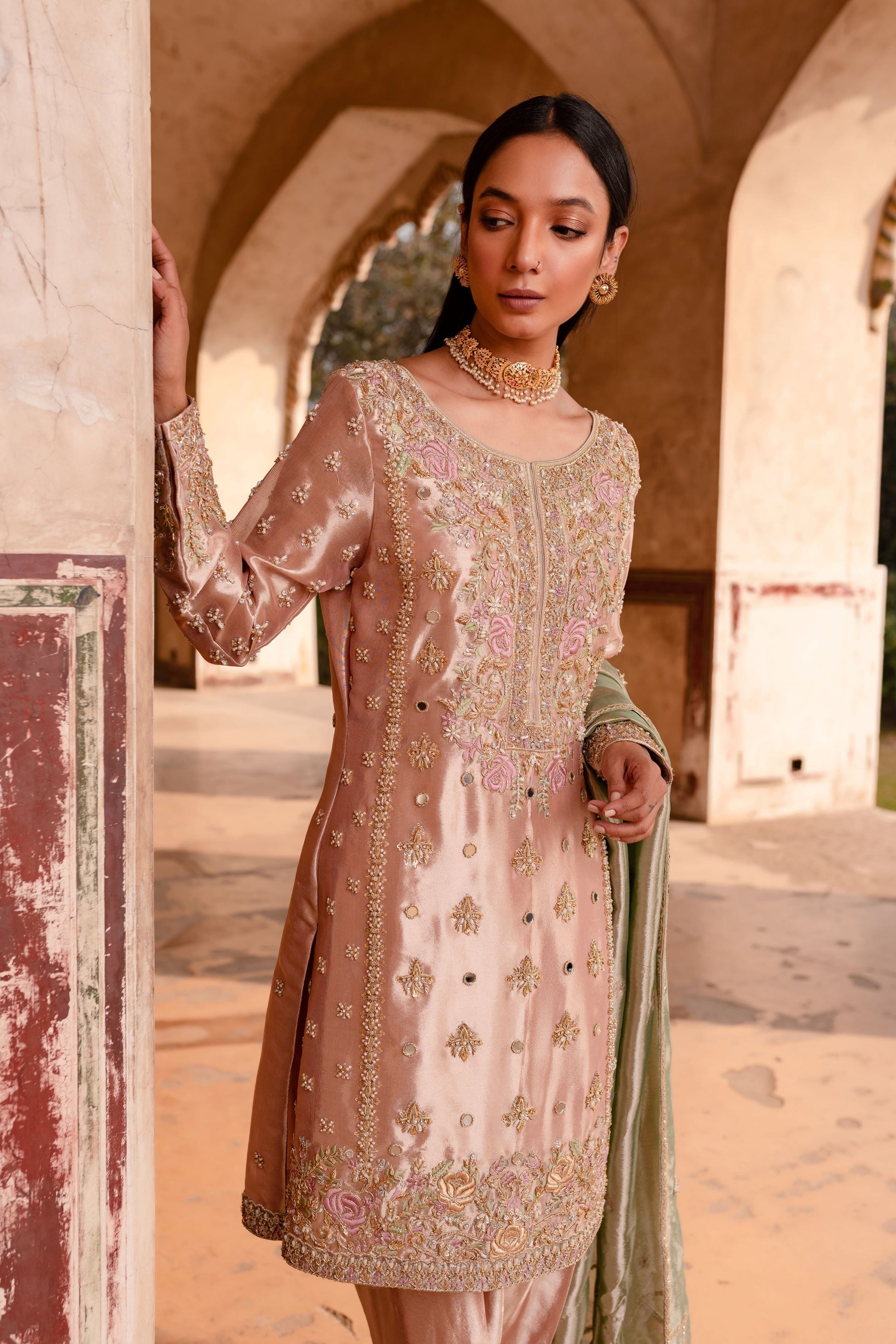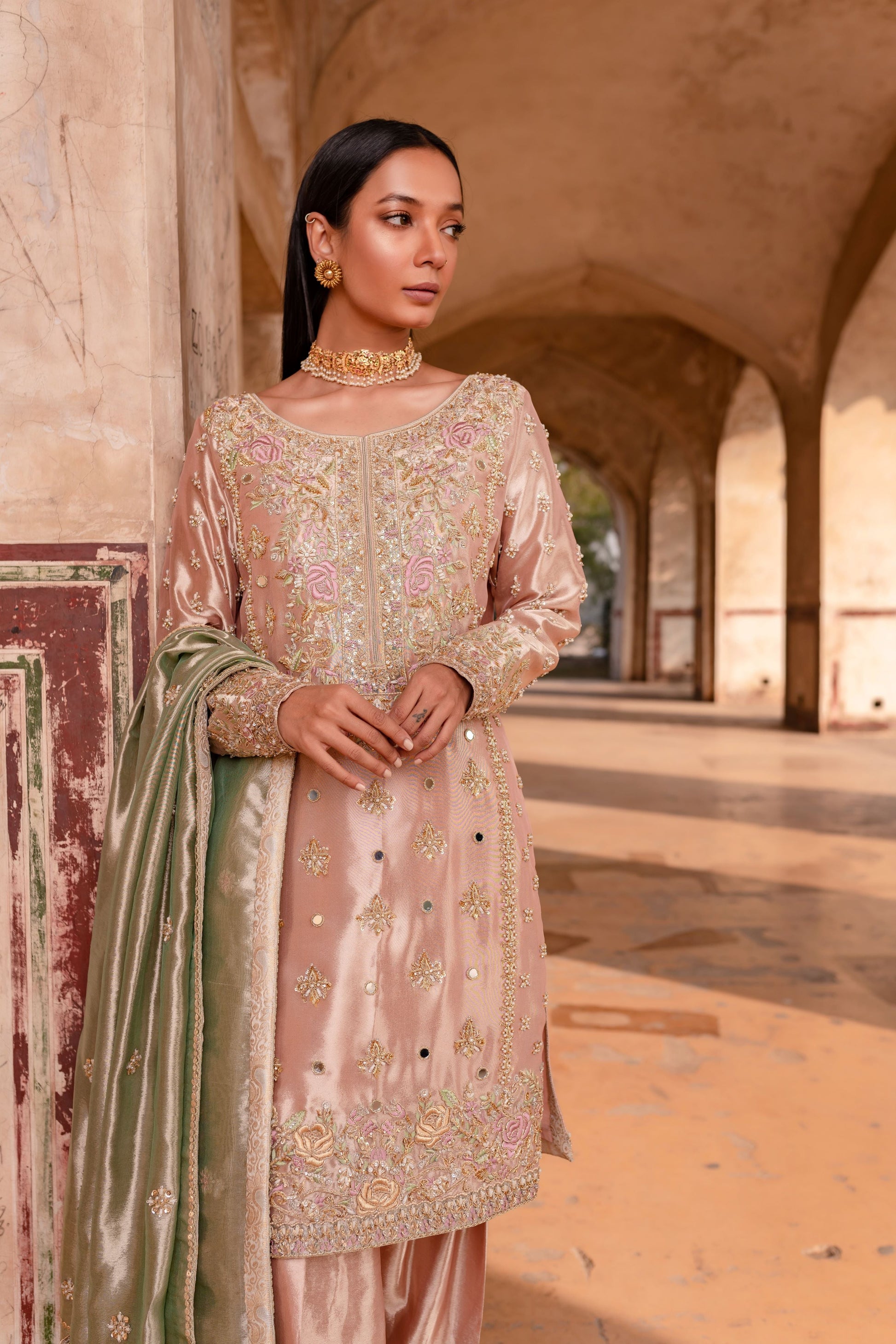 Gorgeous shalwar paired with a short shirt. Soft pink kameez worked with mirror, gota, dabka and naqshi. Paired with a pistachio green dupatta
