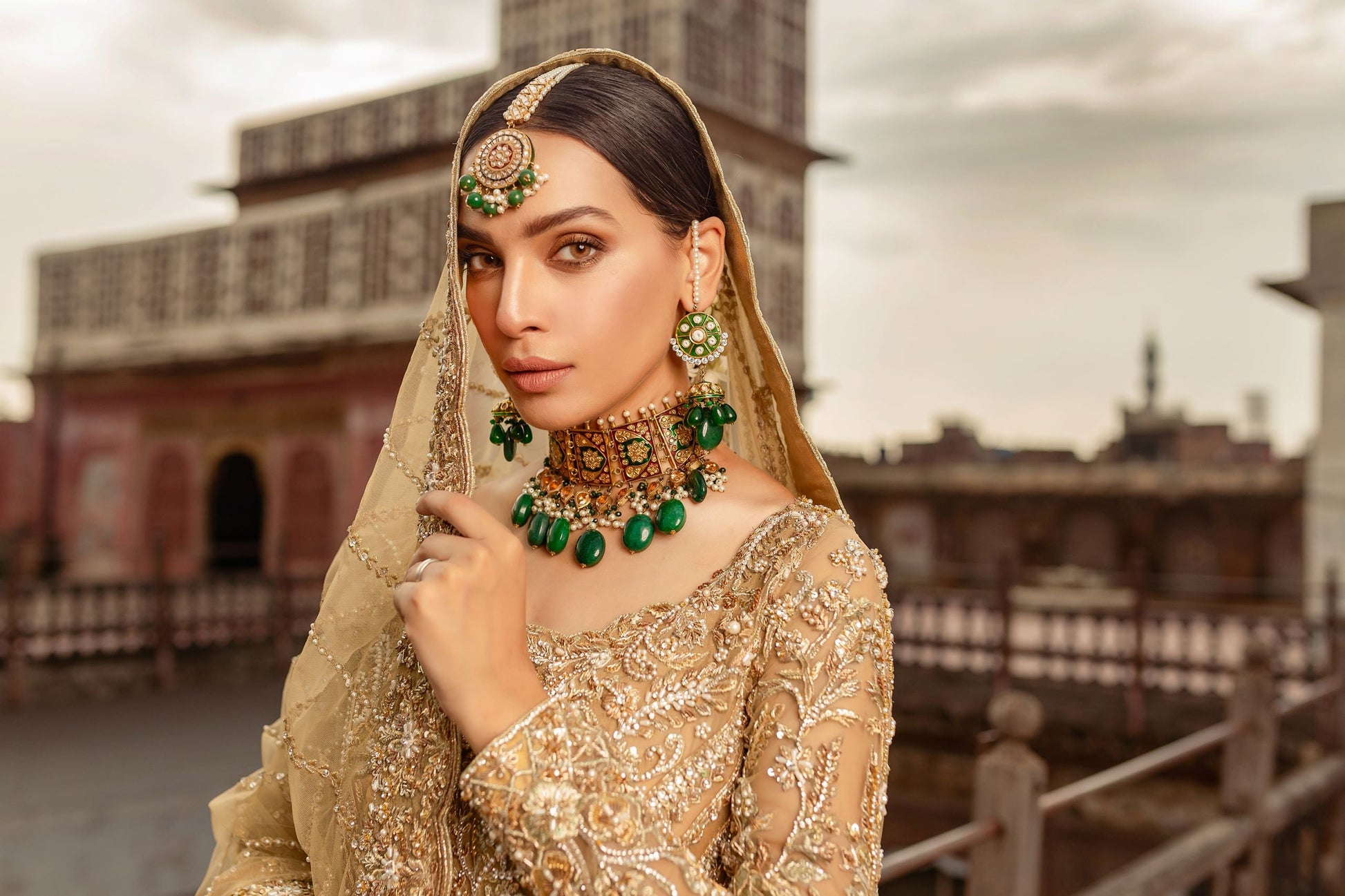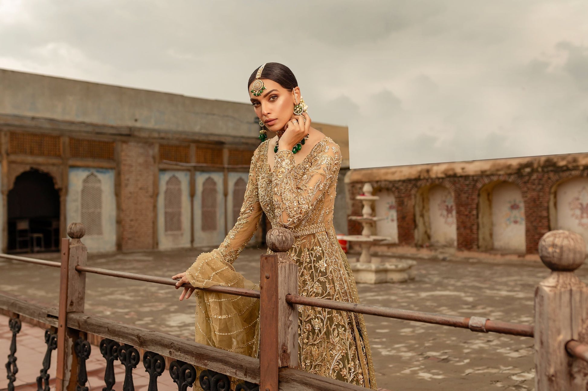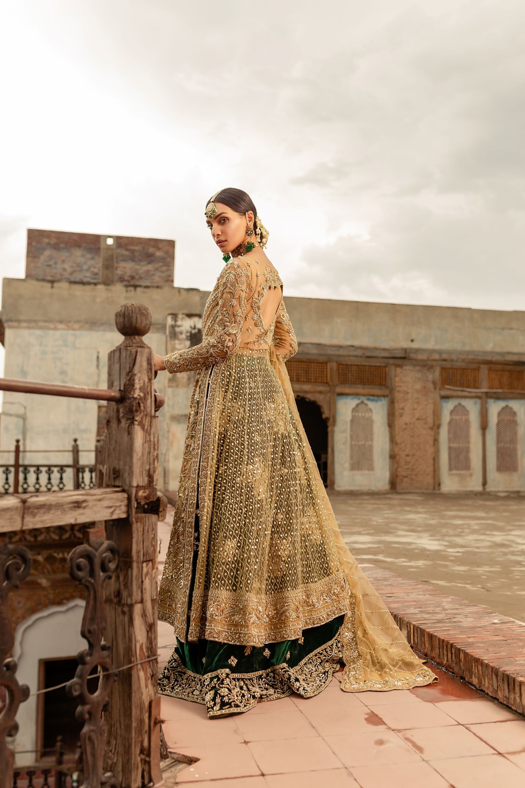 Gold kora dabka worked kalidar with an emerald green lehnga with delicate floral artistry.