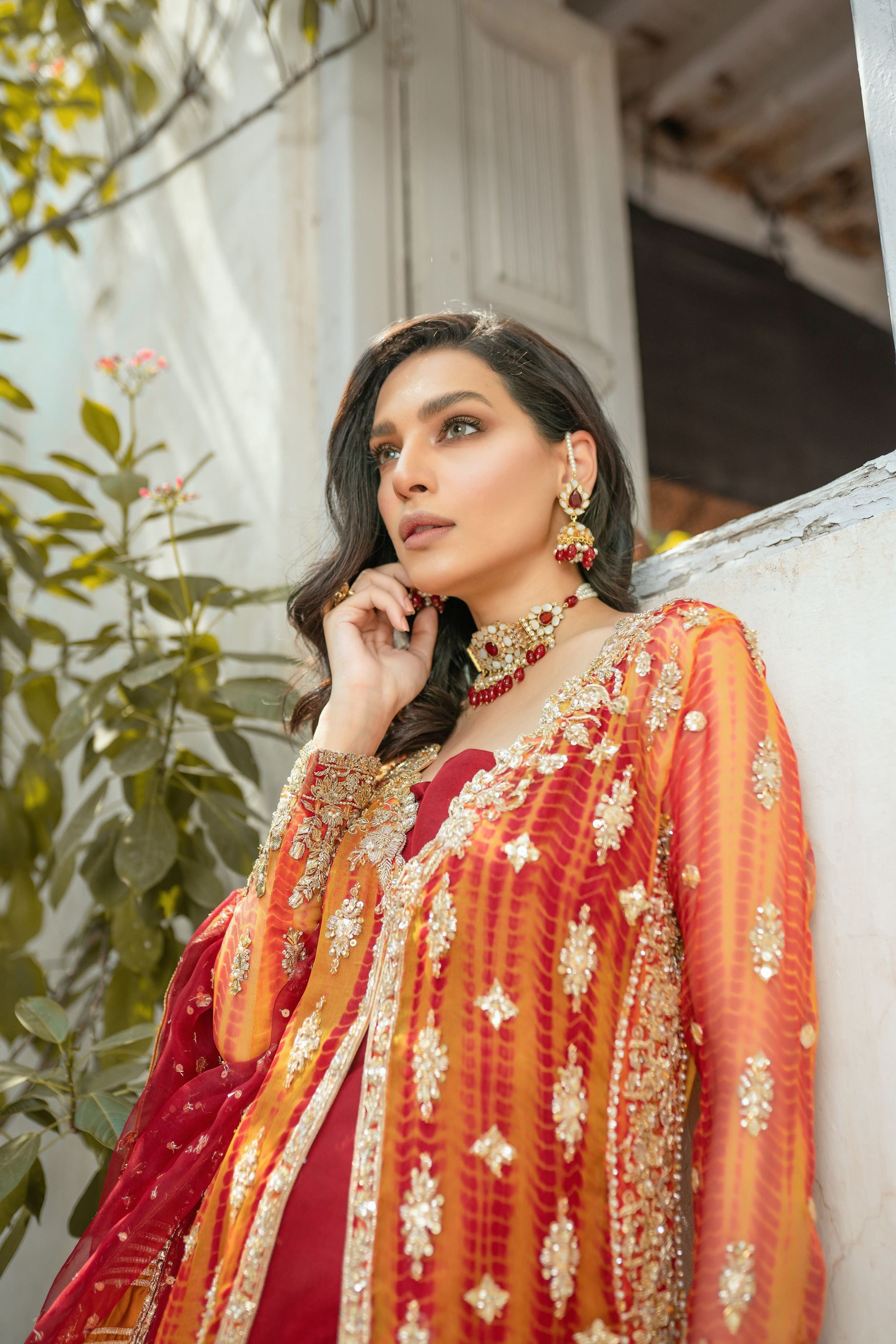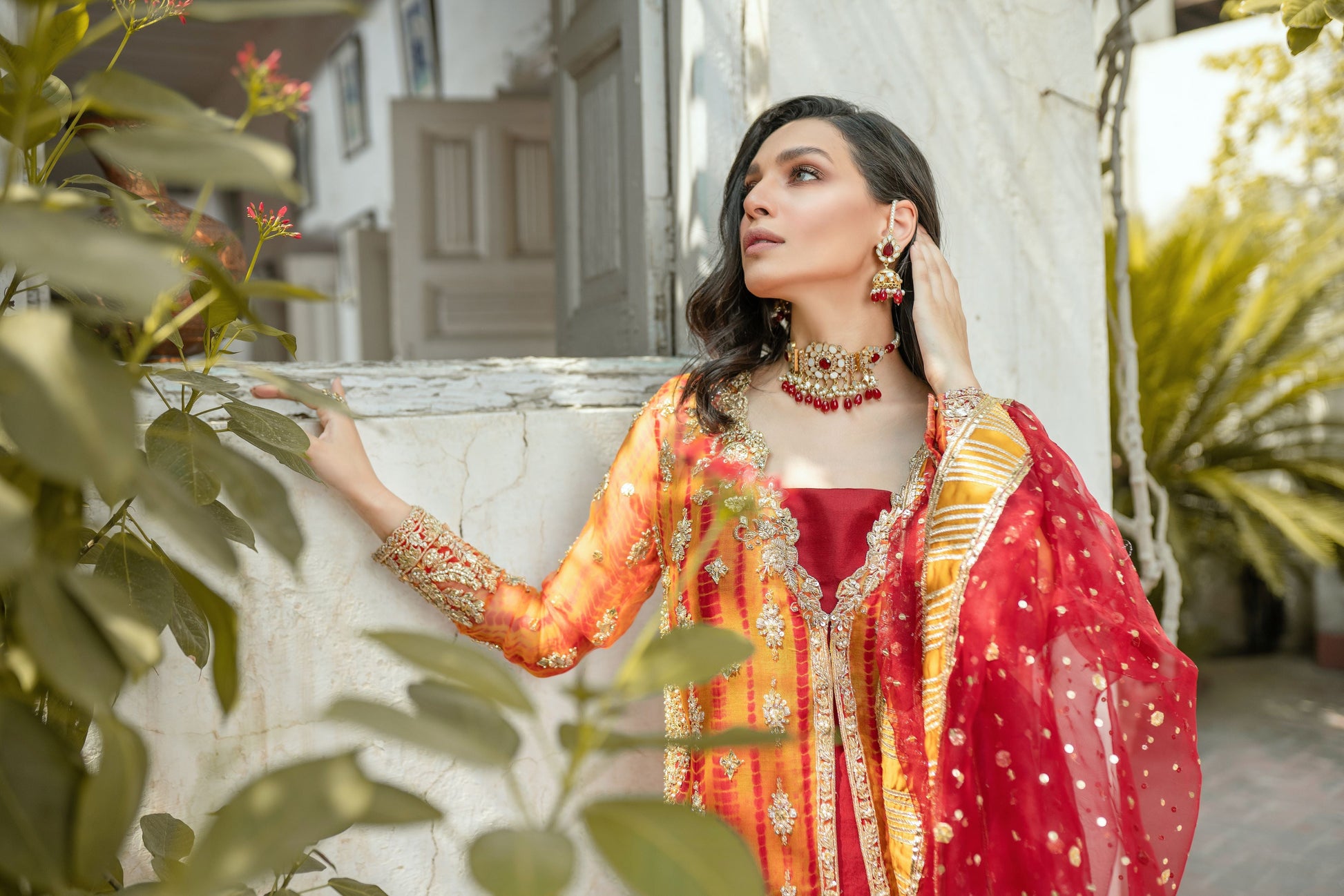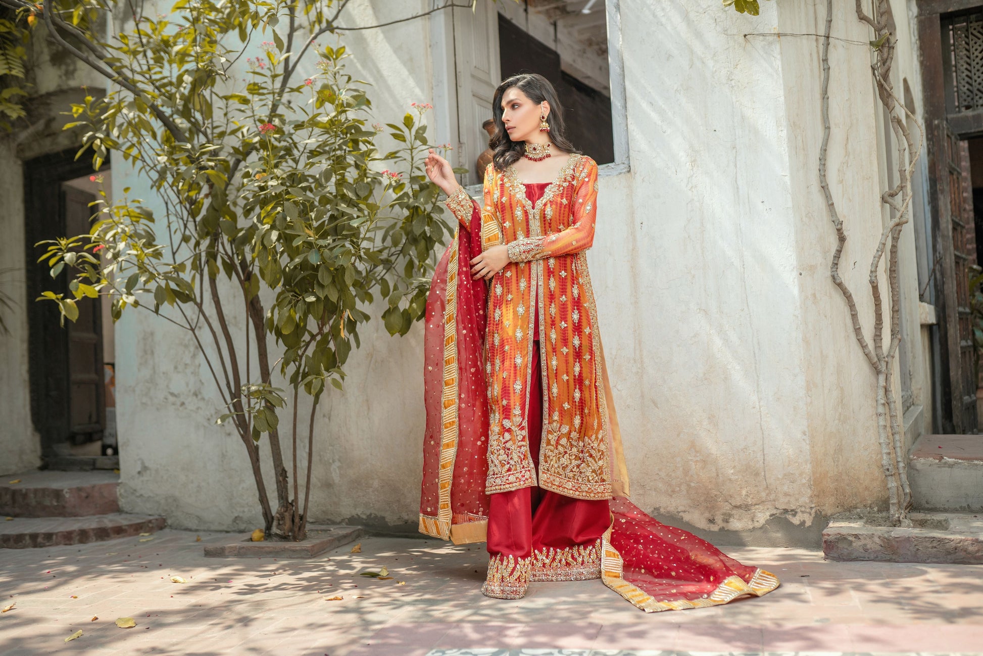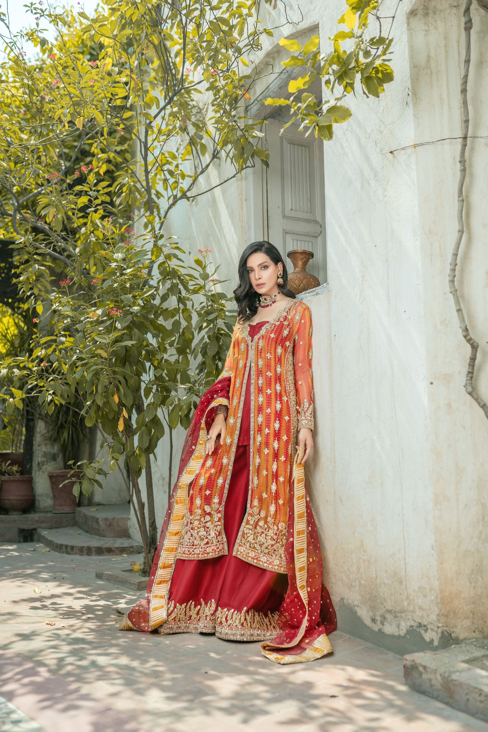 A front open jacket style shirt. Worked with gotta, dabka, zari, naqshi. Paired with lush red gotta dupatta and raw silk dhakka pants with worked borders.