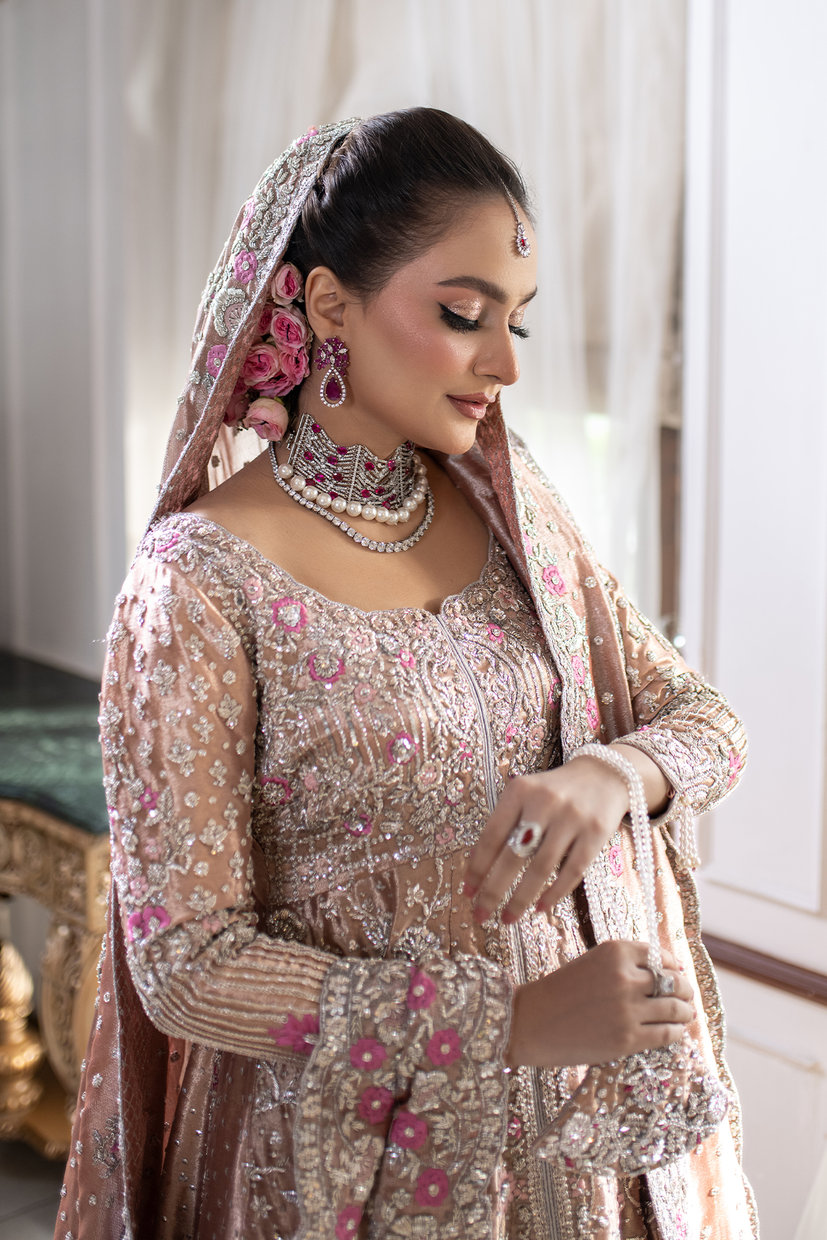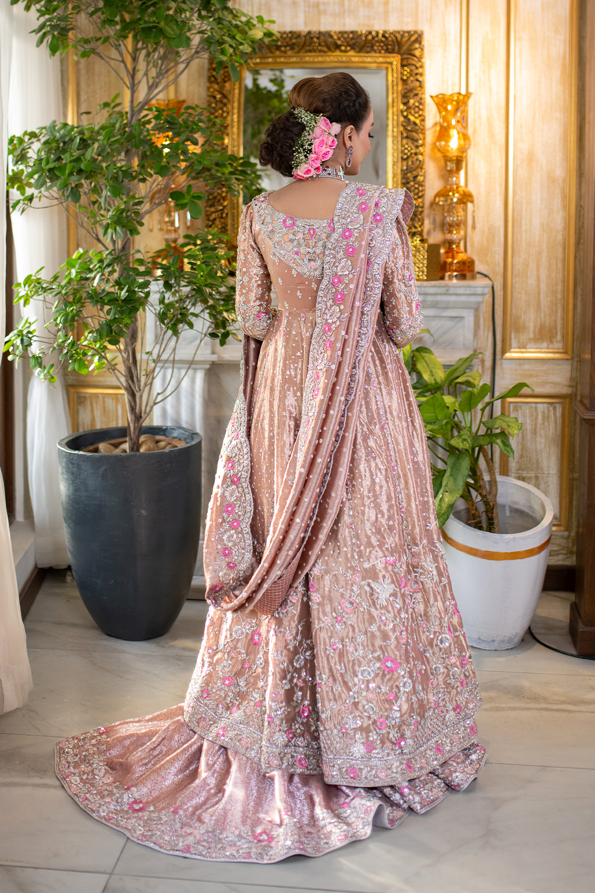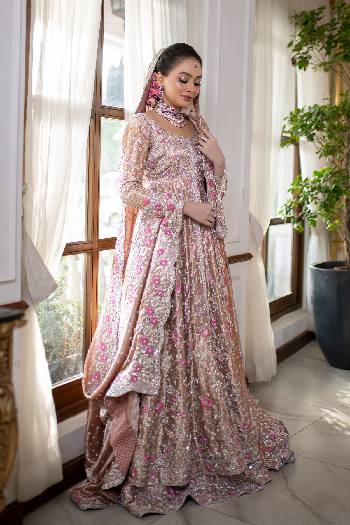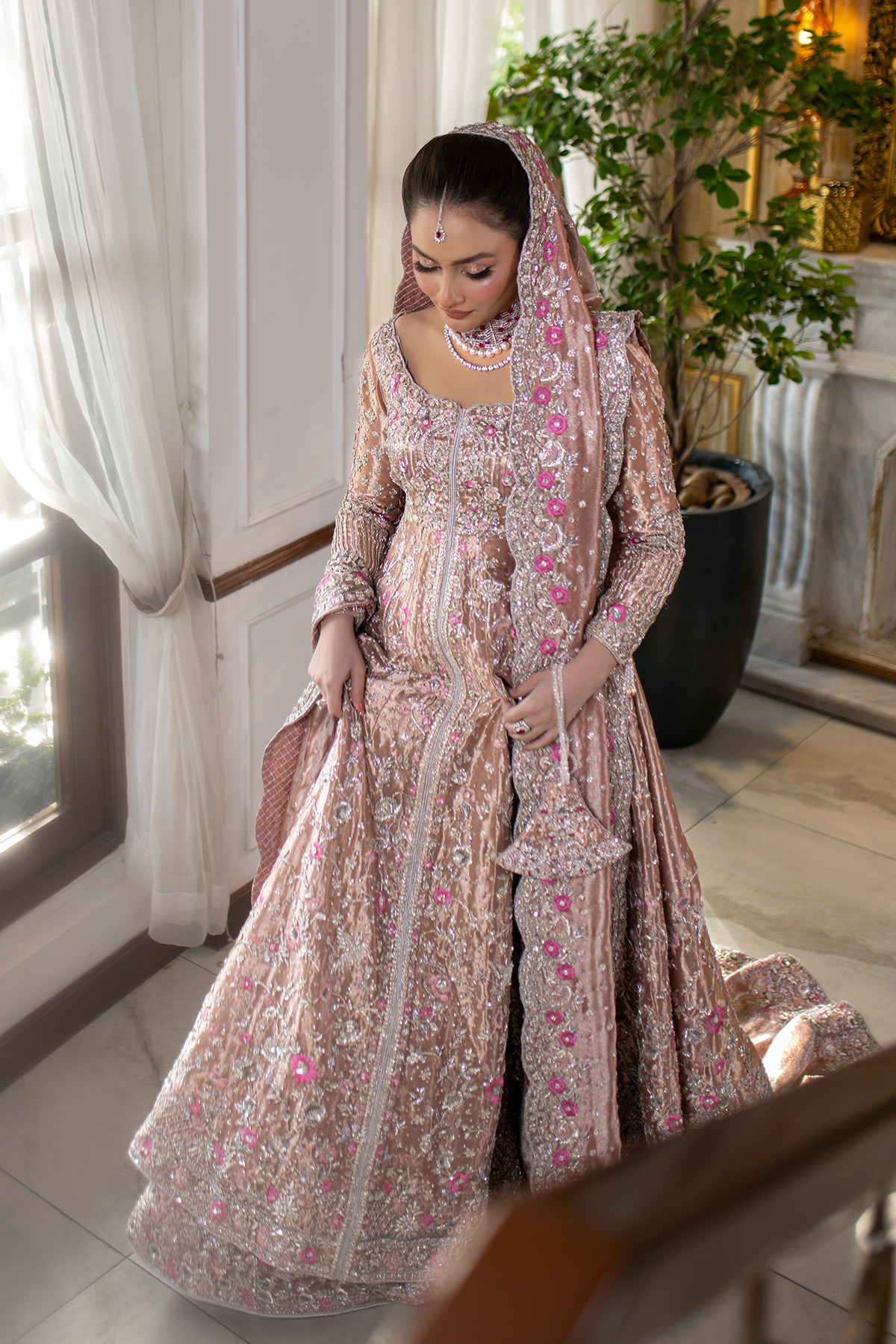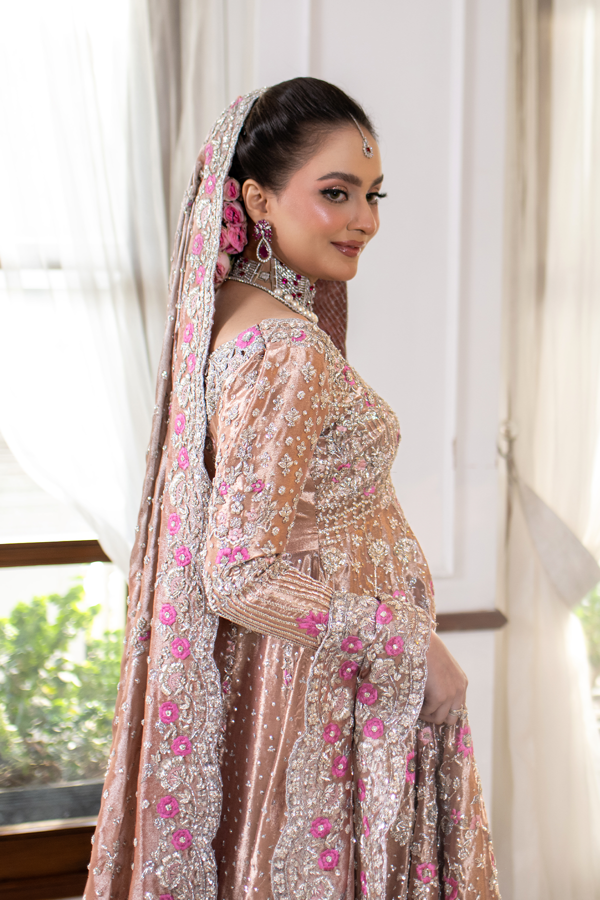 This cherry blossom pink gown has a lush pure lamé base and is worked with high-quality dabka, kora, sequins, beads, swarovski using traditional craftsmanship. Paired with a jamwar farshi and lameh duppata.