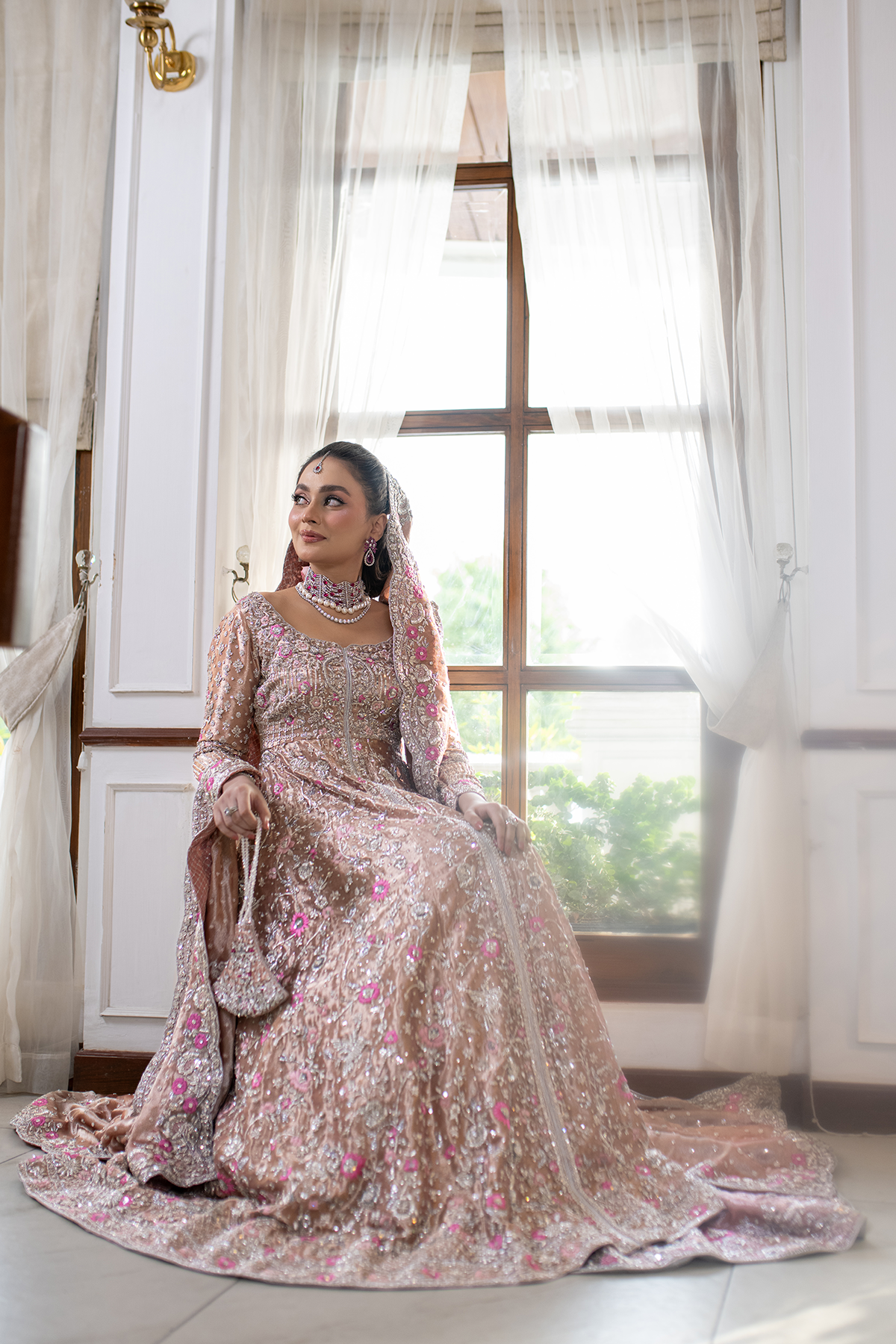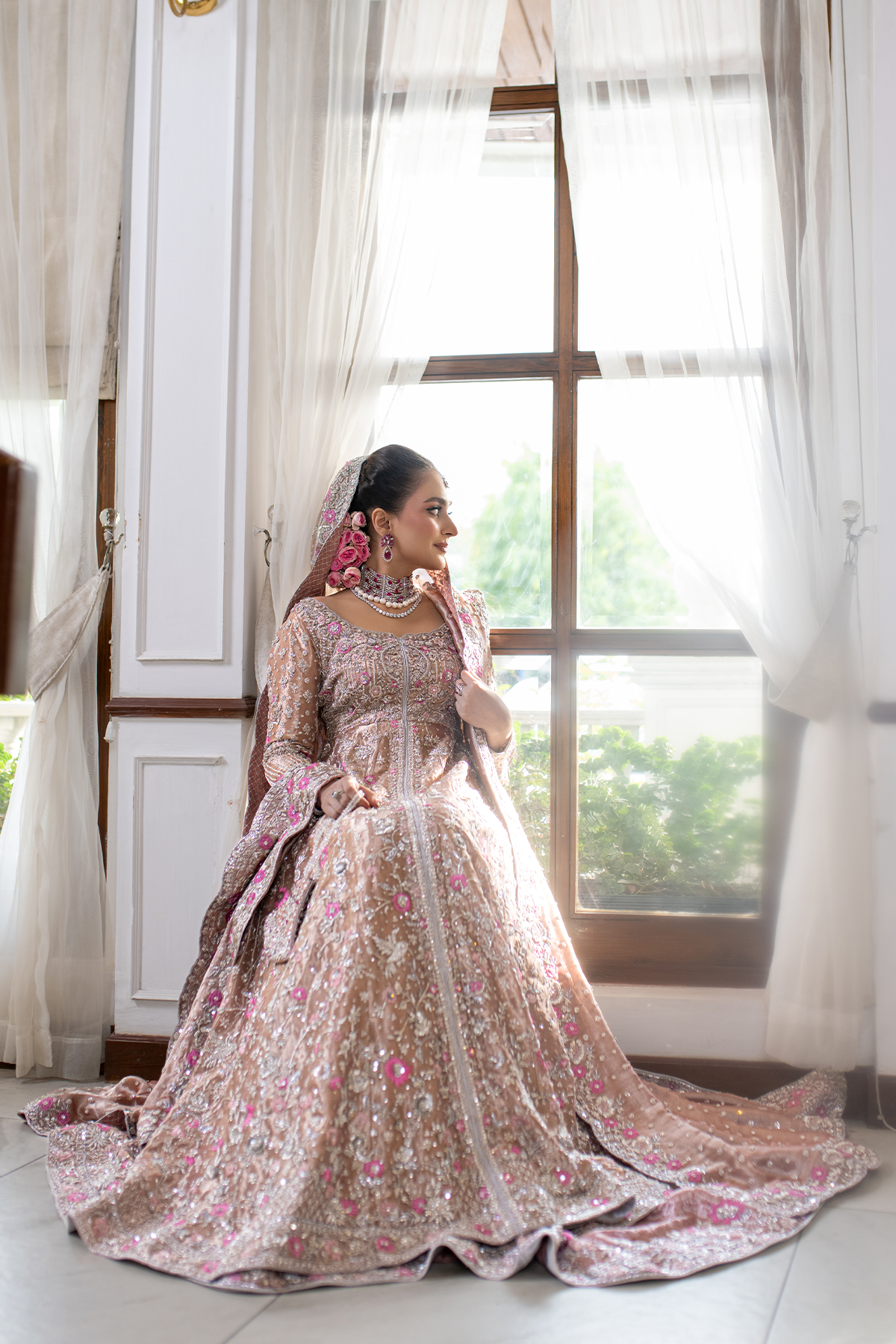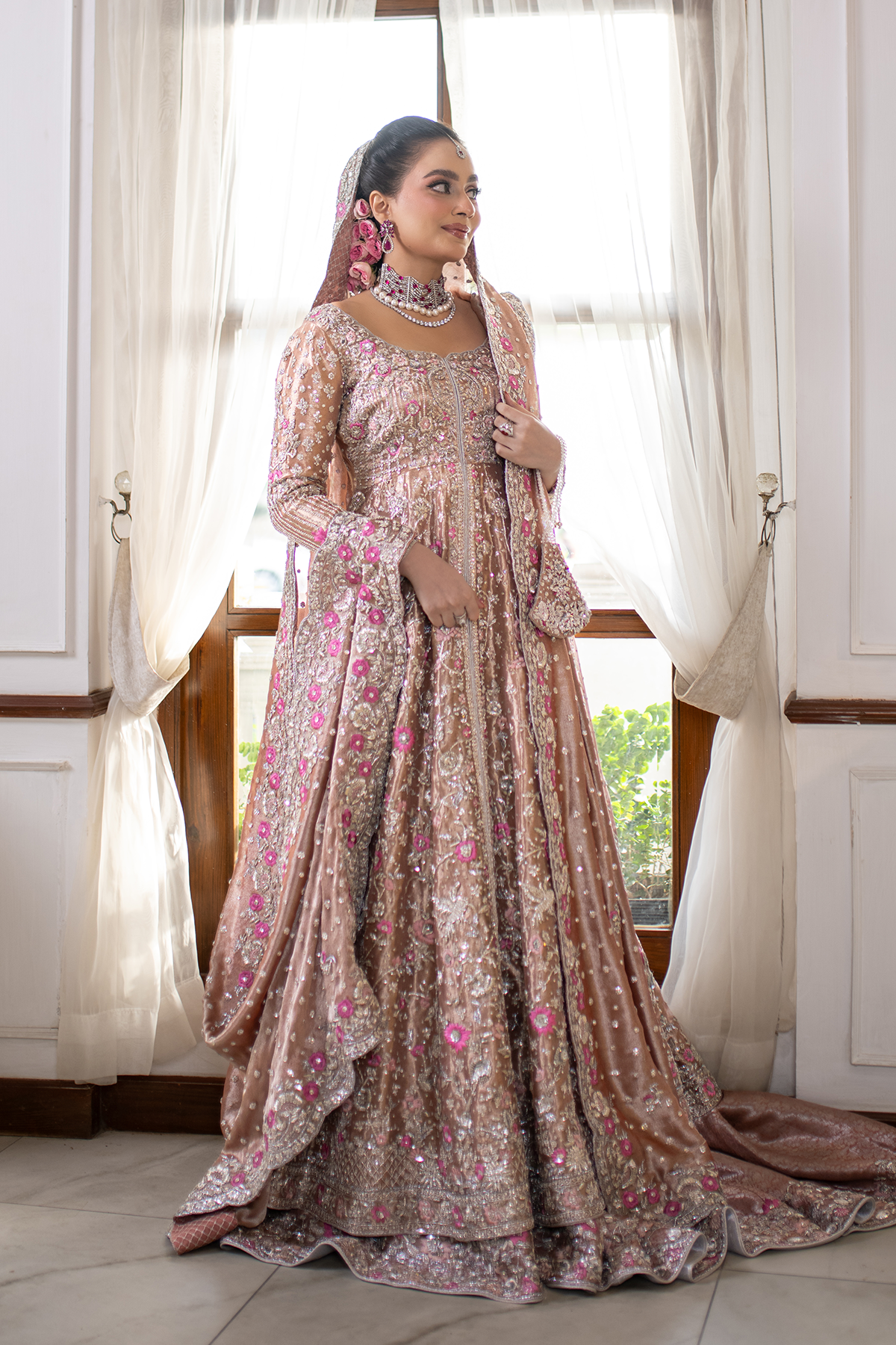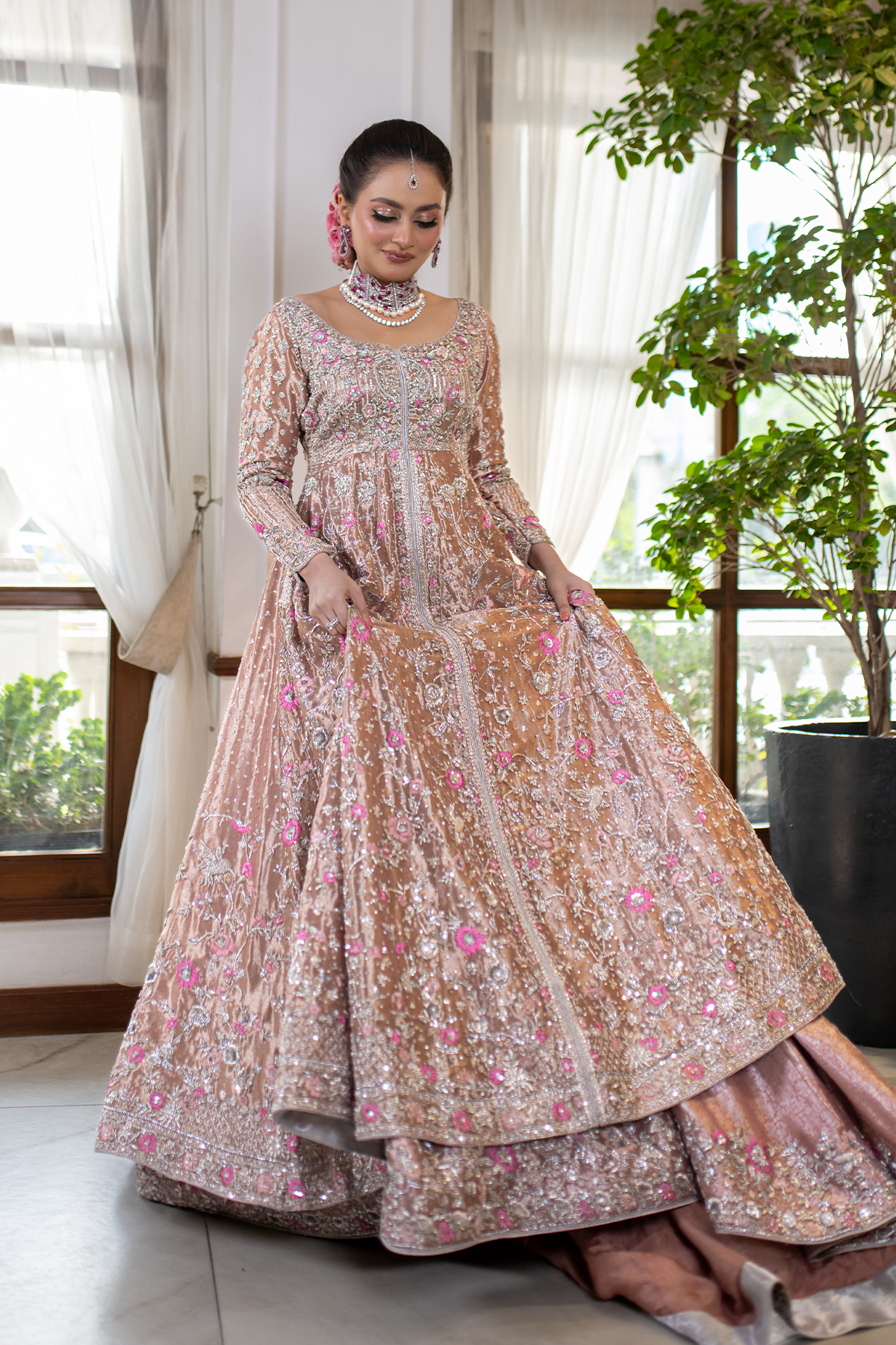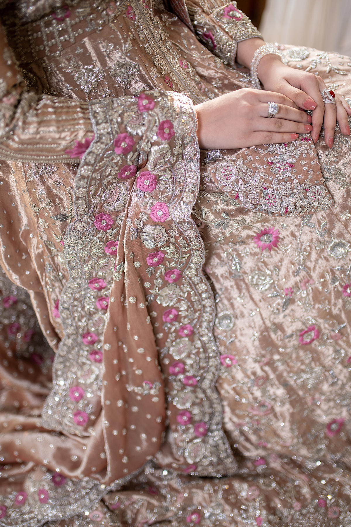 This cherry blossom pink gown has a lush pure lamé base and is worked with high-quality dabka, kora, sequins, beads, swarovski using traditional craftsmanship. Paired with a jamwar farshi and lameh duppata.