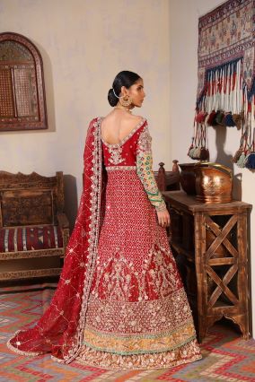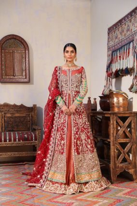 A heavily worked deep red gown with chatta patti sleeves and chatta patti detail on border, paired with atlas jamawar lehnga with worked border and organza duppata.