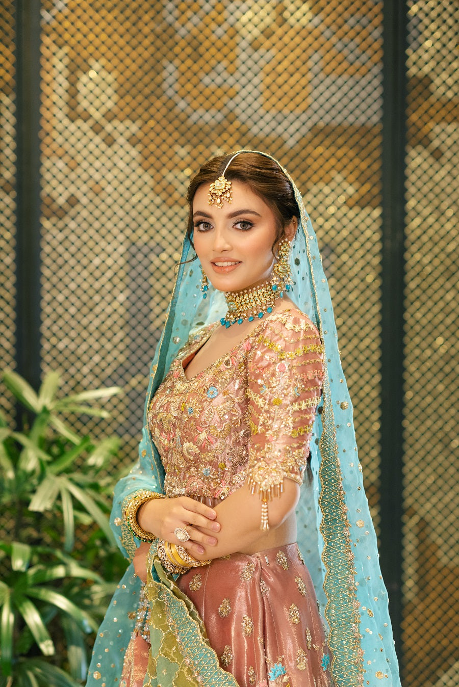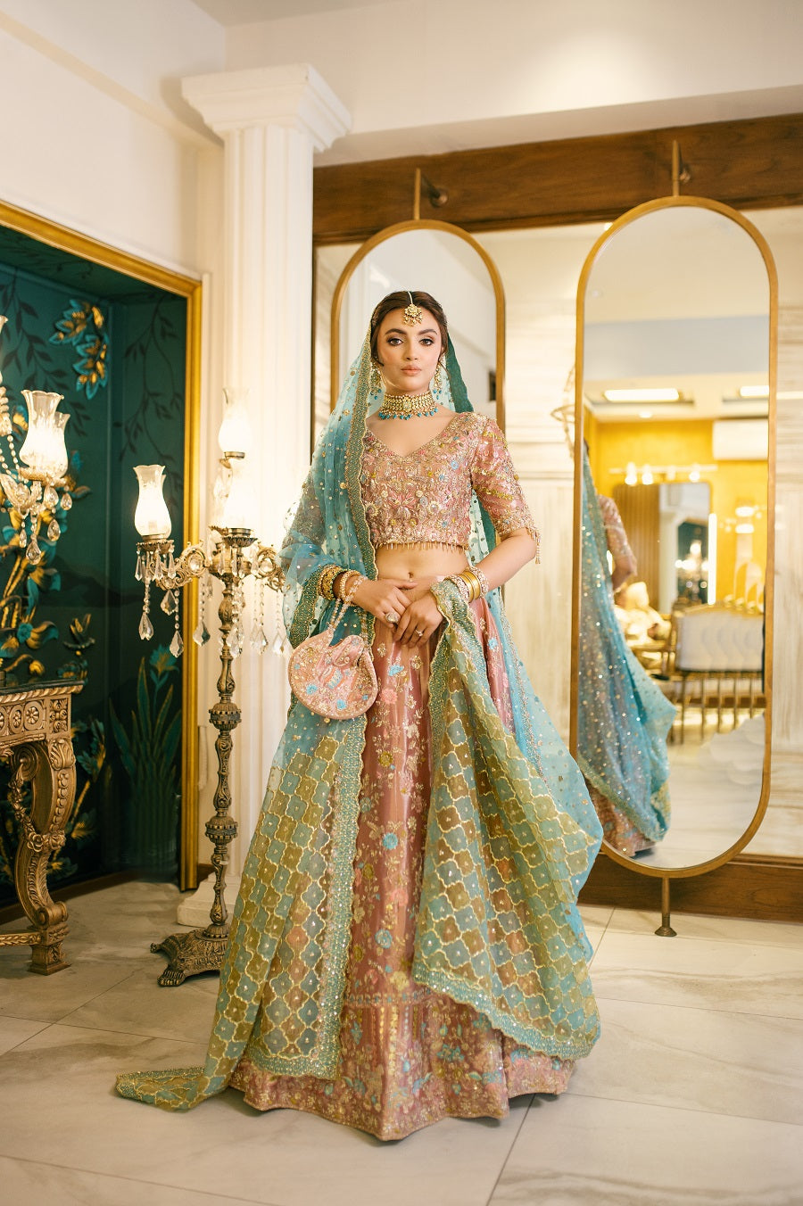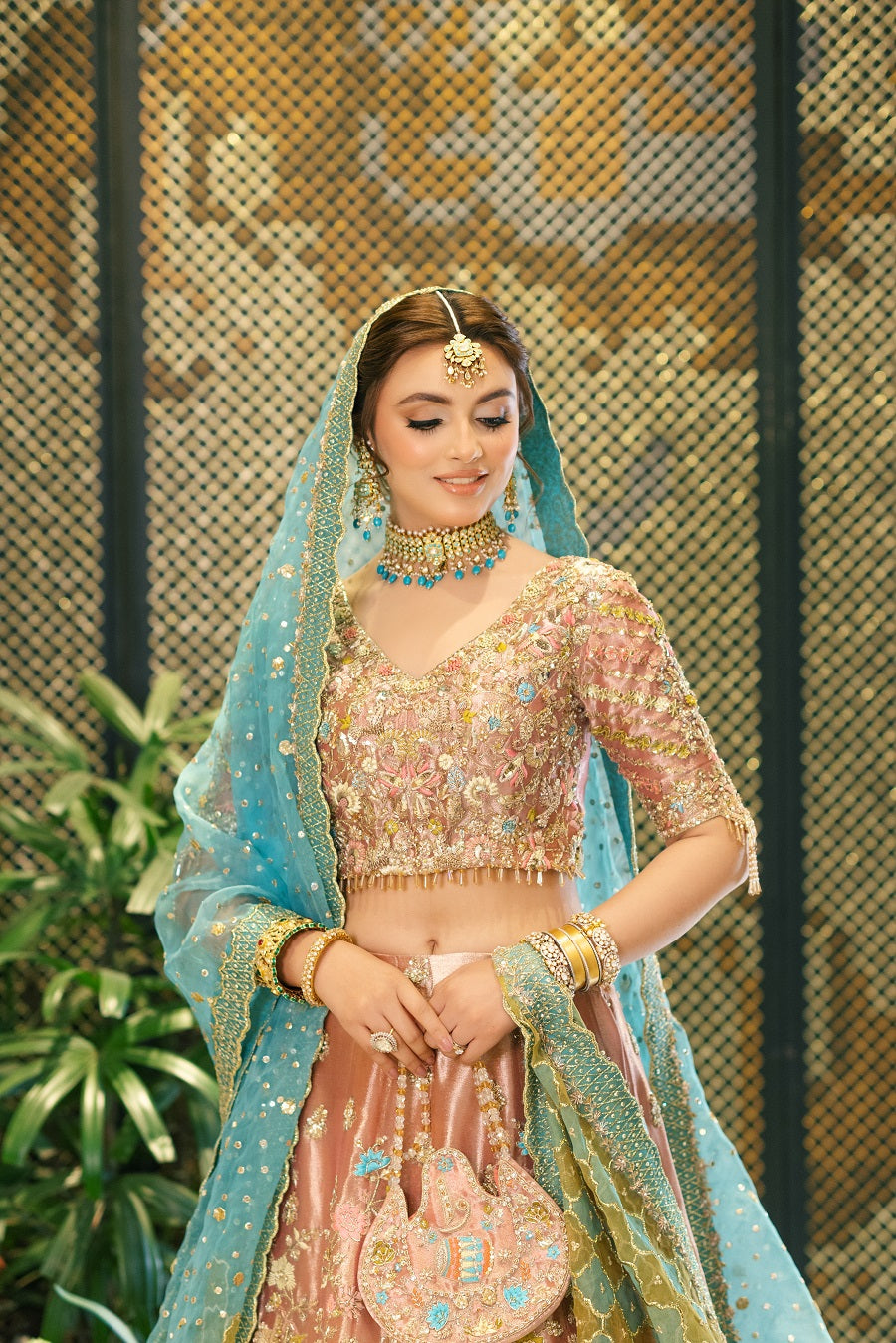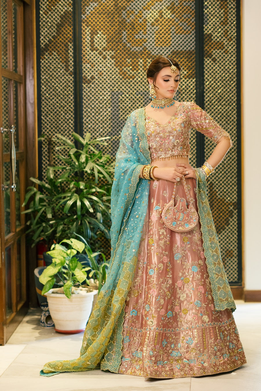 An intricately worked peachy pink tissue lehnga choli worked with reshum in pastel shades. Worked with dabka, naqshi, gotta and mukaish. Paired with a blue and yellow dupatta.