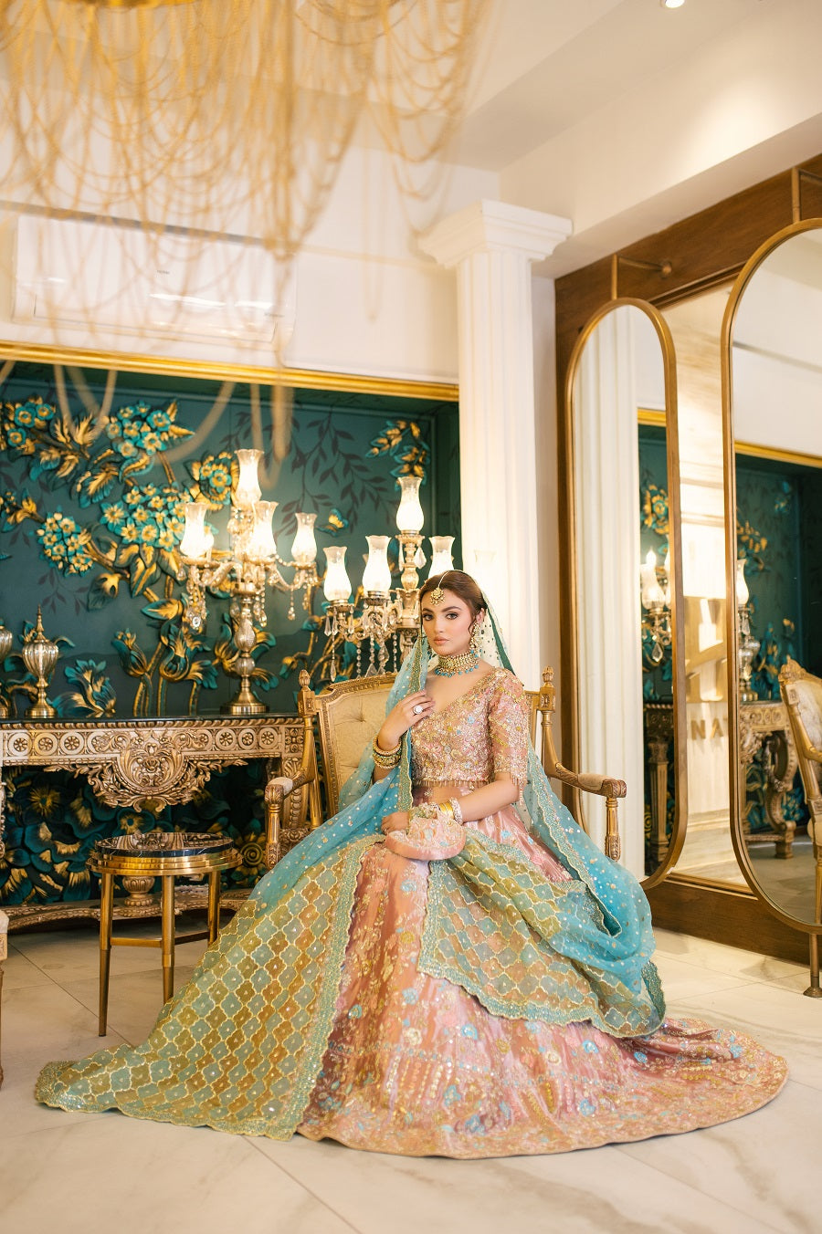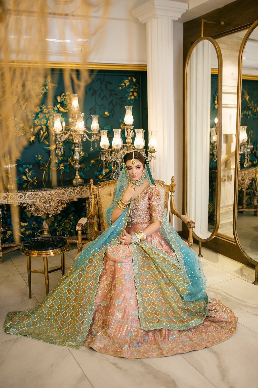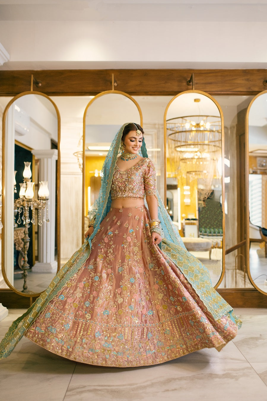 An intricately worked peachy pink tissue lehnga choli worked with reshum in pastel shades. Worked with dabka, naqshi, gotta and mukaish. Paired with a blue and yellow dupatta.