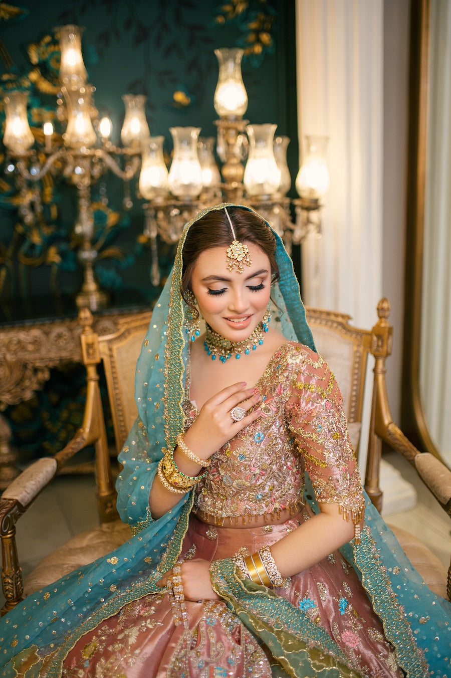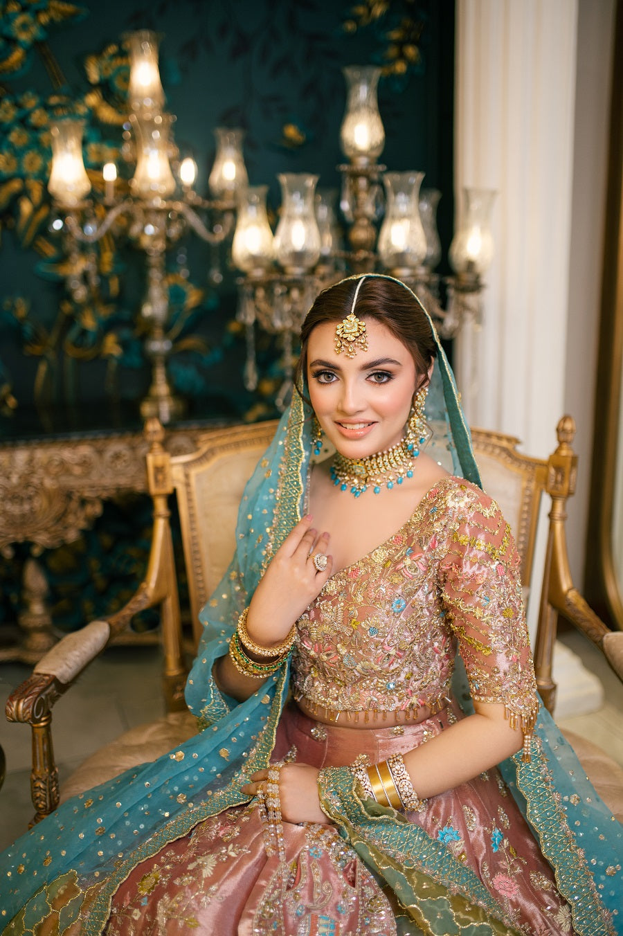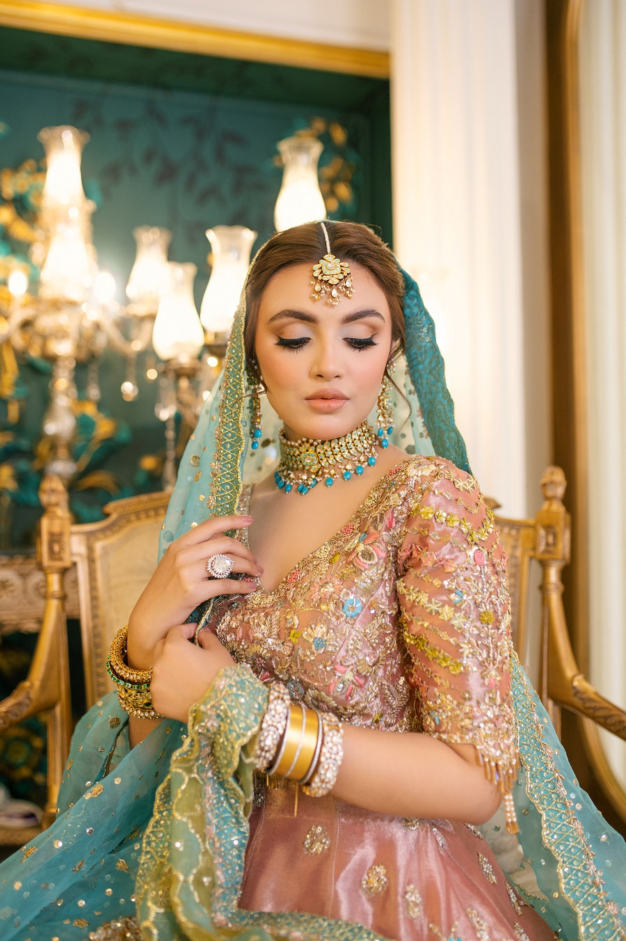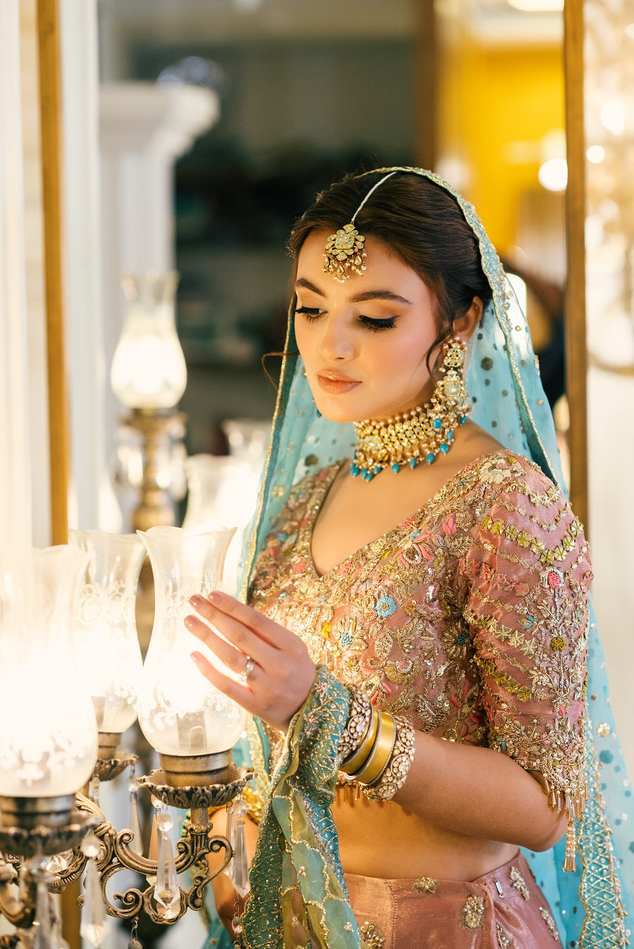 An intricately worked peachy pink tissue lehnga choli worked with reshum in pastel shades. Worked with dabka, naqshi, gotta and mukaish. Paired with a blue and yellow dupatta.