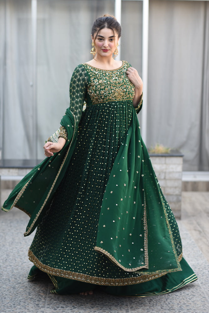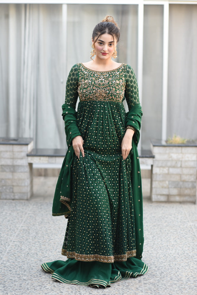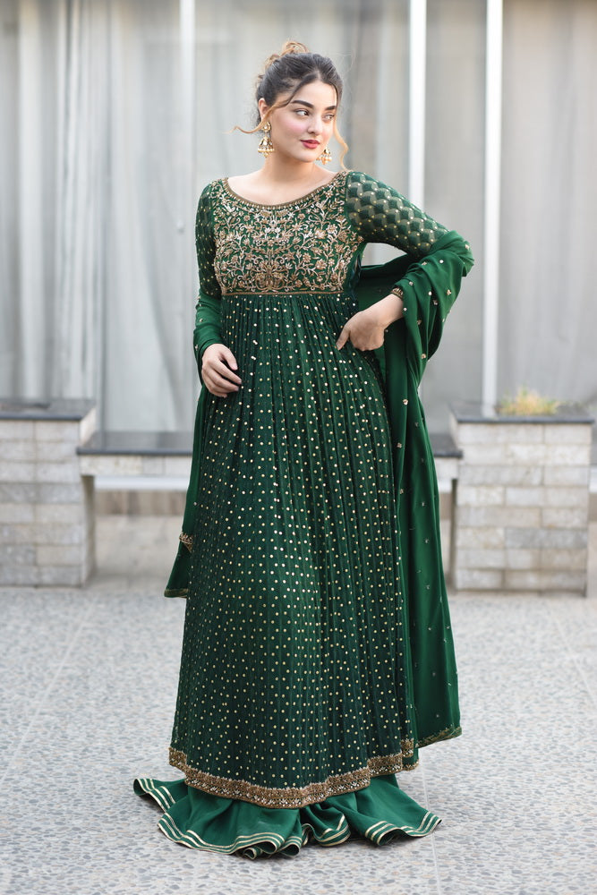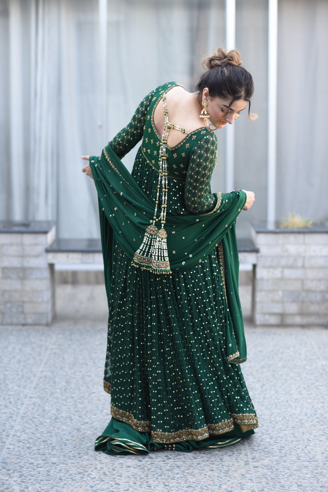 Heavily embellished chiffon kalidar worked with zardozi, salma and kamdani techniques. Paired with a raw silk ghara with gottta work.