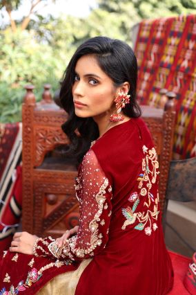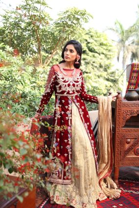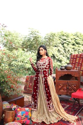 A unique cut shirt with front and side slits with beautiful embroidery. Zardozi and reshum work of velvet base. The lehnga has a gorgeous zardozi border with maroon silk apliques.