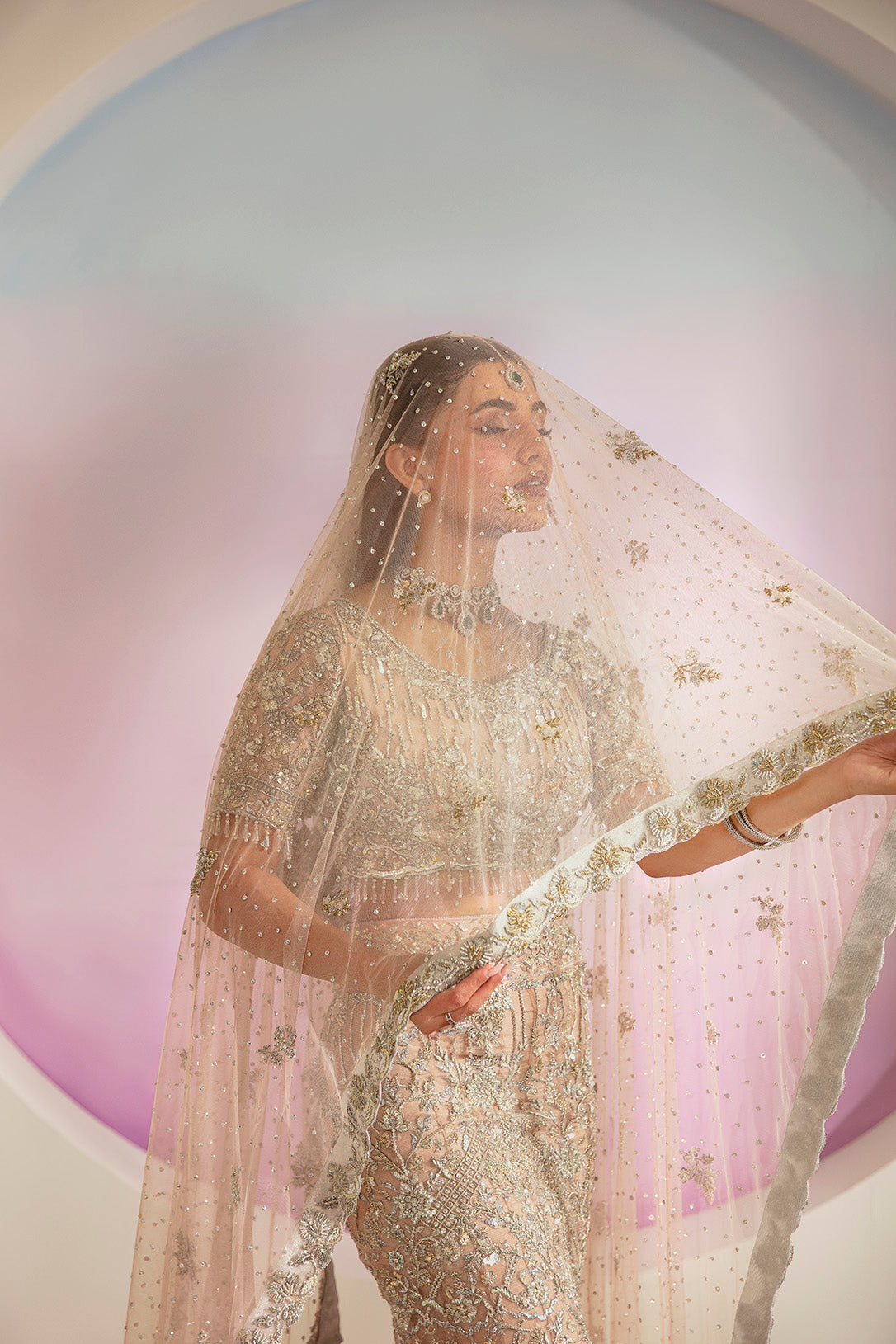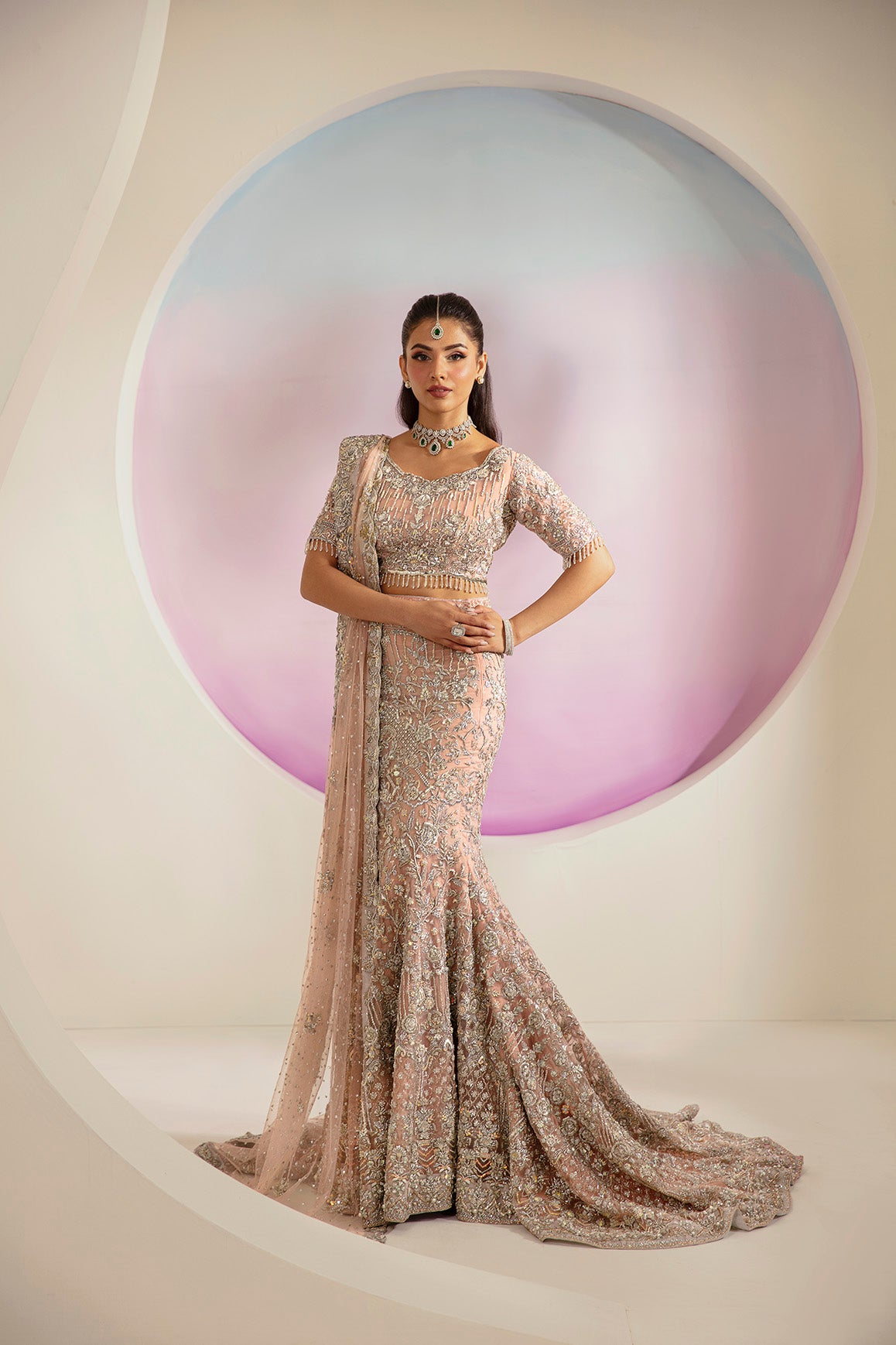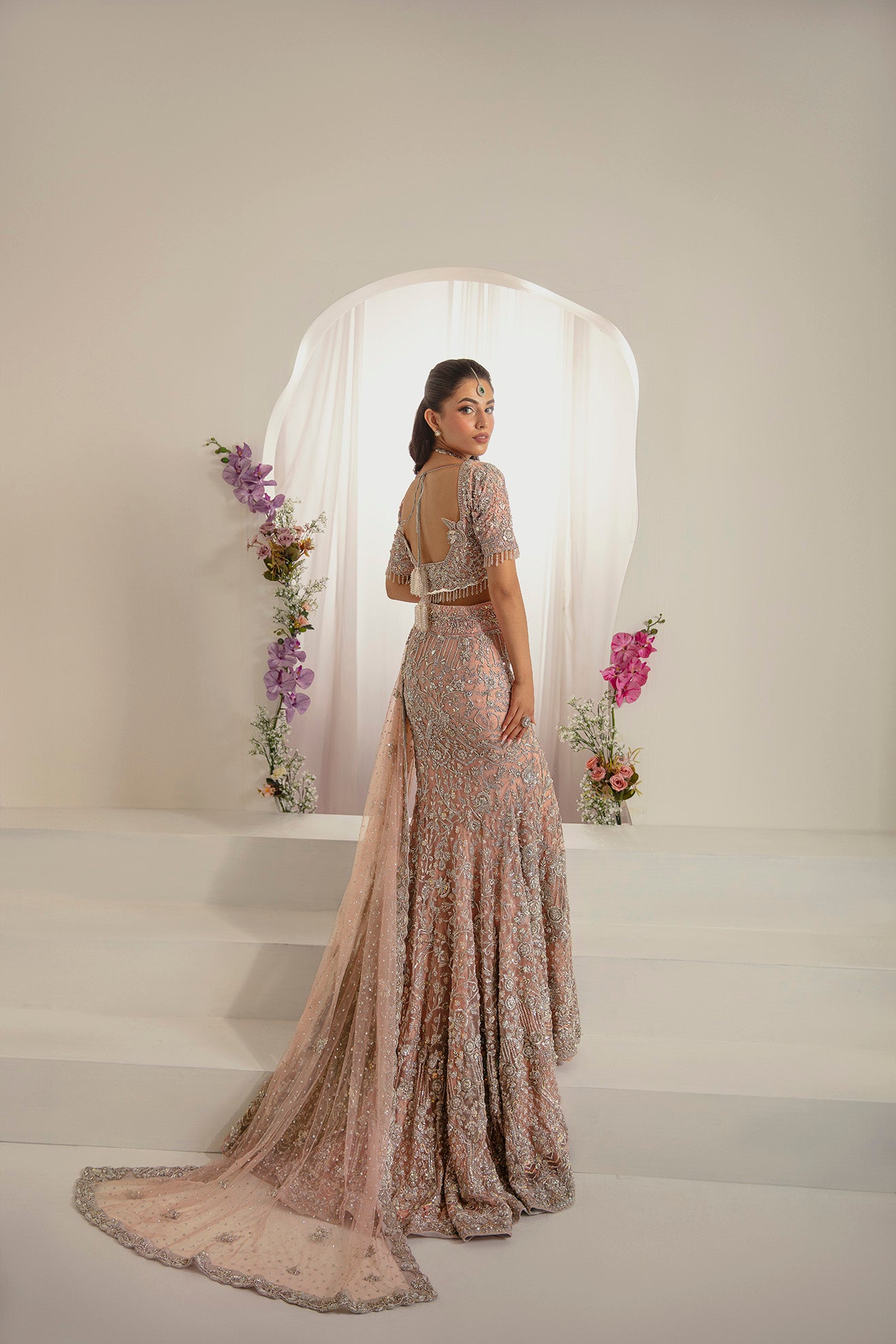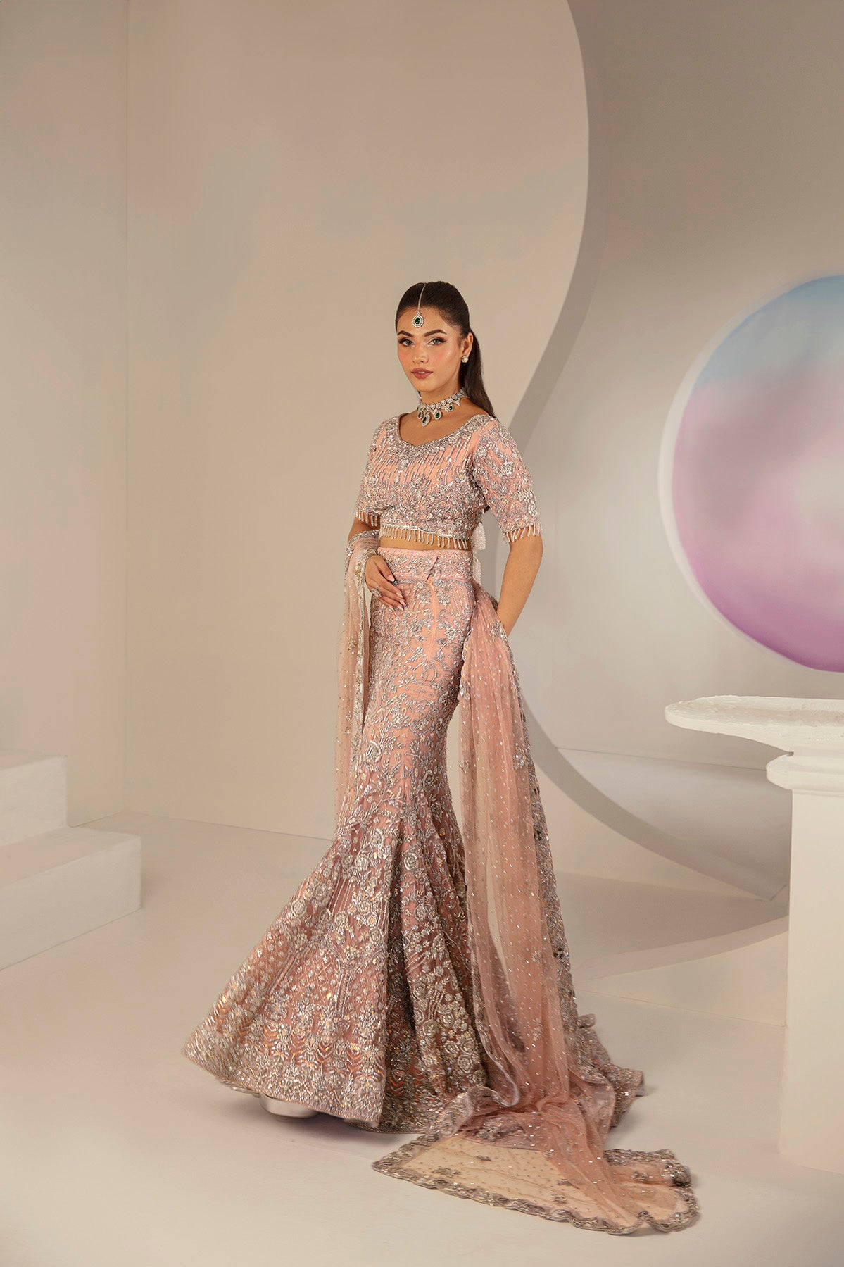 Intricately worked shell pink mermaid skirt with choli in french net fabric. Paired with a heavily worked dupatta. All hand embellished with swarvoskis, kora, badla, pearls and beads.