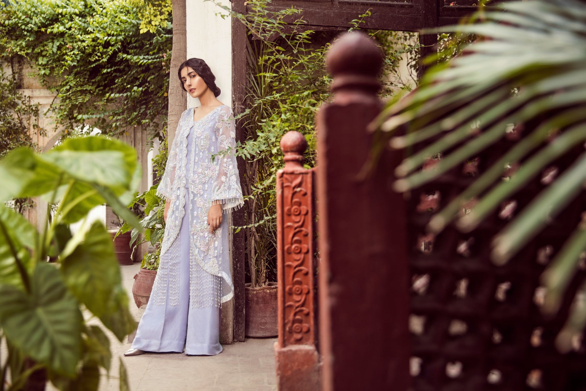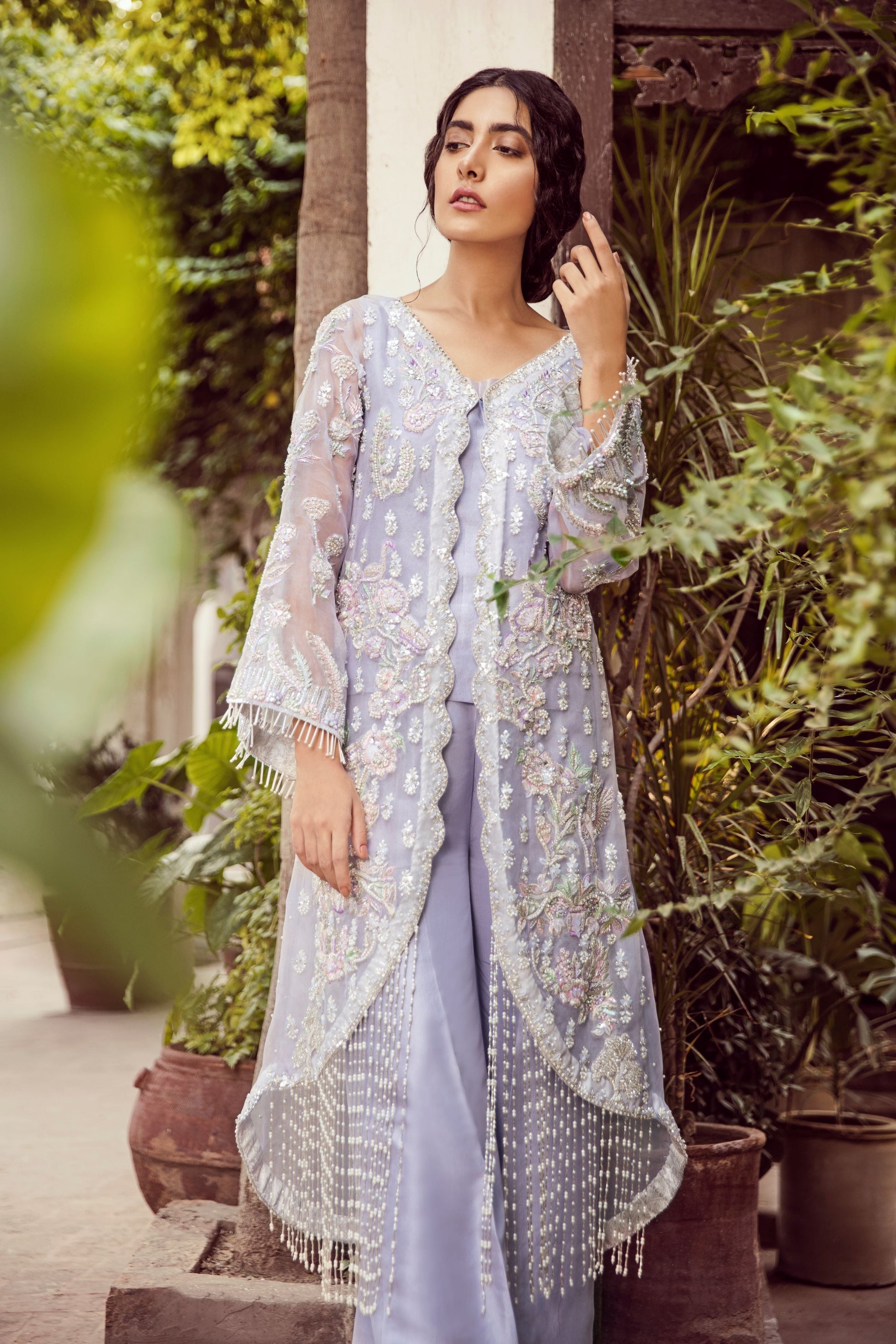 A knee lehnga front open jacket with scallops on the front slit. Fully embellished with sequins, beads, swarovski etc. Pairee with pure raw silk pants and undershirt.