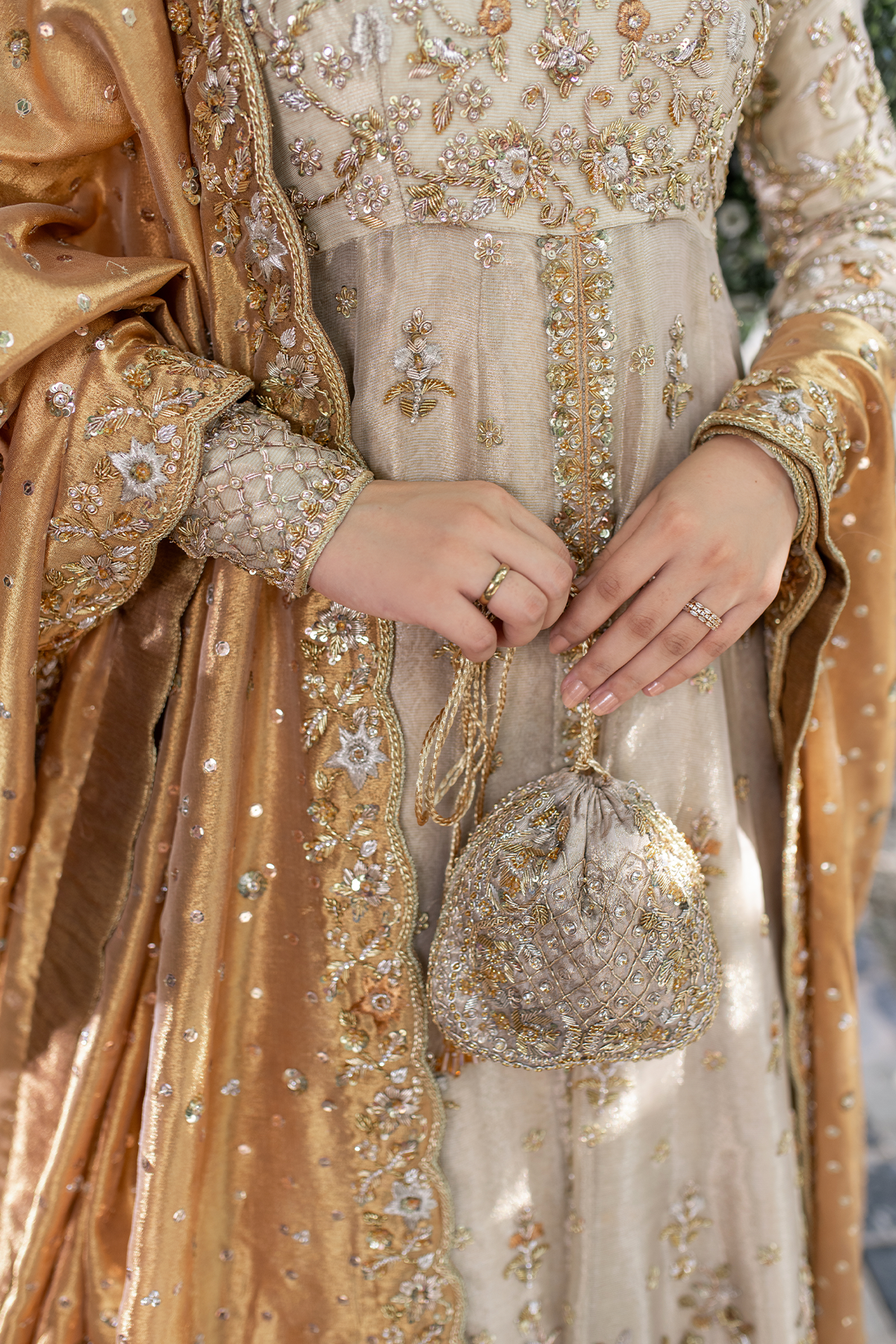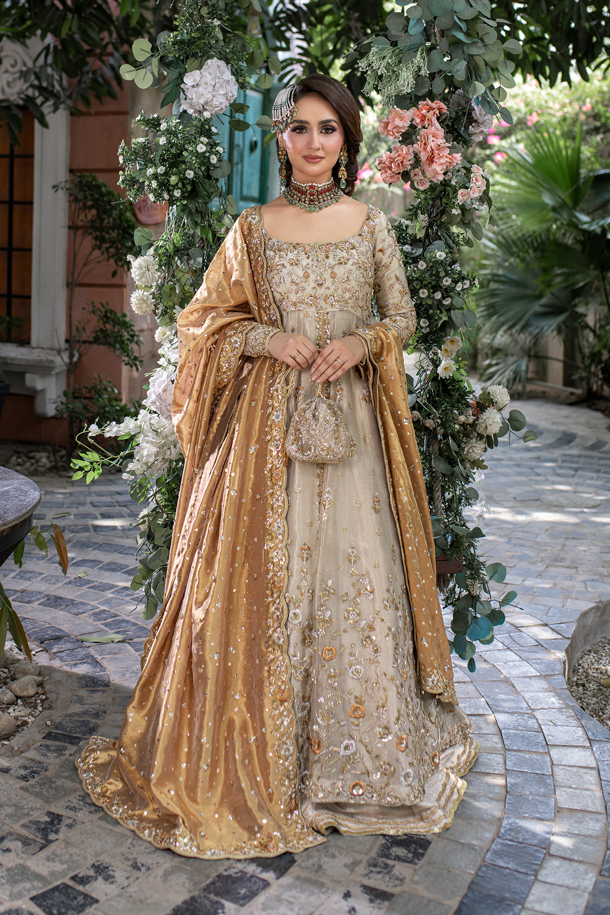 A light gold kalidar paired with a copper dupatta. This intricately handcrafted bridal kalidar is crafted with dabka, resham, kora, naqshi, and sequins. Paired with a jamwar lehnga with handworked border.