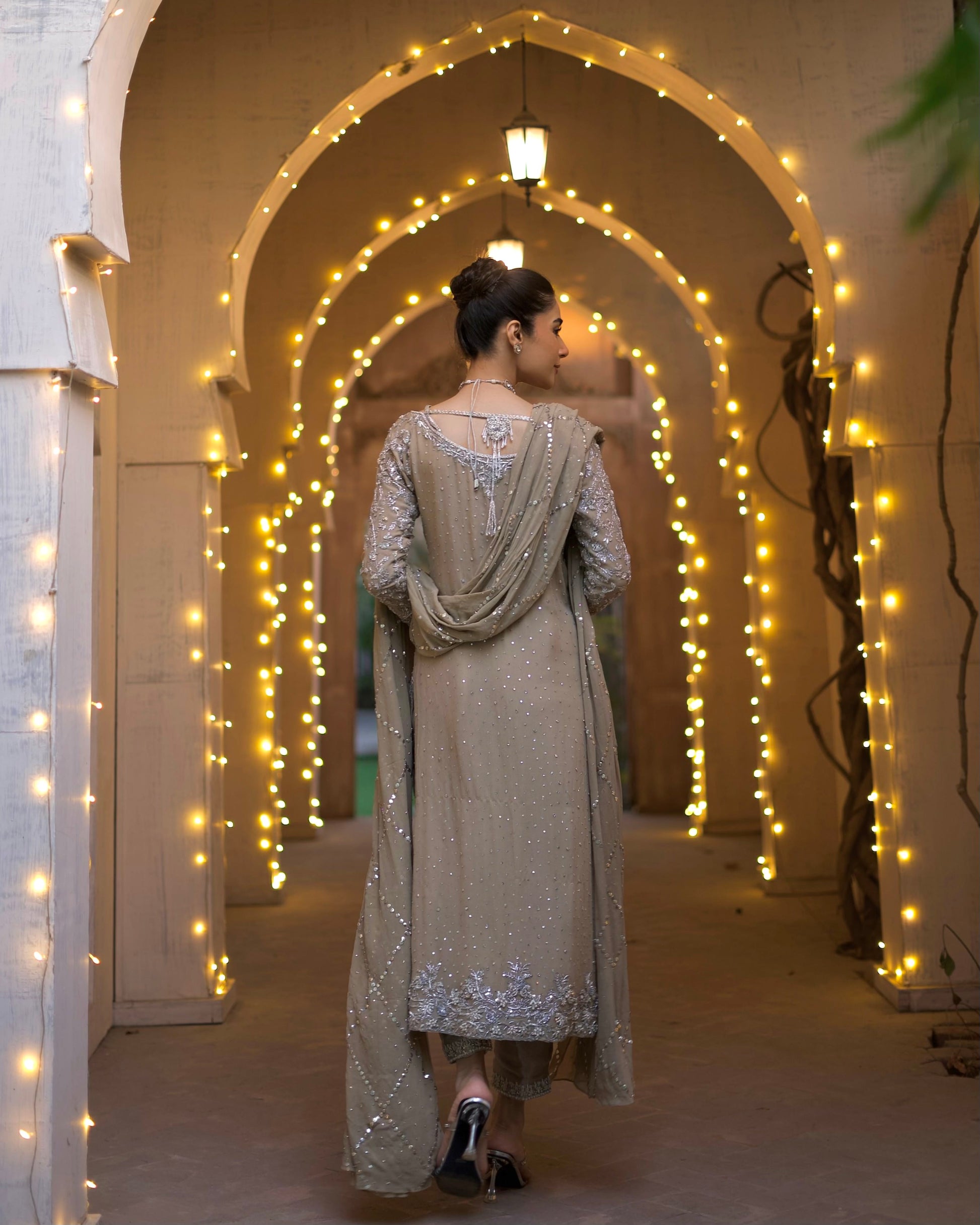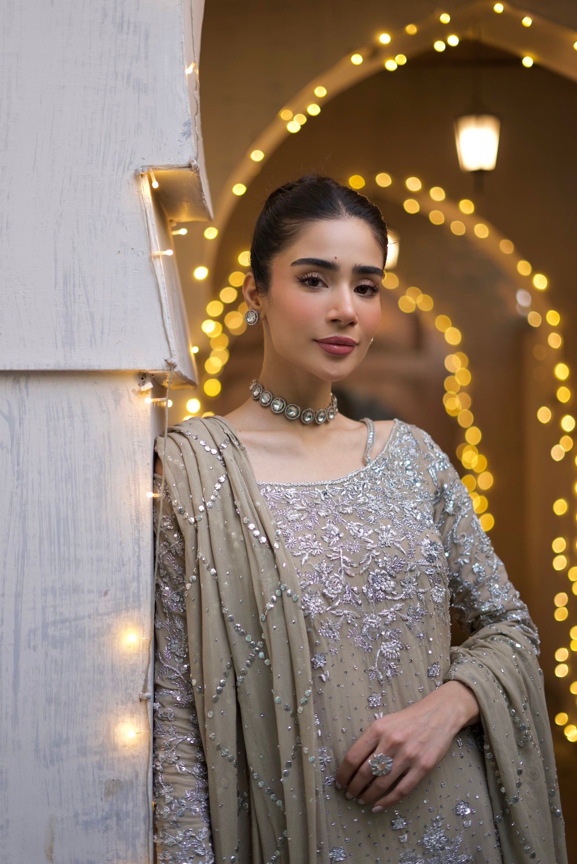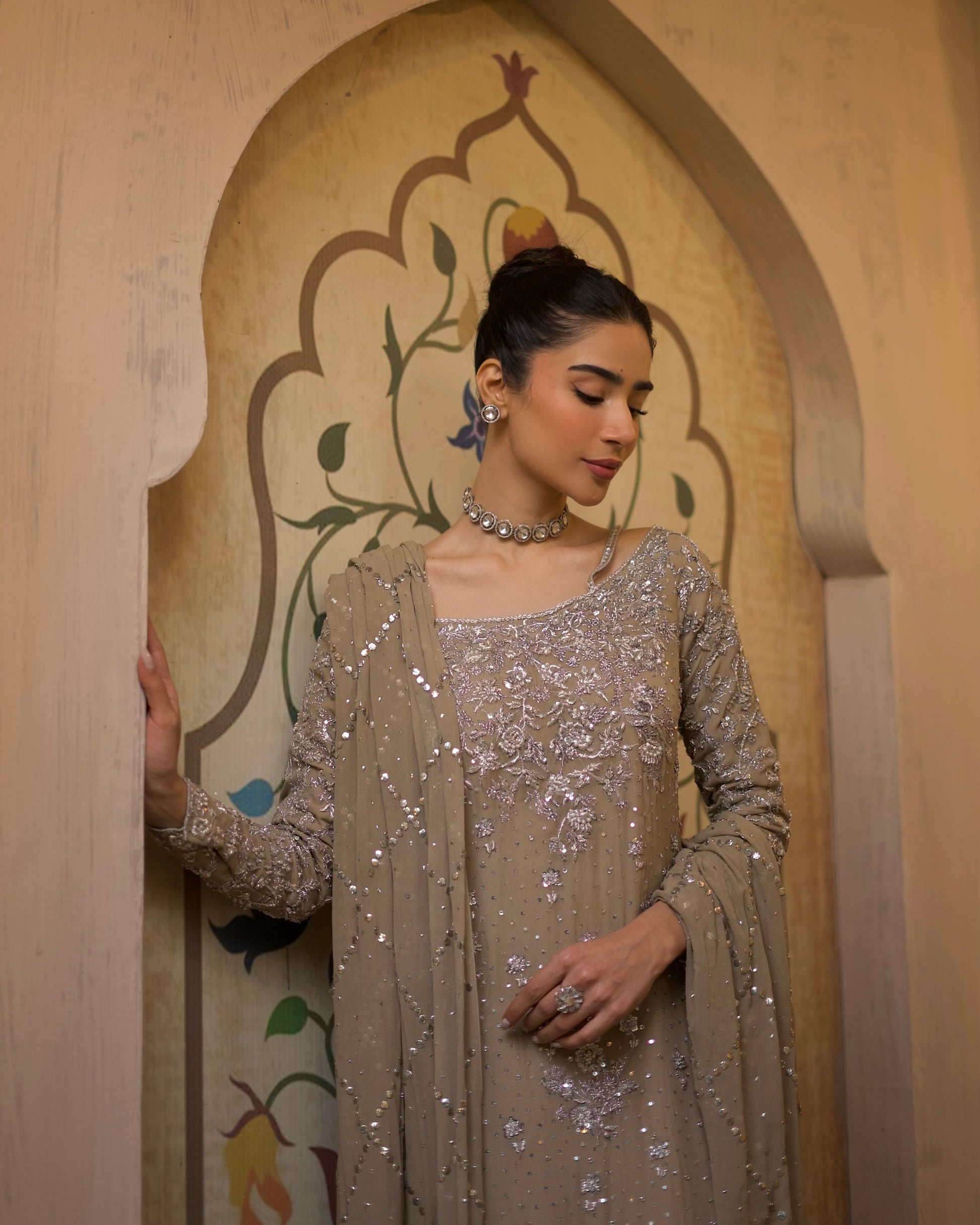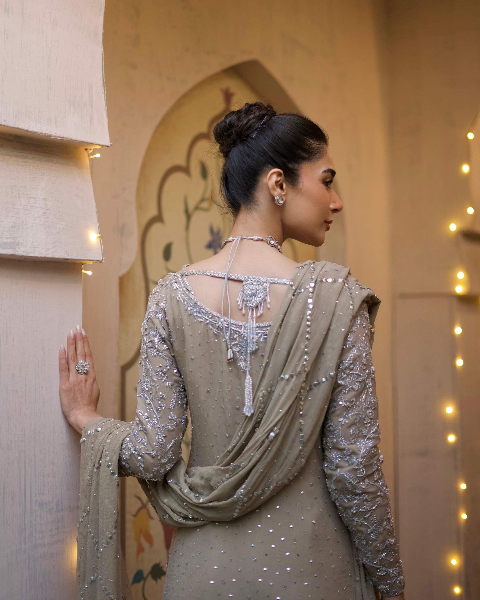 A heavily hand crafted long kameez paired with handcrafted trousers and a kaamdani dupatta. The shirt has dabka, naqshi, beads, sequins, swarovskis and tilla work.