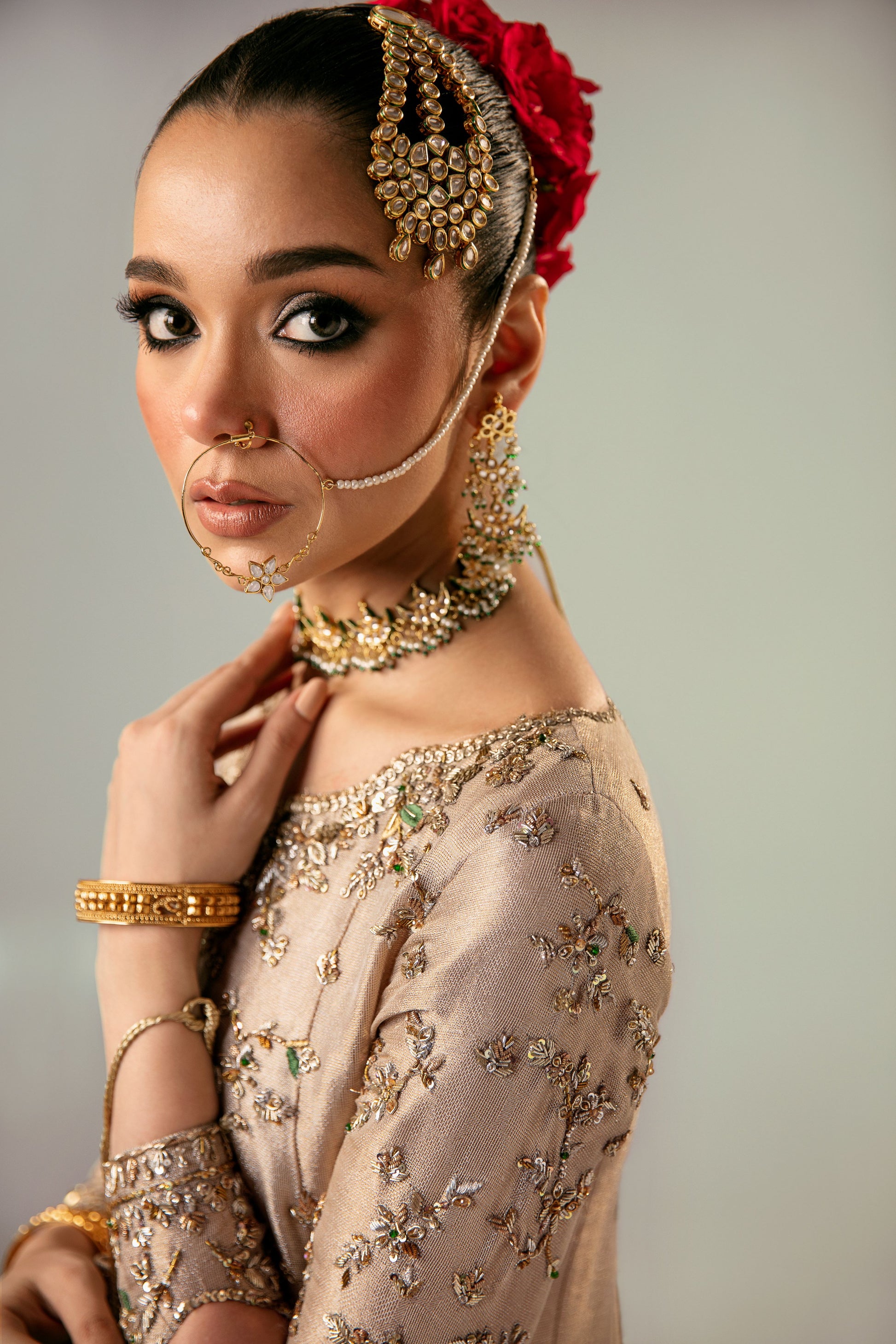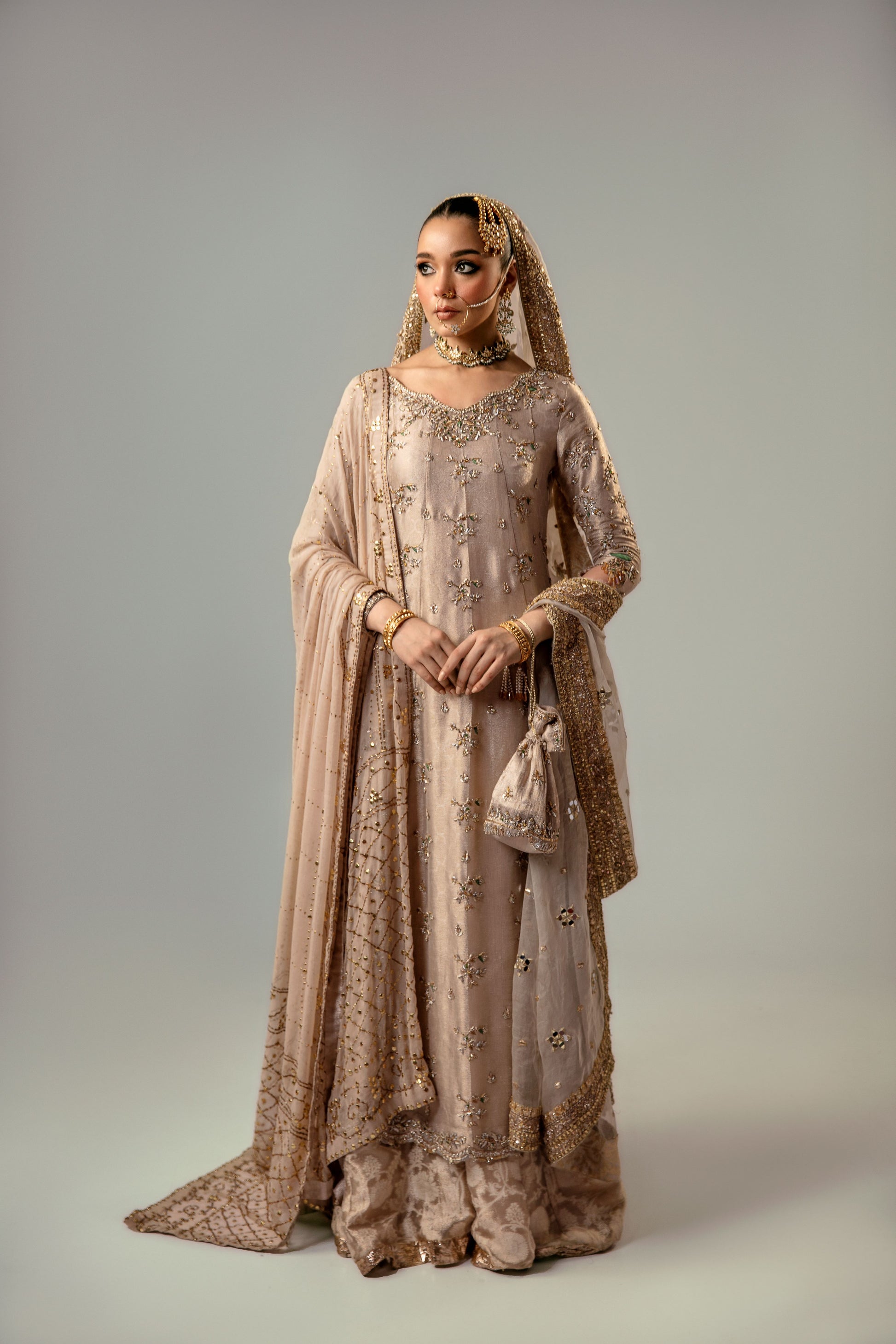 A side slit kalidar delicately worked in shades of gold and with a hint of emerald green resham paired with a mukaish dupatta. Worked with kora, dabka and naqshi work.