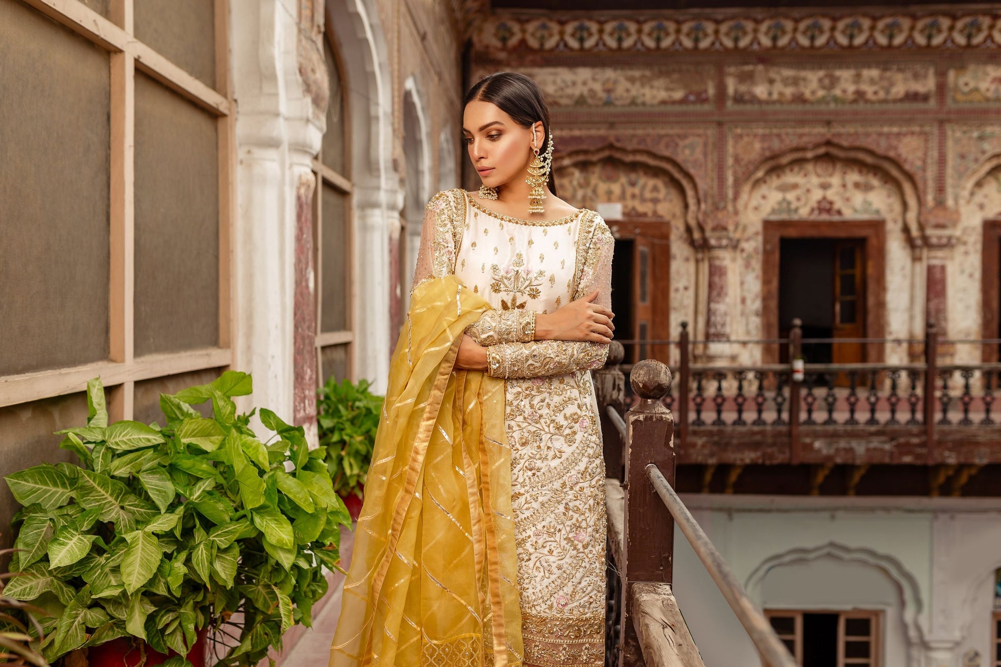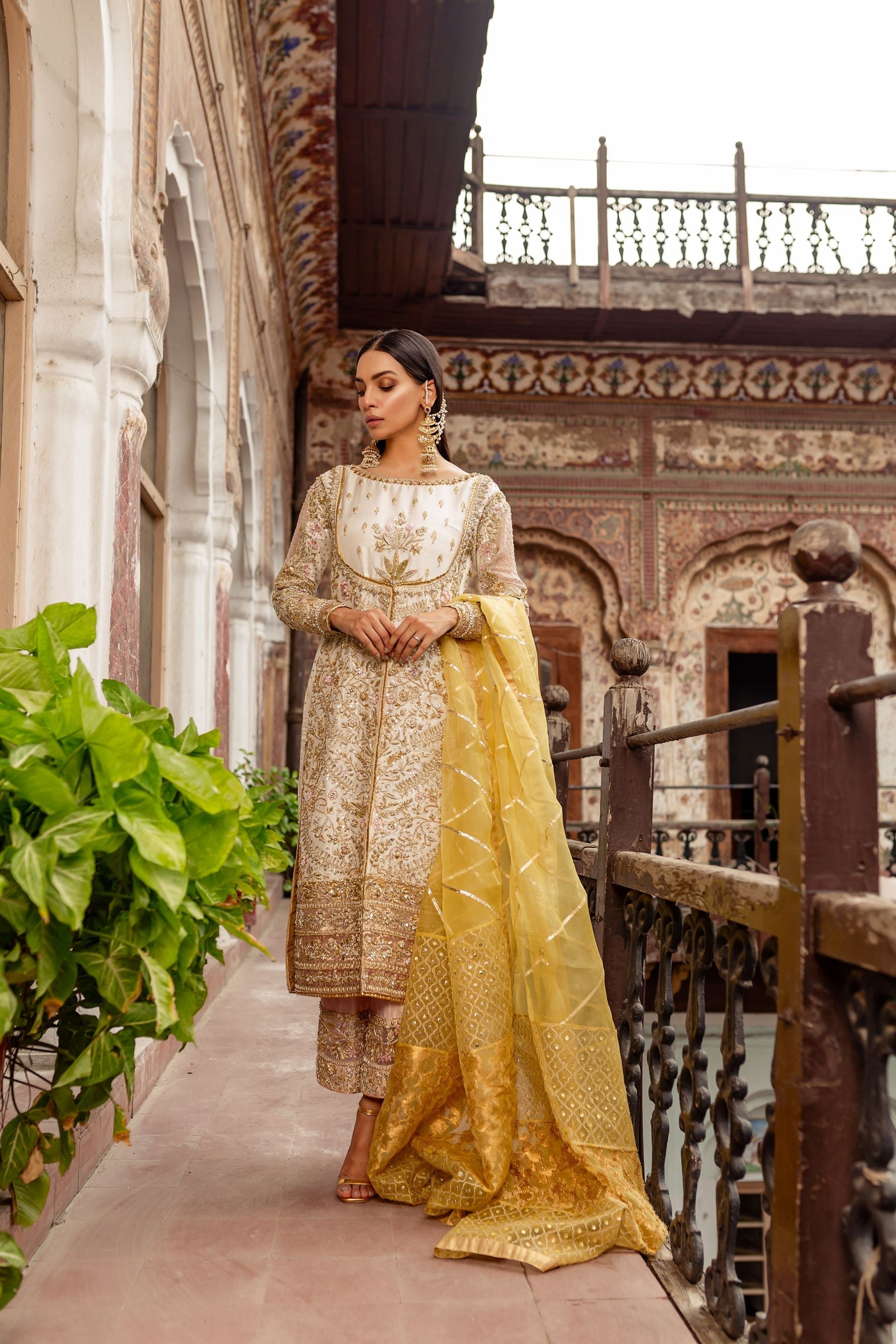 A pearl white heavily worked shirt with pink reshum flowers with organza lime yellow zari and pallu detail duppata and pink raw silk worked border pants.