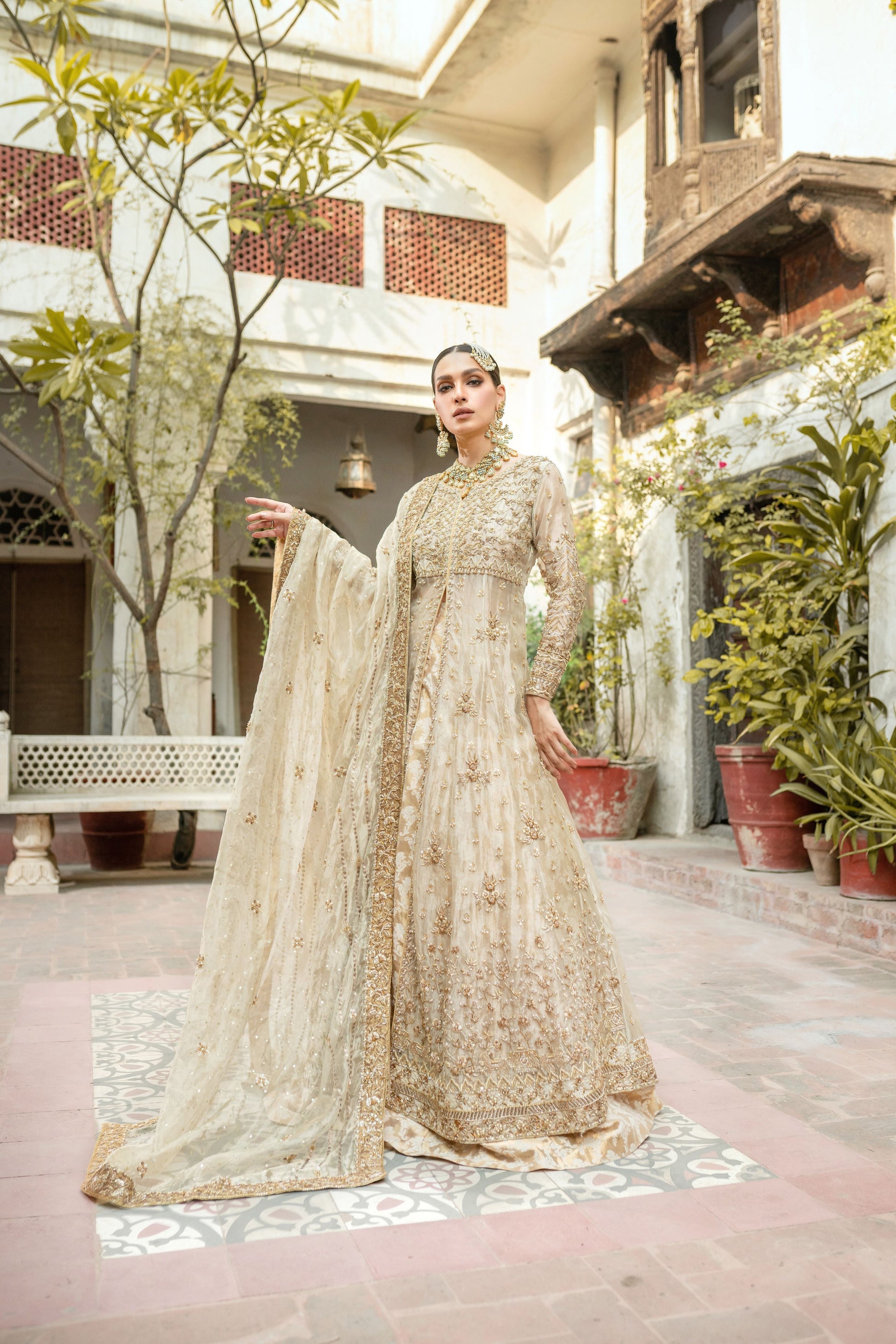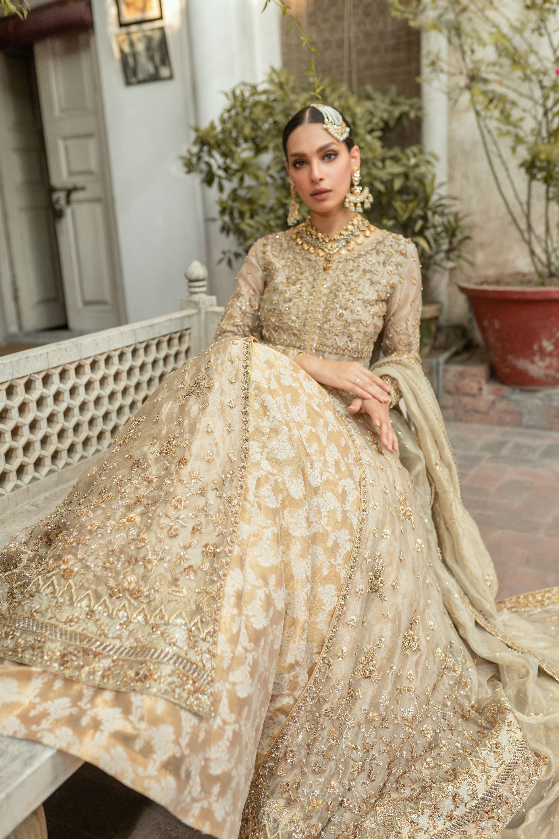 A dull gold zardozi worked kalidar. Handcrafted with three different shades of gold dabka, kora and naqshi. Paired with beautifully composed dupatta with accents of dull gold.