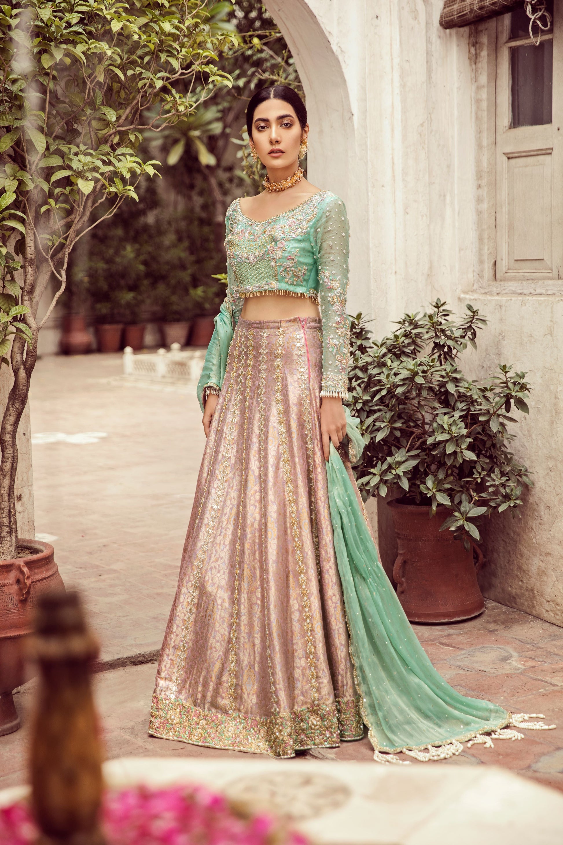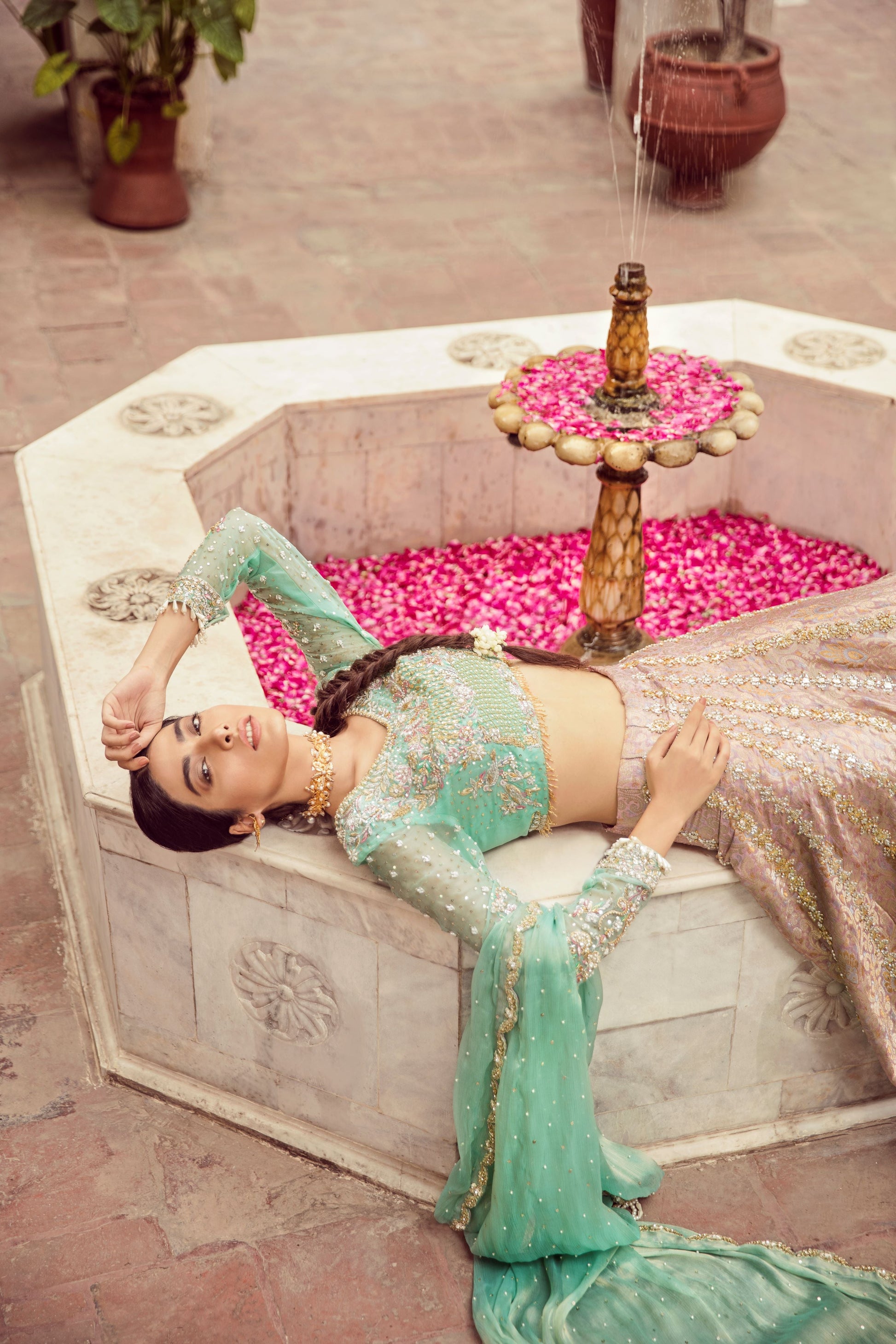 Beautifully handcrafted sea green choli worked with beads, sequins, resham, dabka etc on organza base. Lehnga is kora dabka and gotta work on a beautiful base of pure jamawar. The duppata is pure kundan zari with worked scallops on four sides.