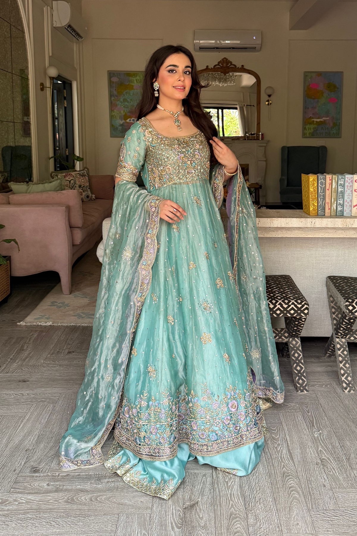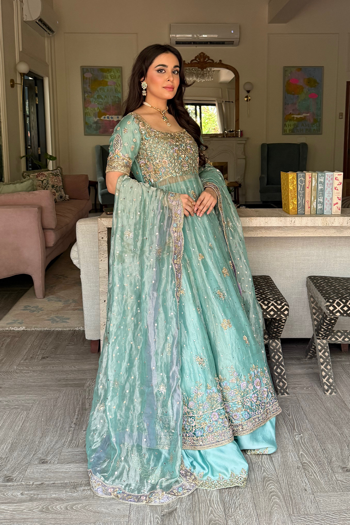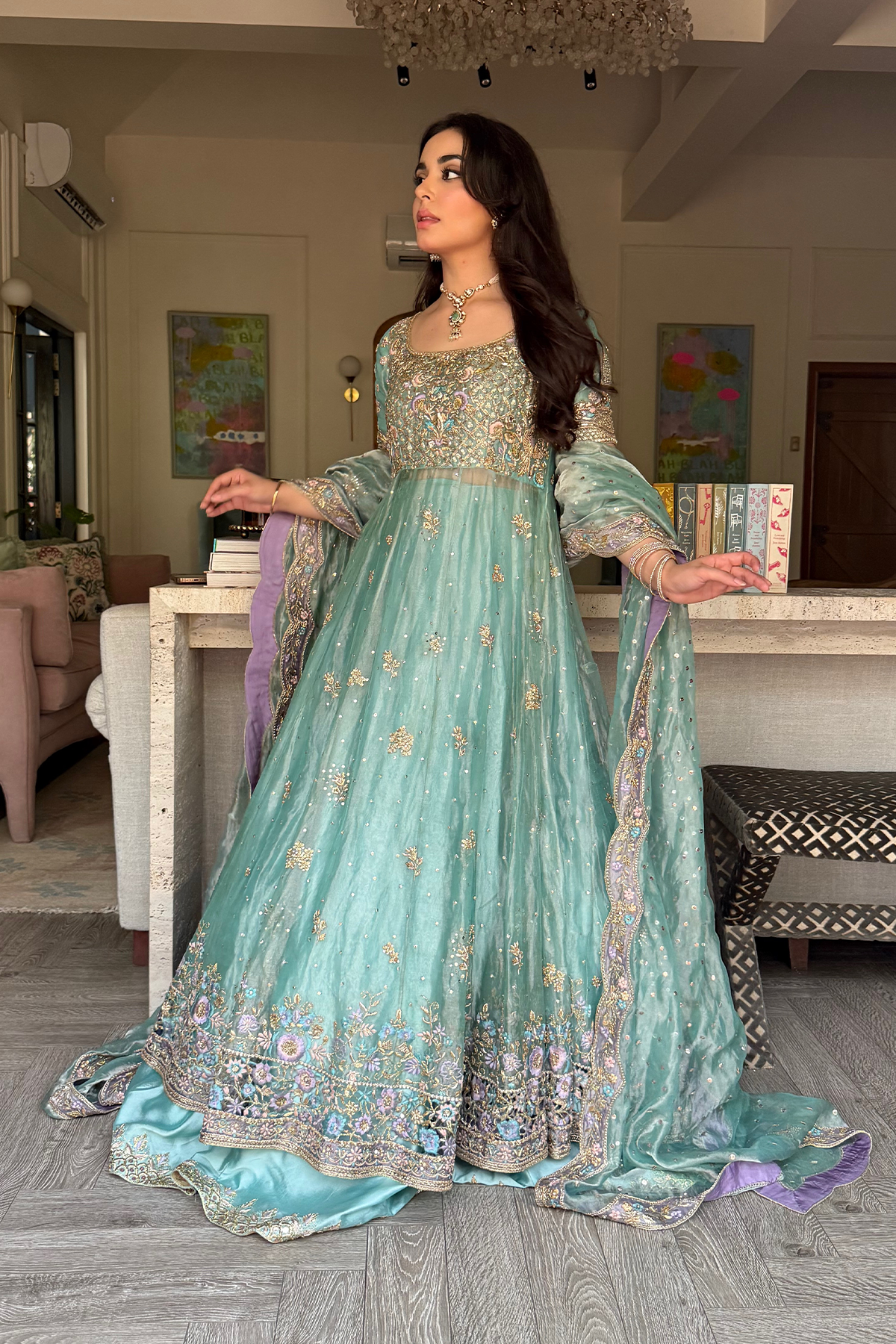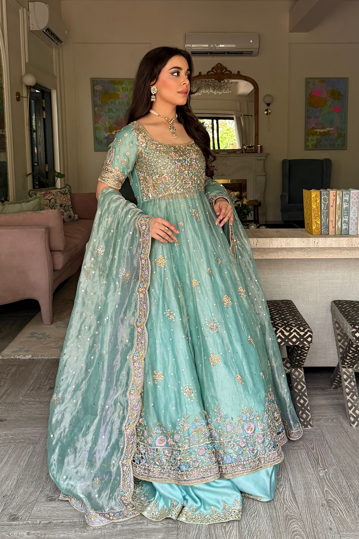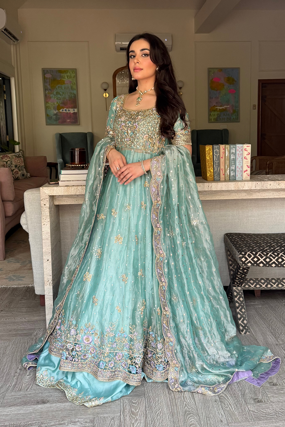 Handcrafted with dabka, kora, naqshi, sequins and resham. The border of the gown has beautiful cutwork embroidery.