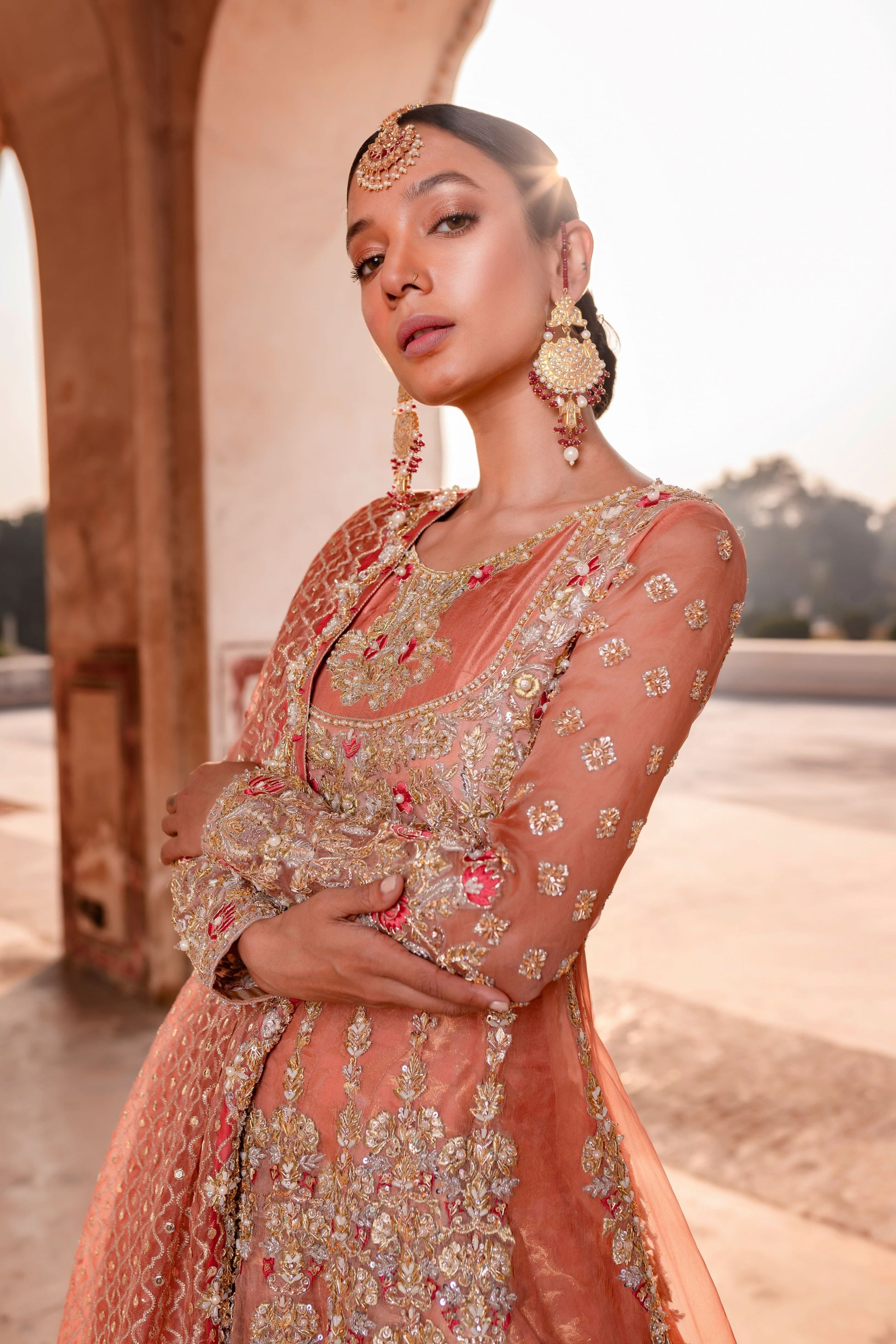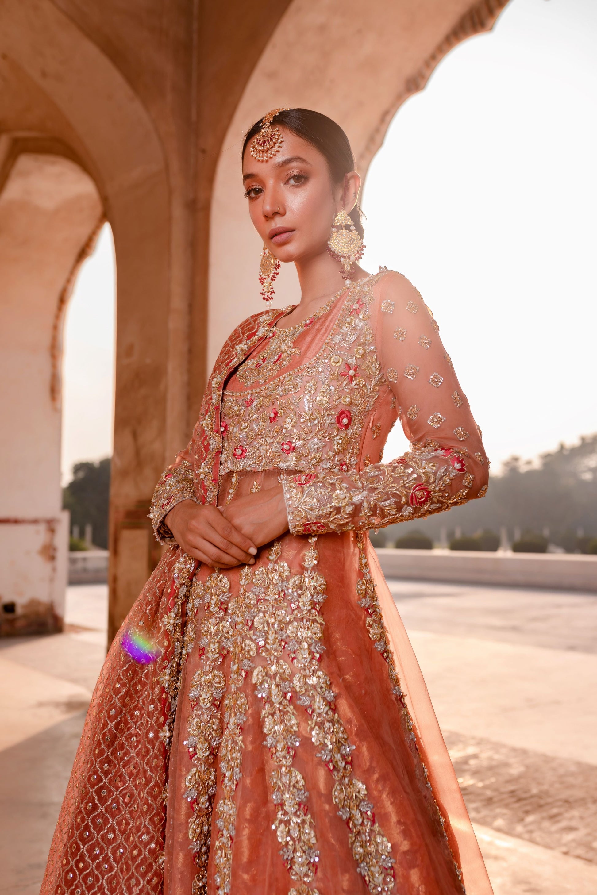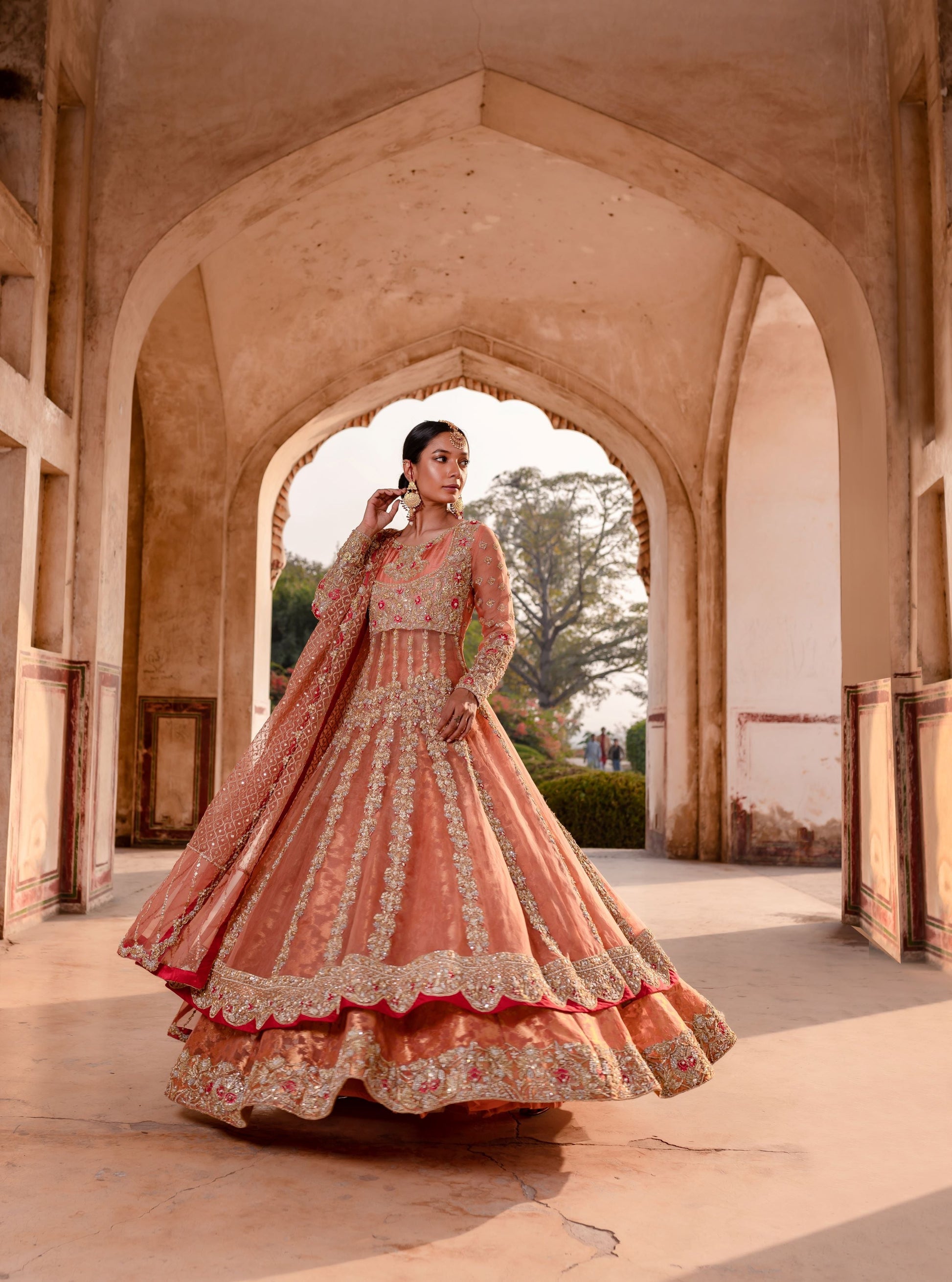 A kalidar with a lehnga. Beautifully hand embellished with kora, dabka, zadozi work paired with a dupatta with gorgeous pallu detail.