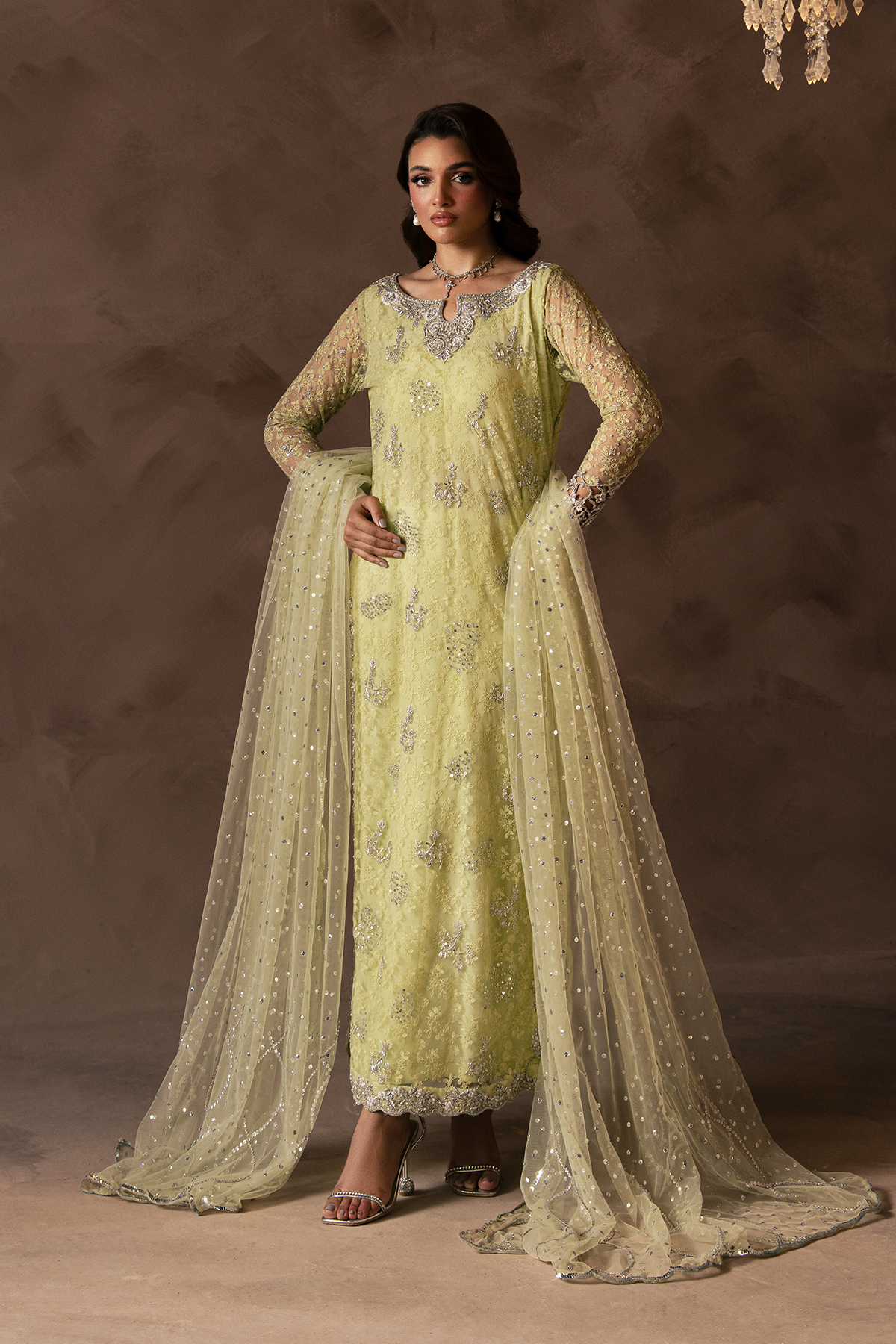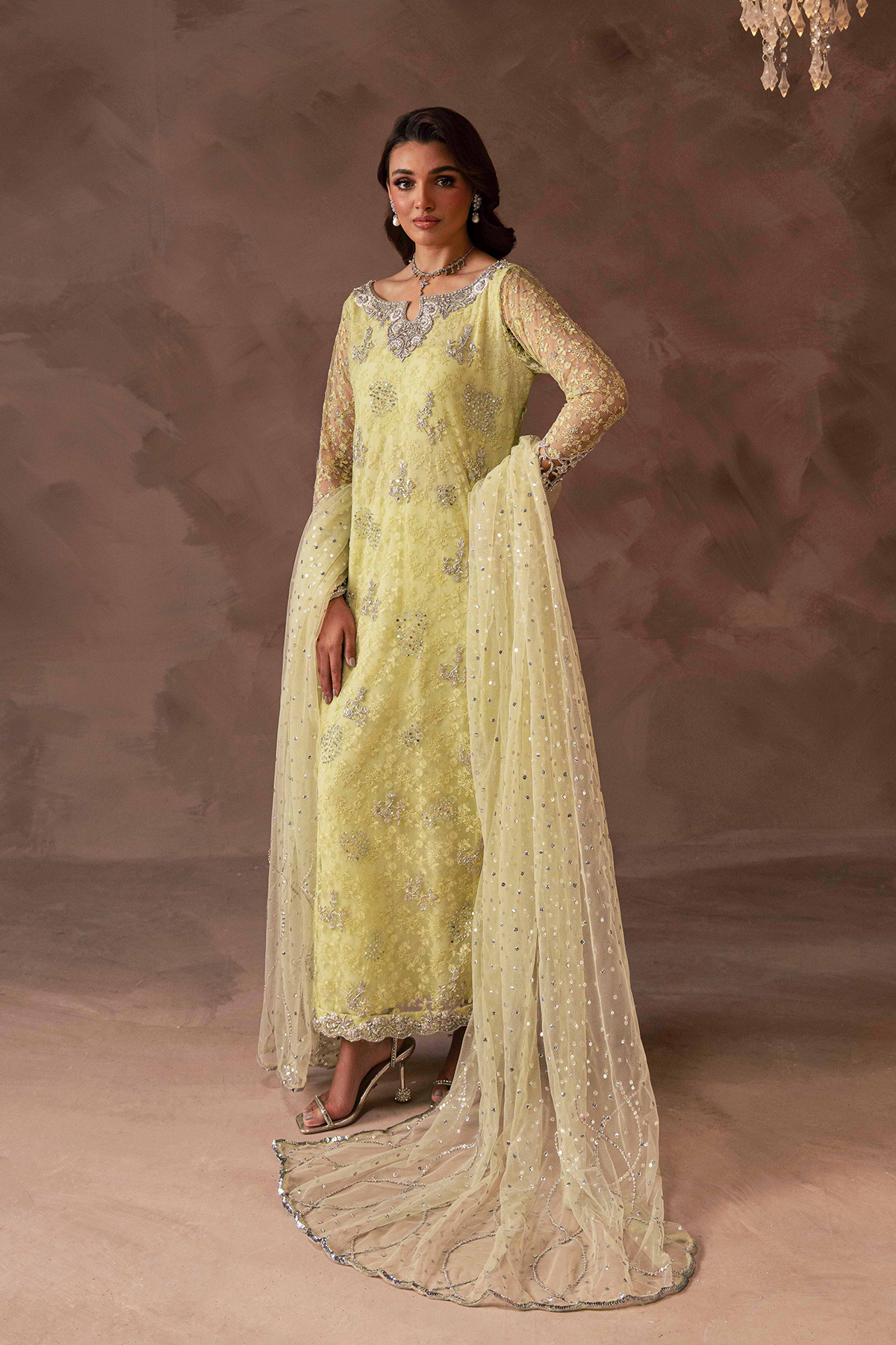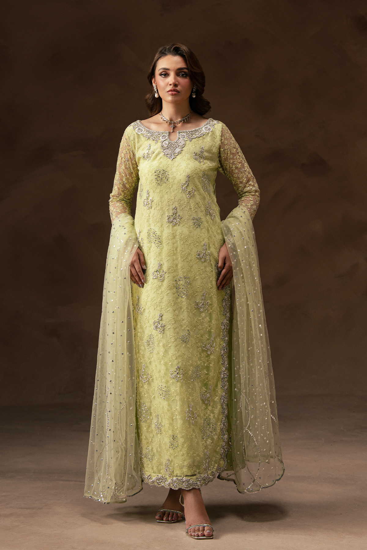 This long kameez with beautifully handcrafted neckline and cutwork sleeves is heavily embroidered with resham. Paired with raw silk pants and french net dupatta with scalloped borders and overall scattered work.