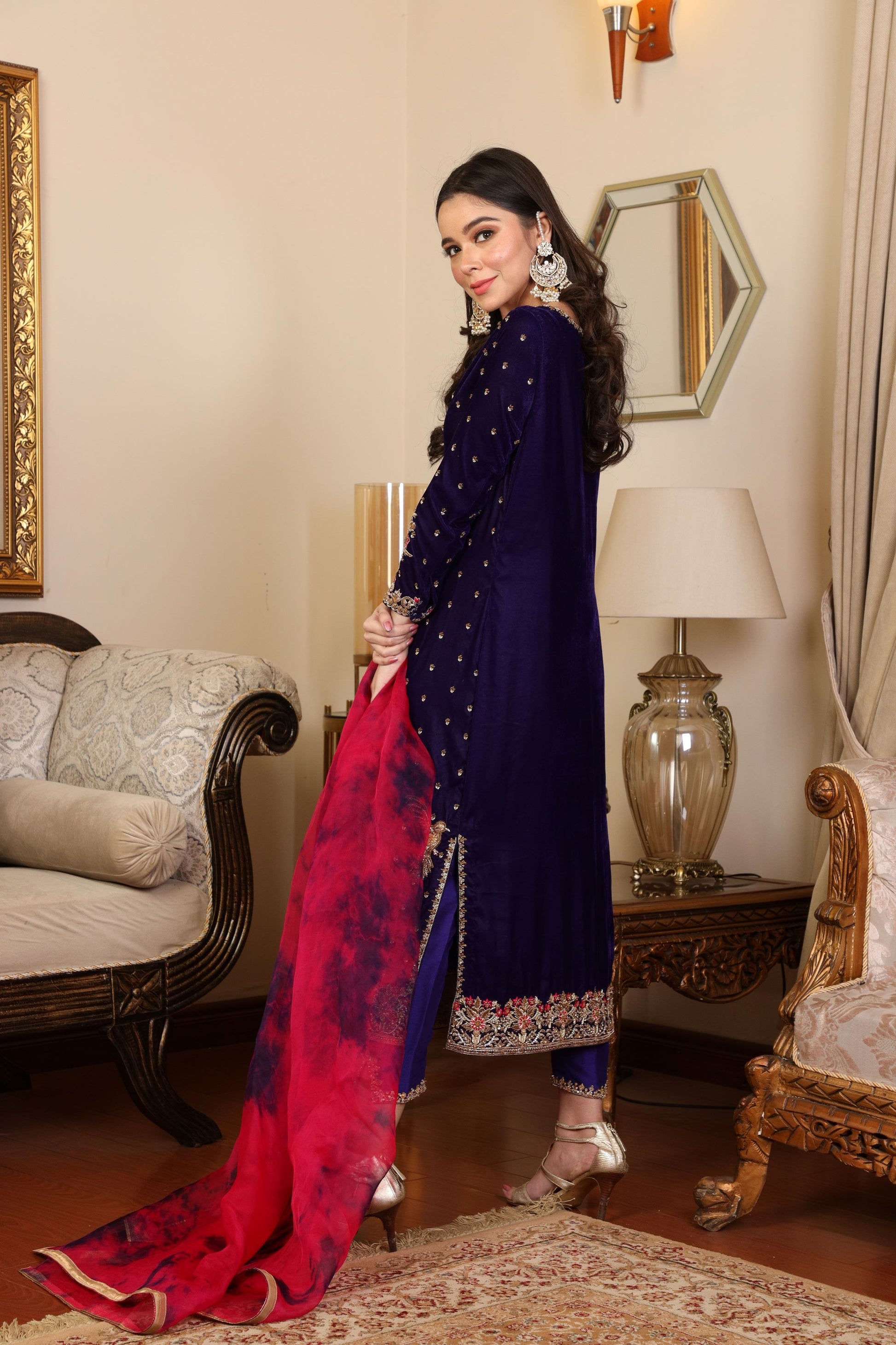 a lush pruple long shirt paired with an organza tie and dye dupatta. Hand crafted with dabka and naqshi work.
