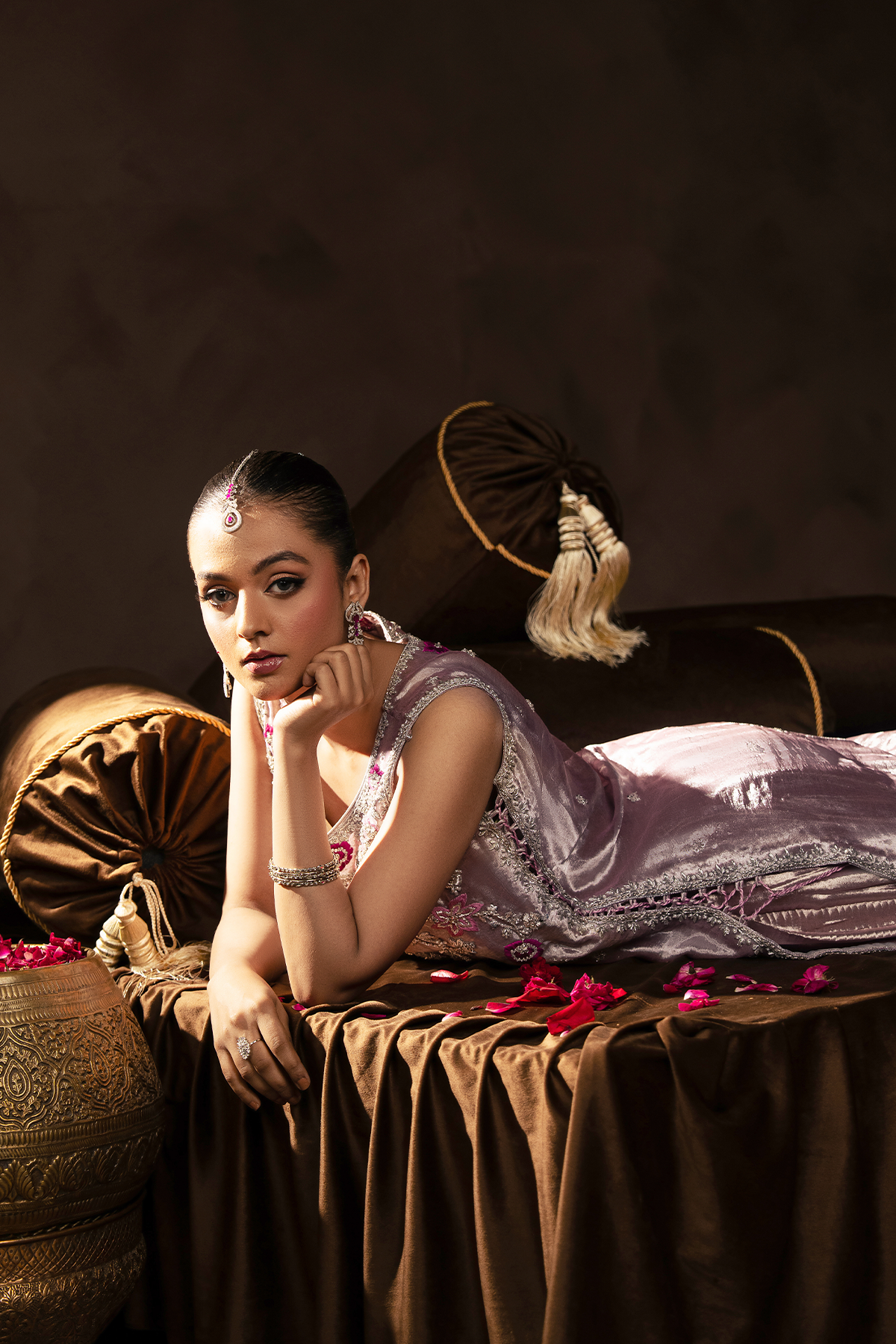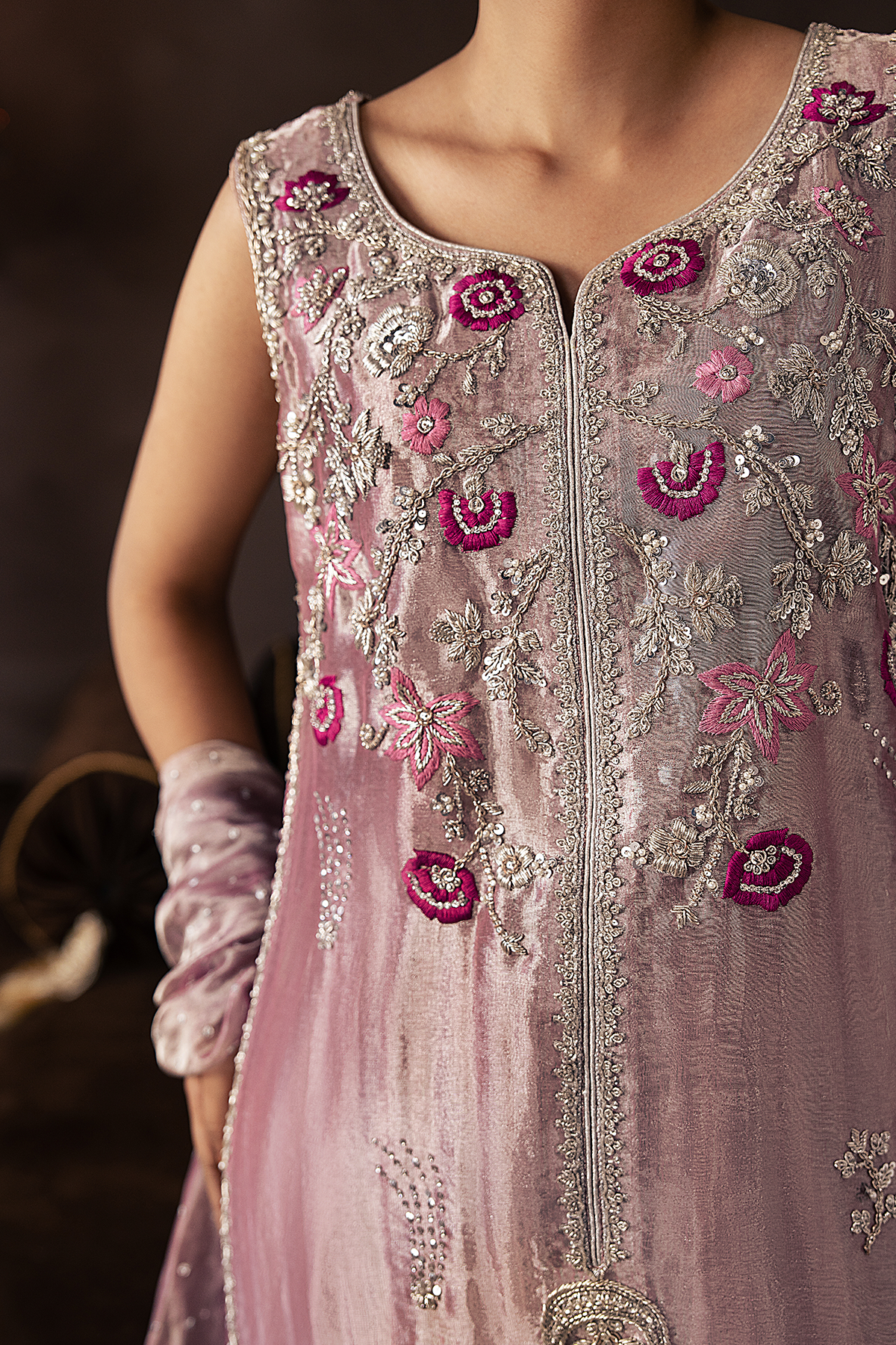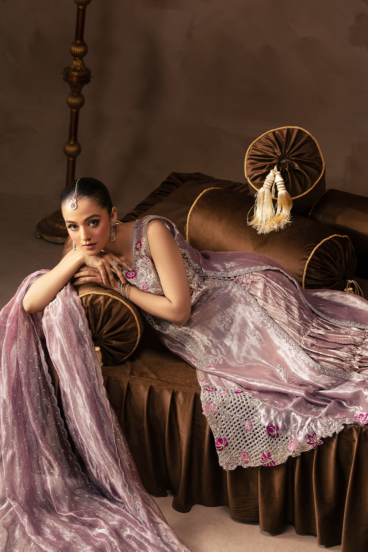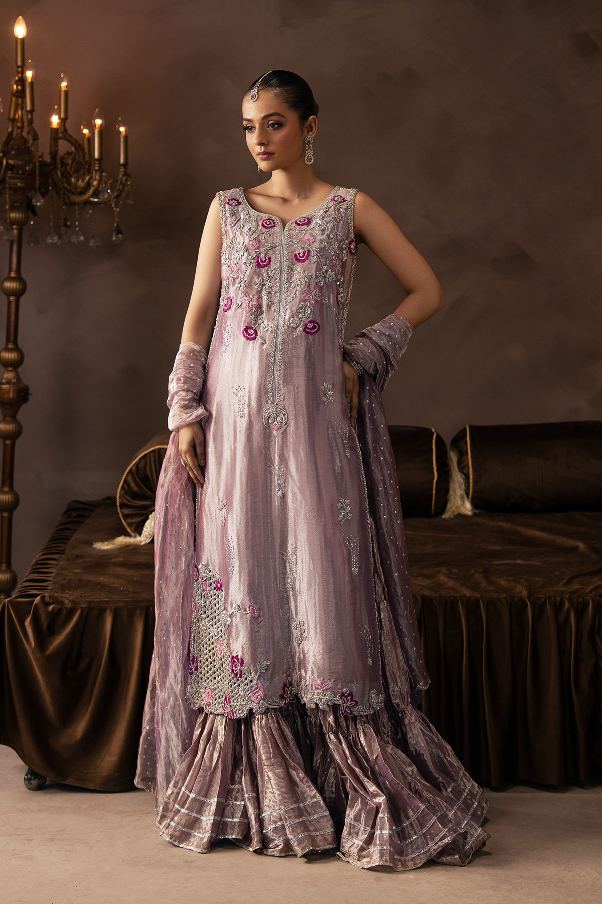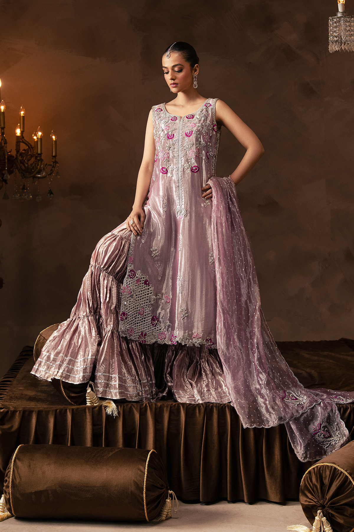 This beautifully handcrafted lameh tissue number is worked with sequins, Swarovski, beads, dabka kora, and mukaish. Paired with a crush sharara and gorgoeous lameh tissue duppata with beautifully handcrafted motifs on pallu.