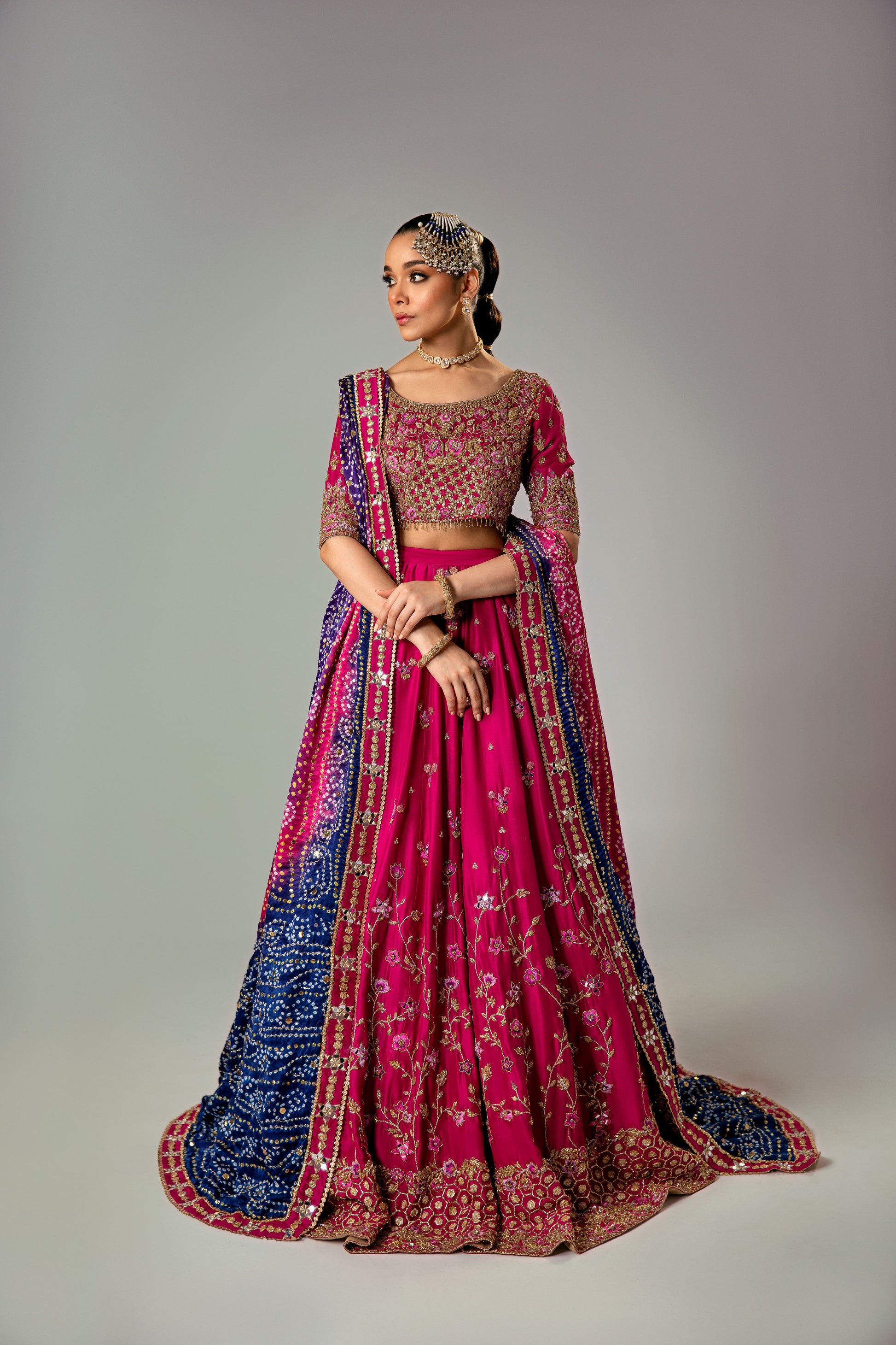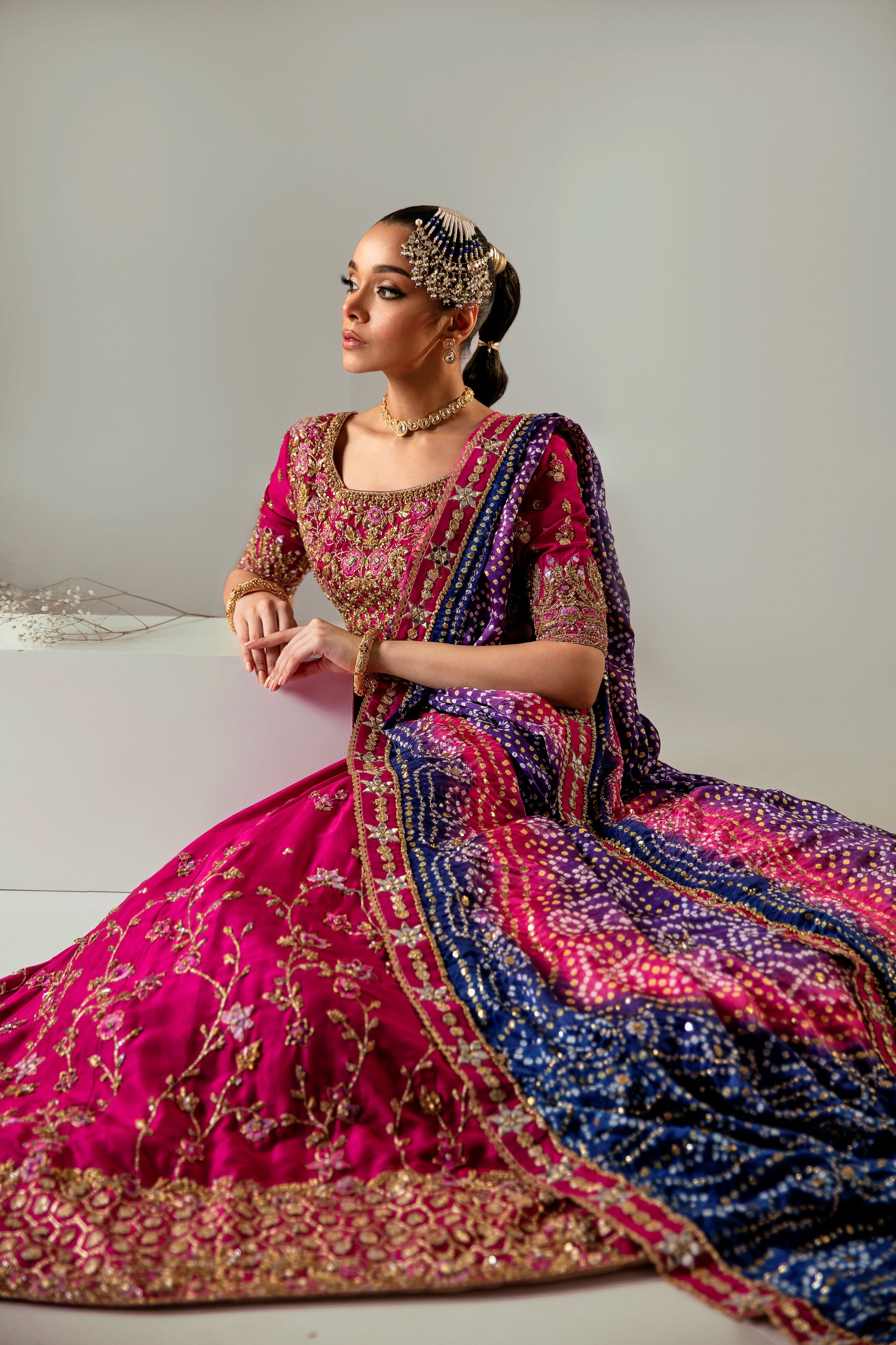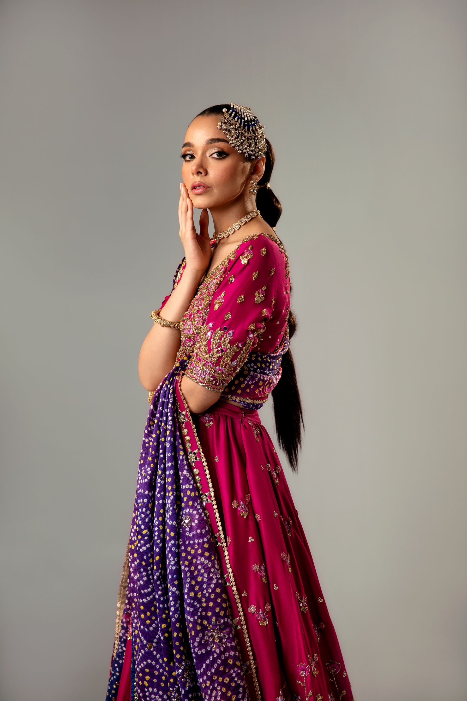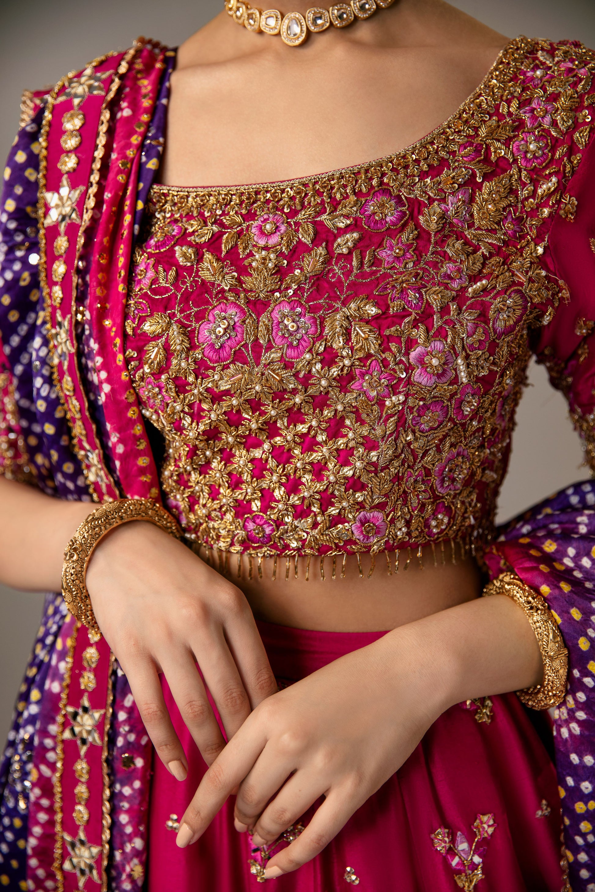 Magenta lehnga choli paired with a chunri dupatta. Worked with gota, sheesha, kora, dabka and resham work.