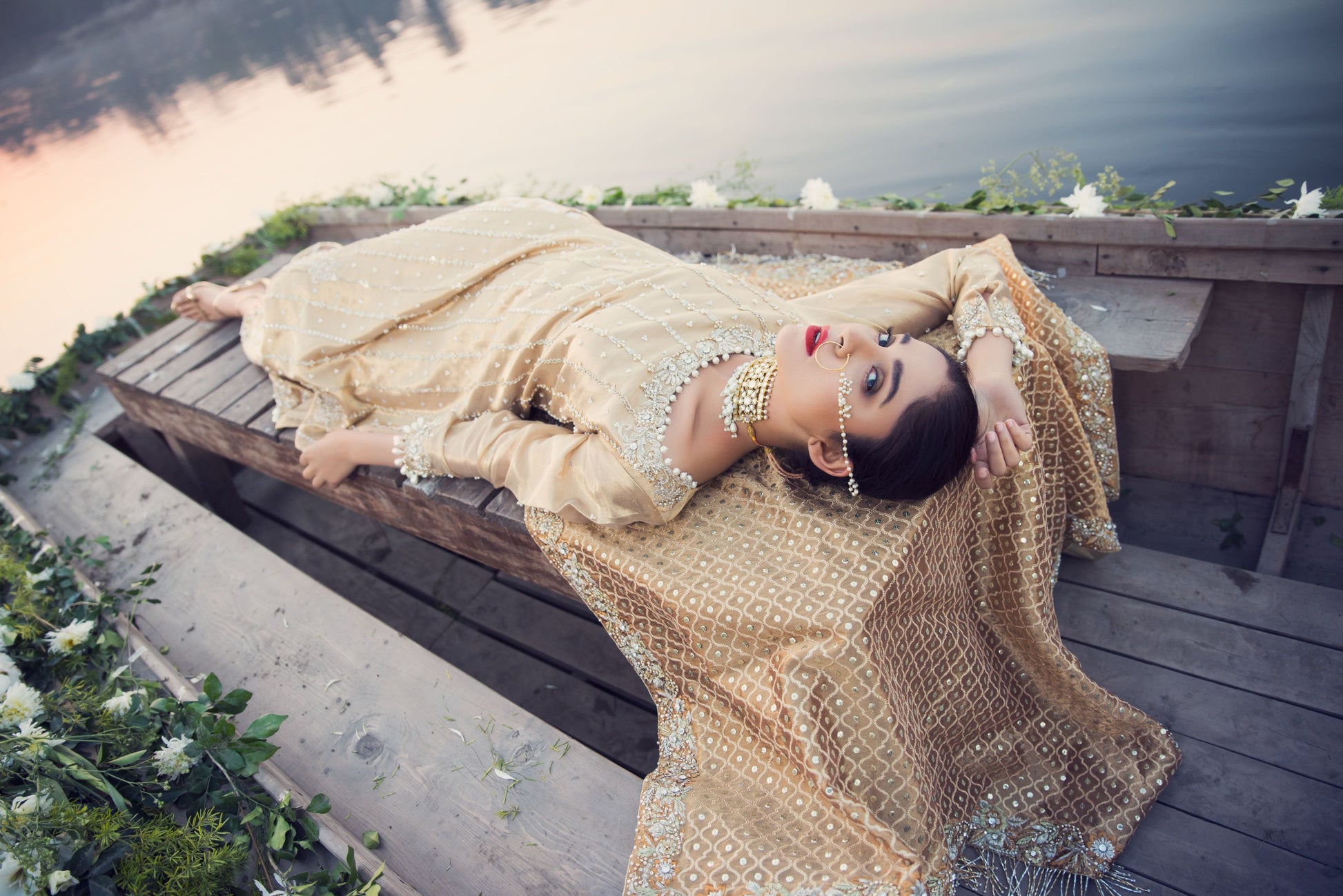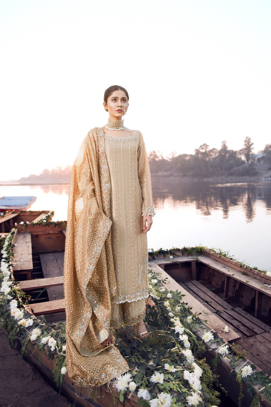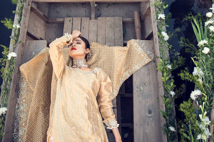 A classic cut, a gold long tissue shirt paired jamawar azaar pants. Worked with kora, dabka, naqshi and pearls.