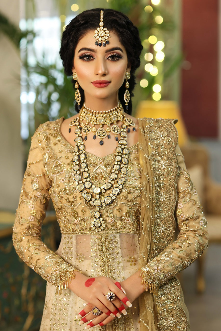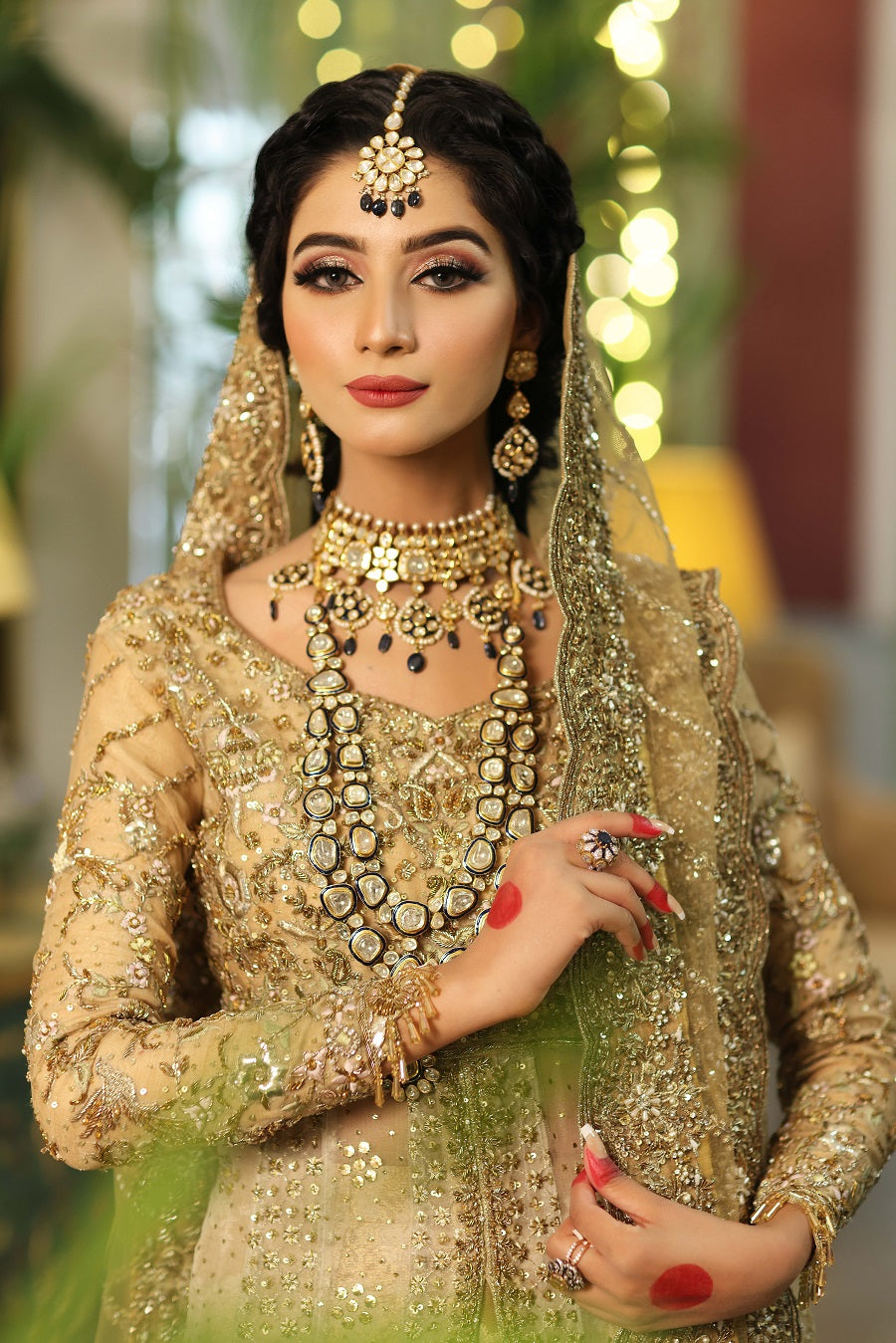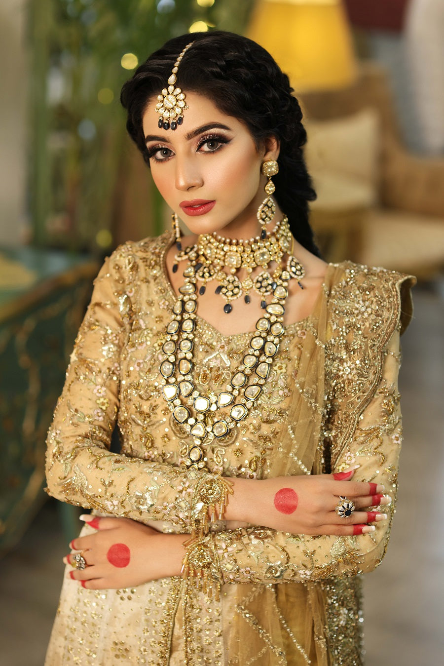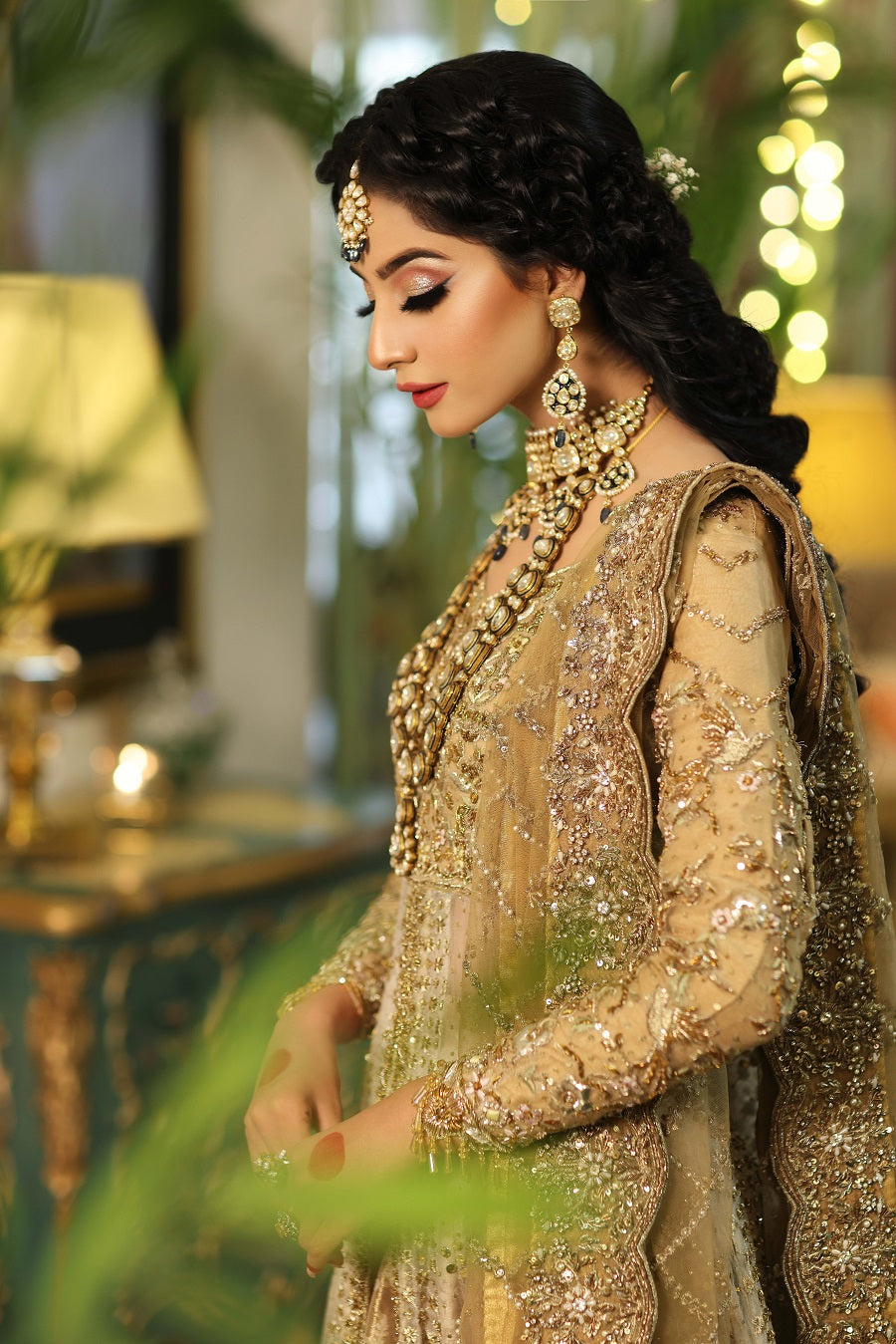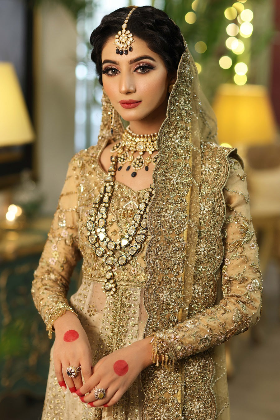 A lush gold kalidar paired with a pale peach mukaish dupatta. Worked with mukaish, sitara, kora and dabka work.