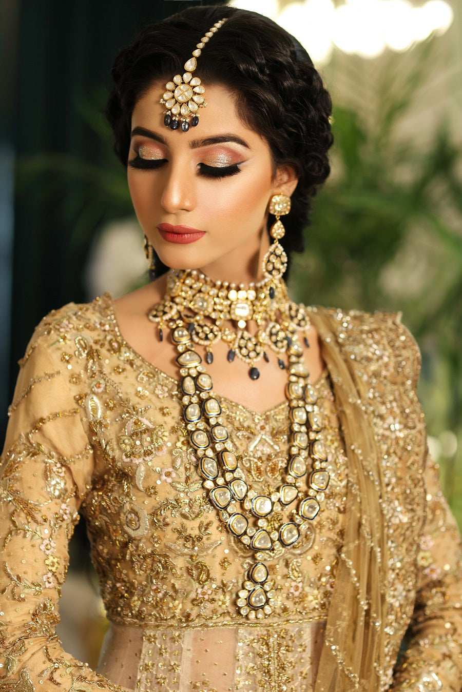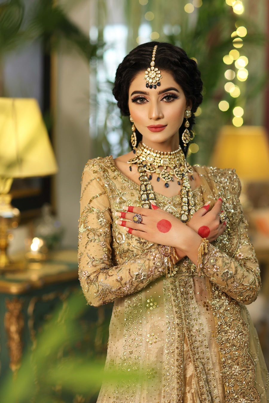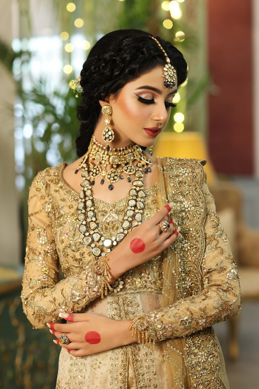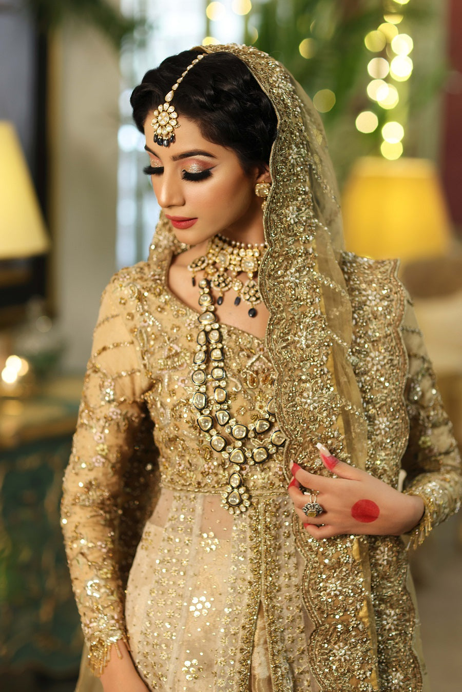 A lush gold kalidar paired with a pale peach mukaish dupatta. Worked with mukaish, sitara, kora and dabka work.