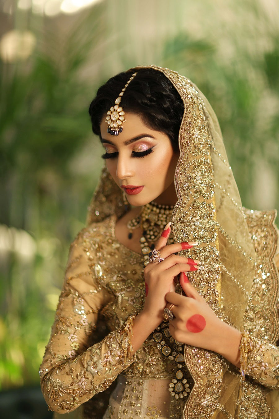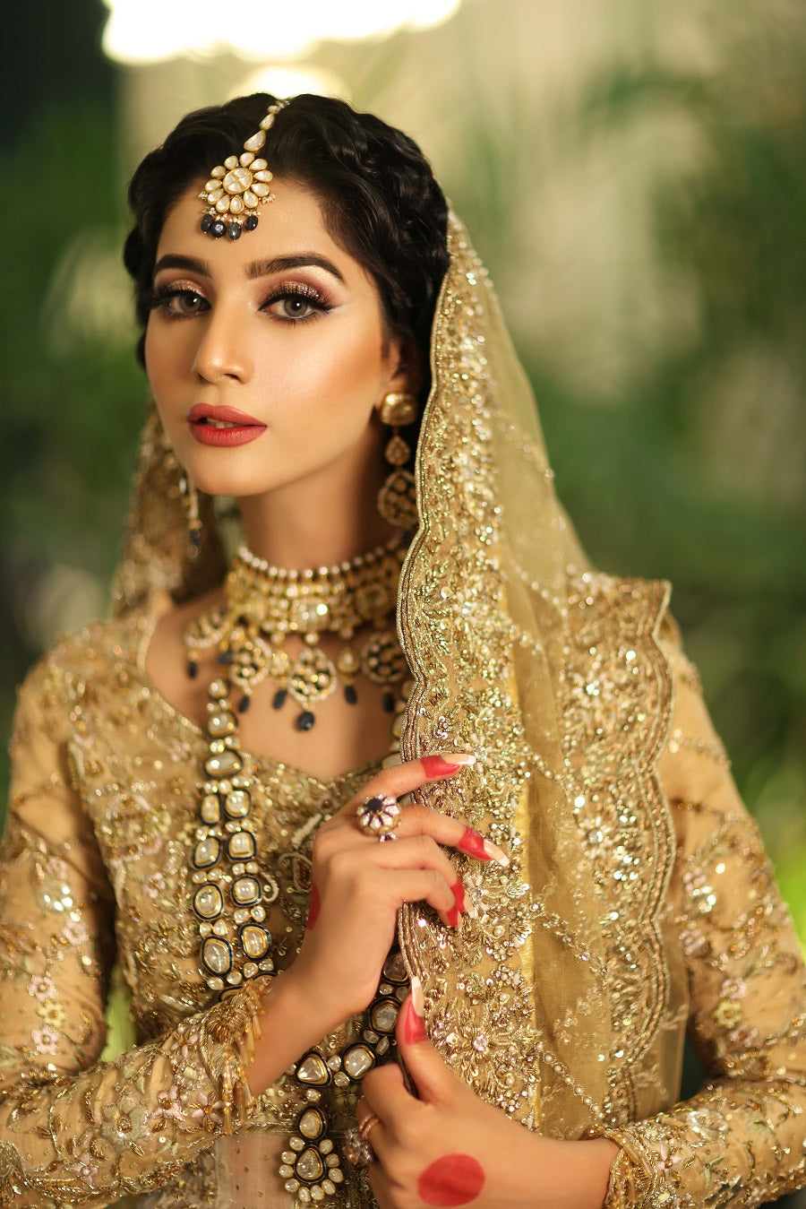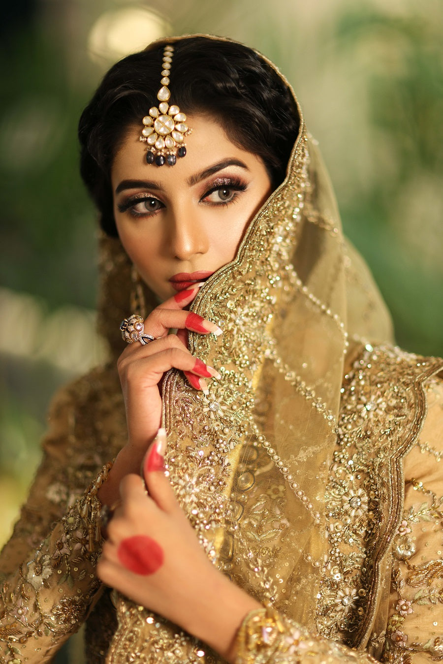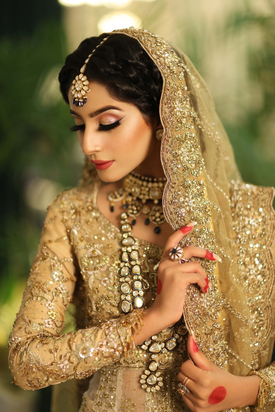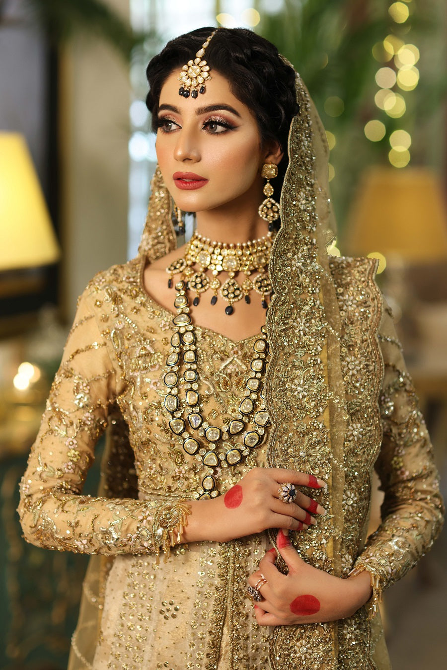 A lush gold kalidar paired with a pale peach mukaish dupatta. Worked with mukaish, sitara, kora and dabka work.