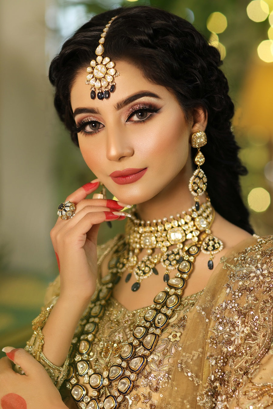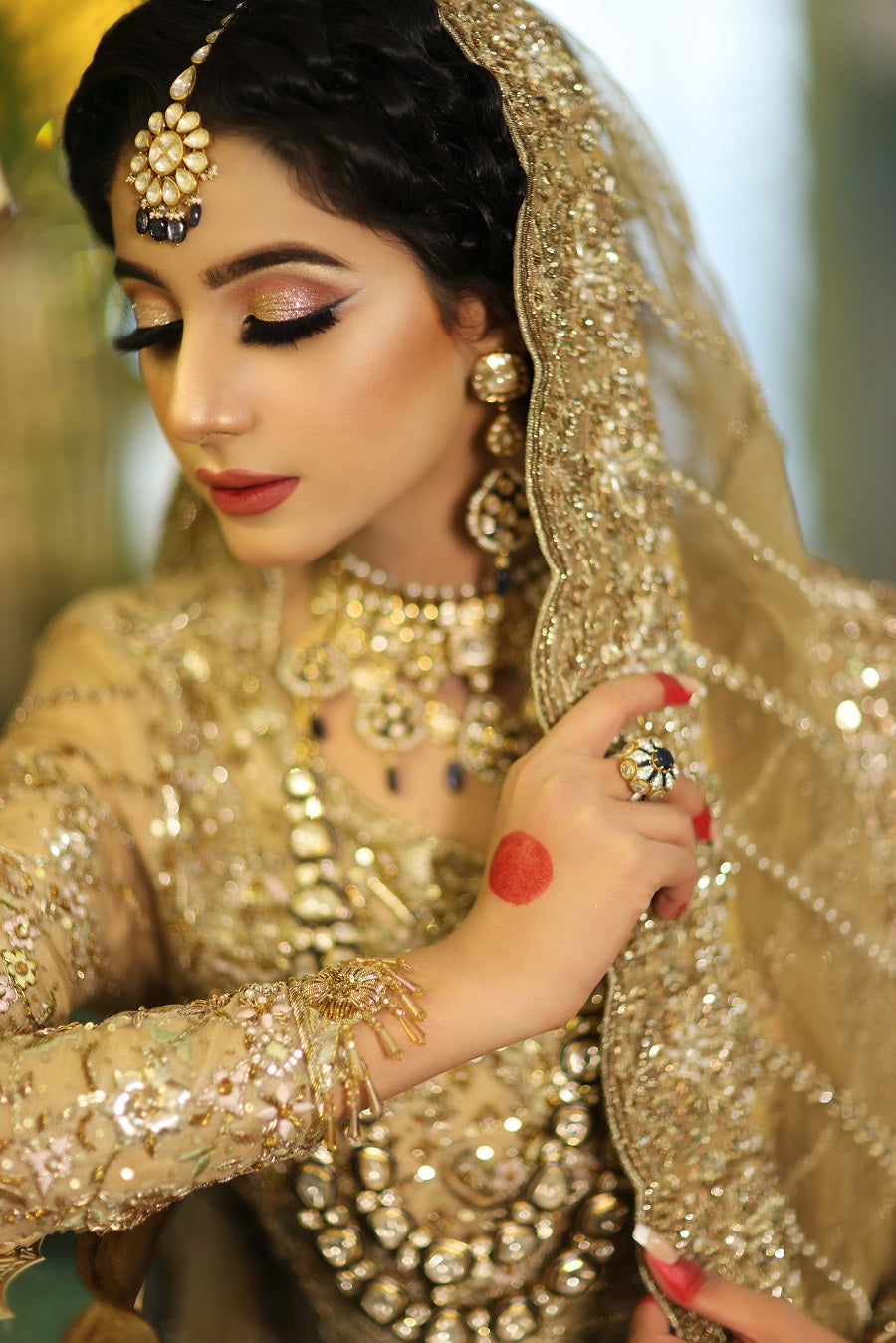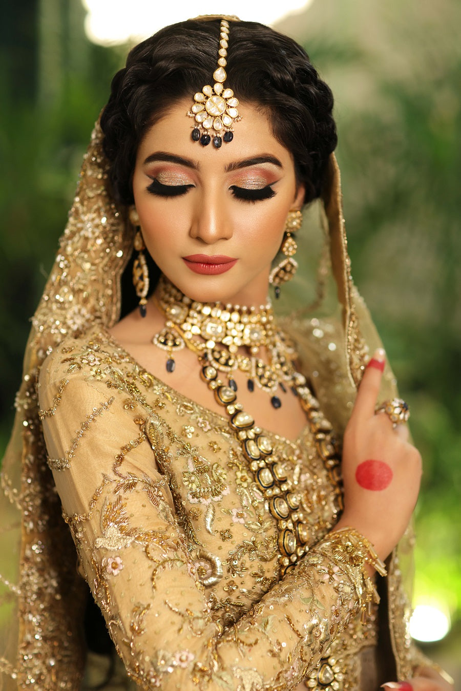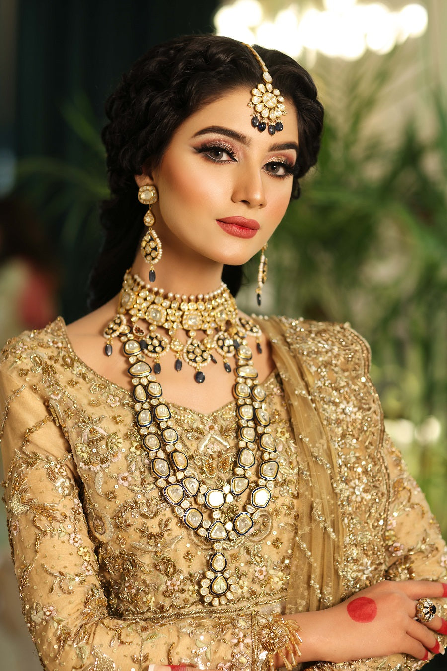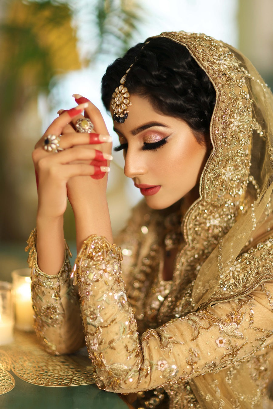 A lush gold kalidar paired with a pale peach mukaish dupatta. Worked with mukaish, sitara, kora and dabka work.