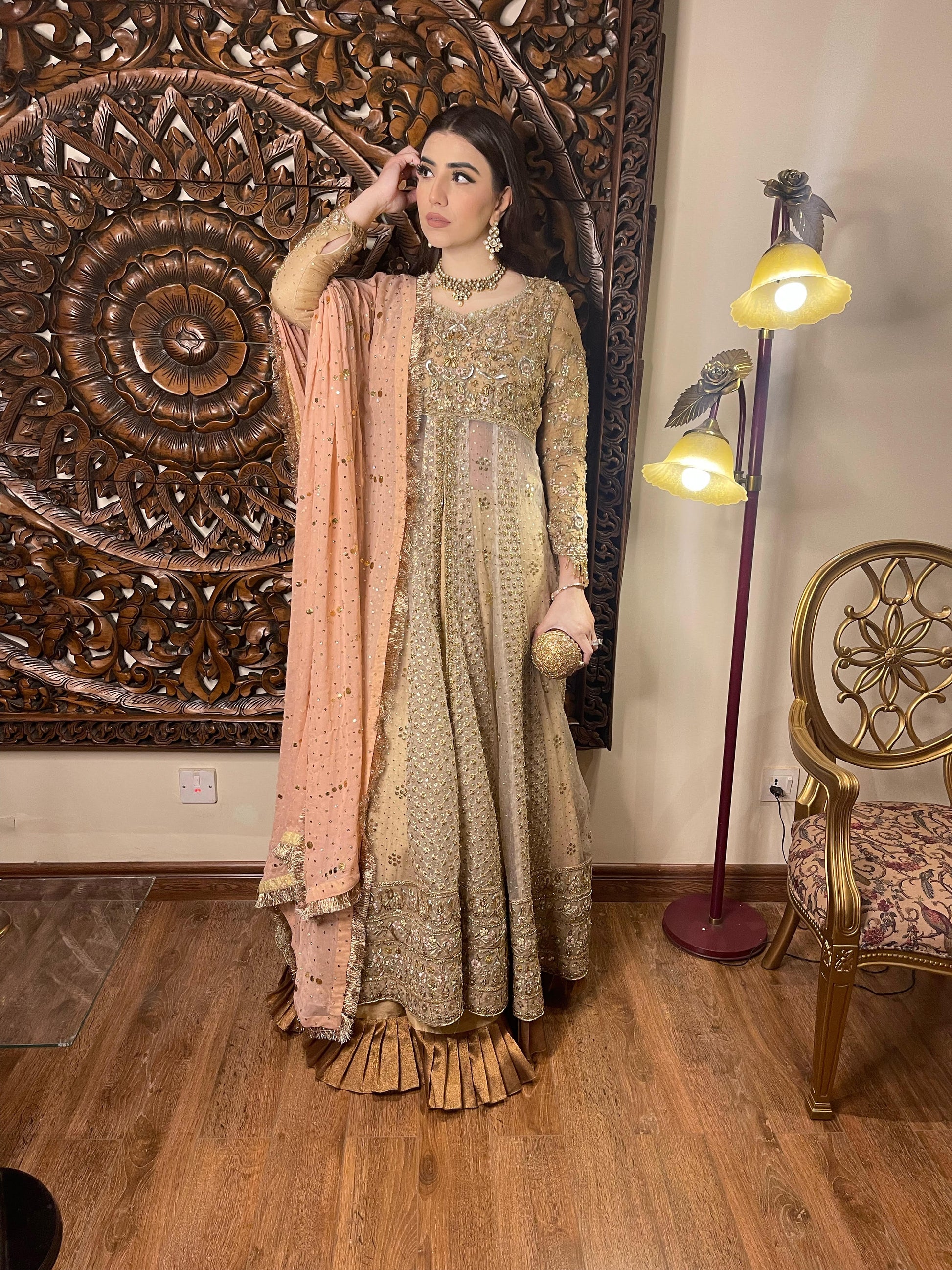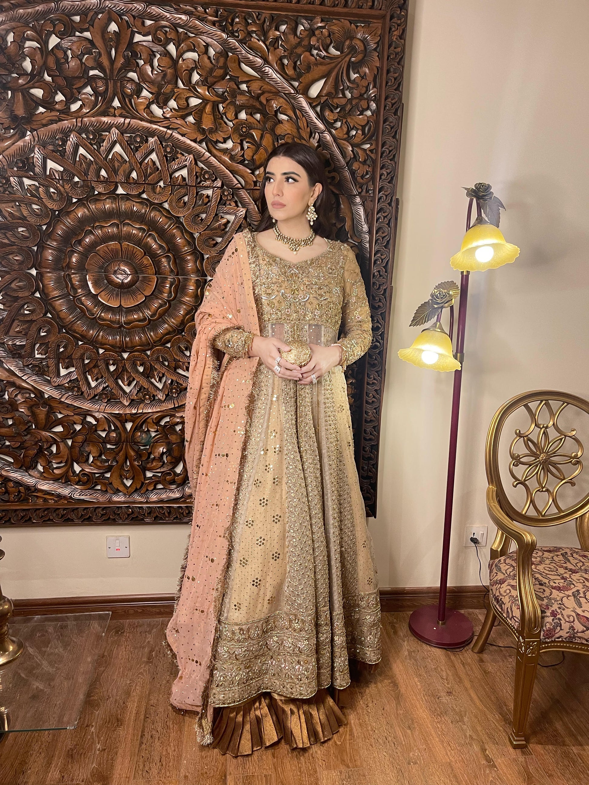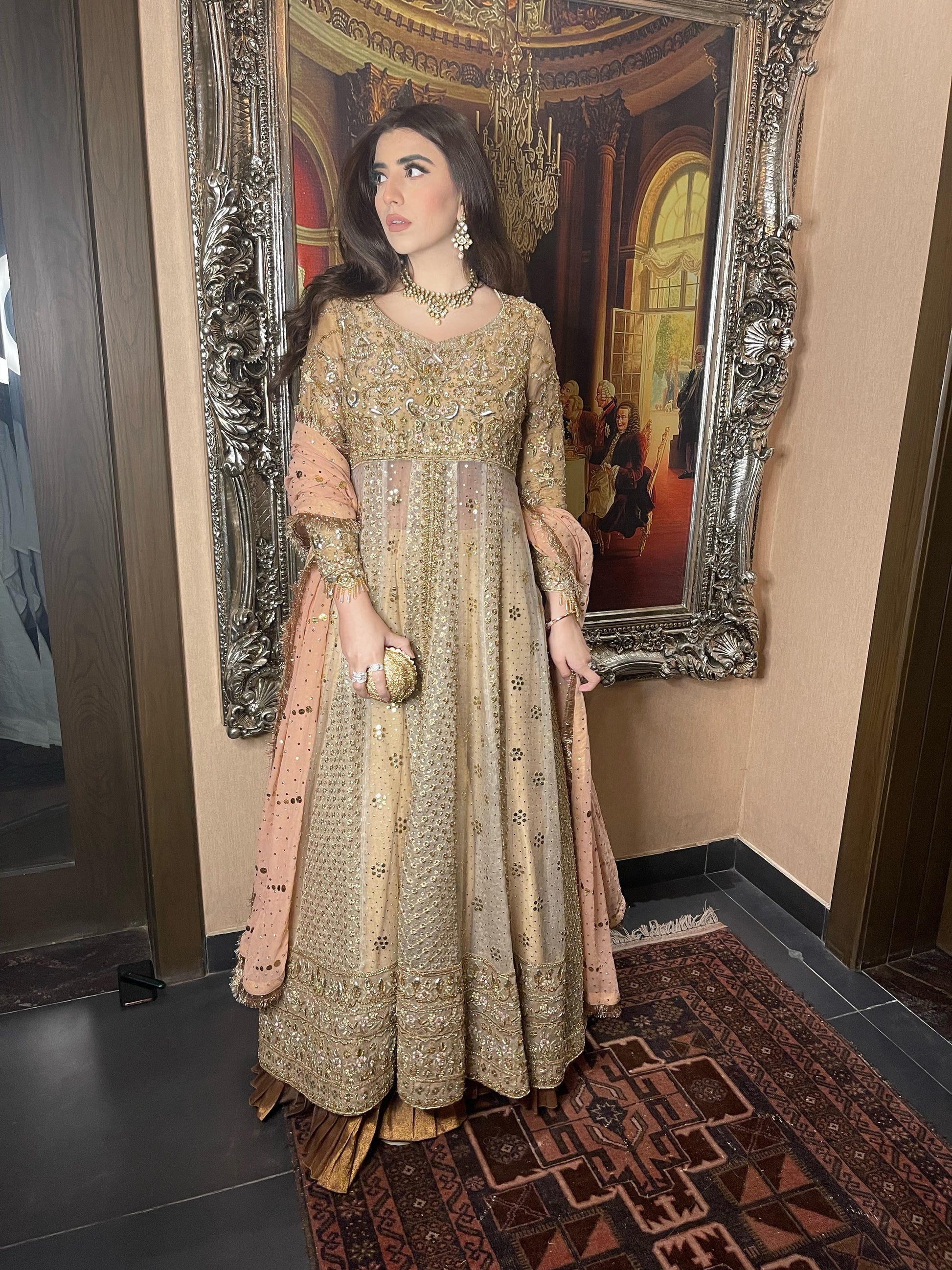 A lush gold kalidar paired with a gold net heavily embellished dupatta. Worked with mukaish, sitara, kora and dabka work.