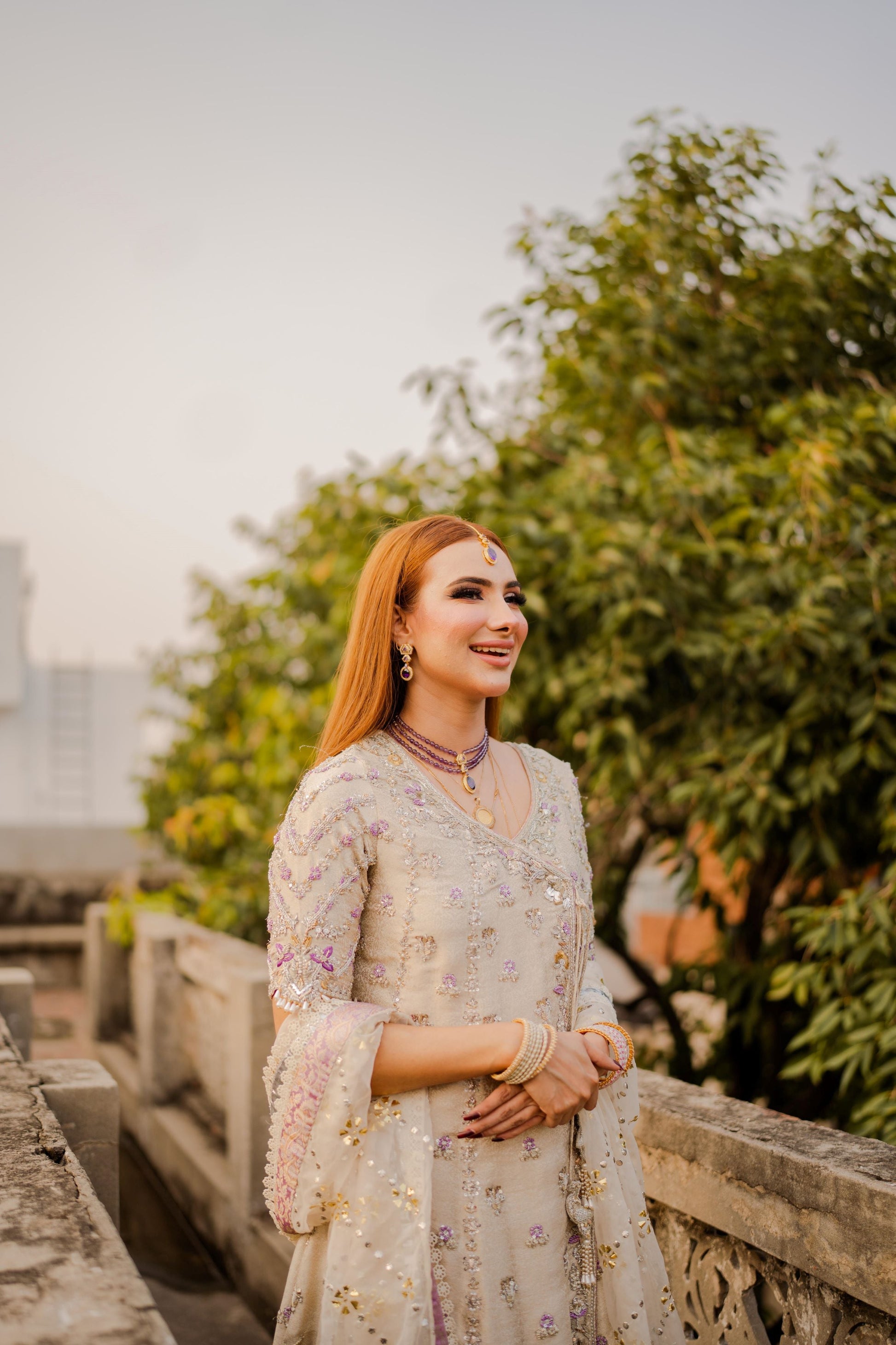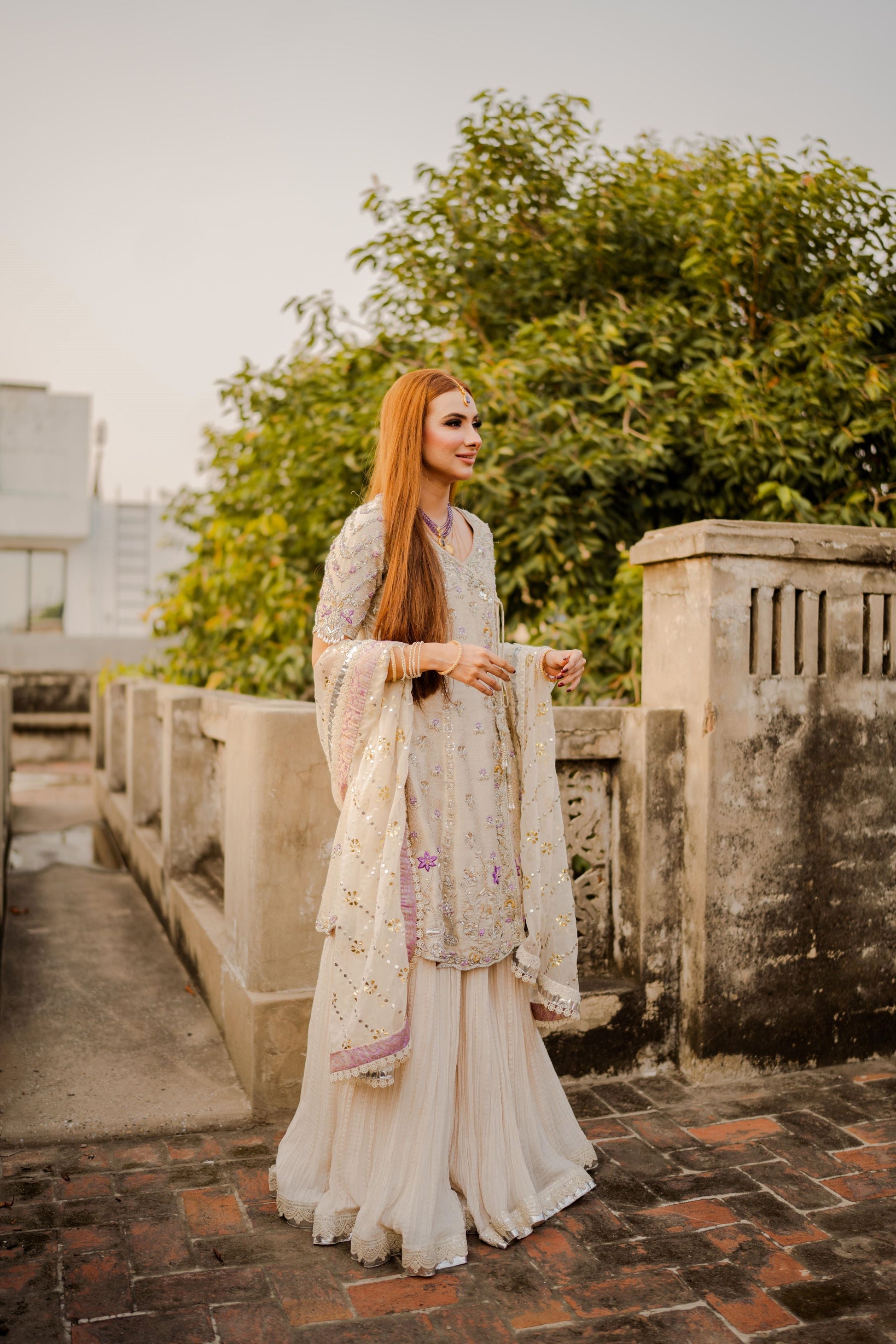 Intricately hand crafted short angrakha paired with a shara and mukaish dupatta. Worked with kora, dabka, kora work and resham.