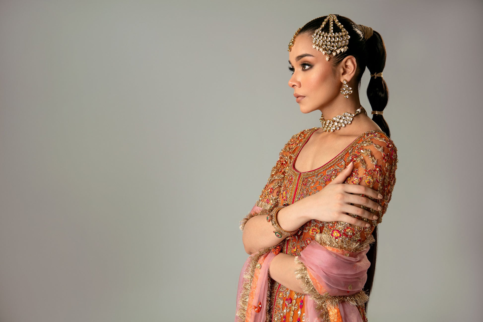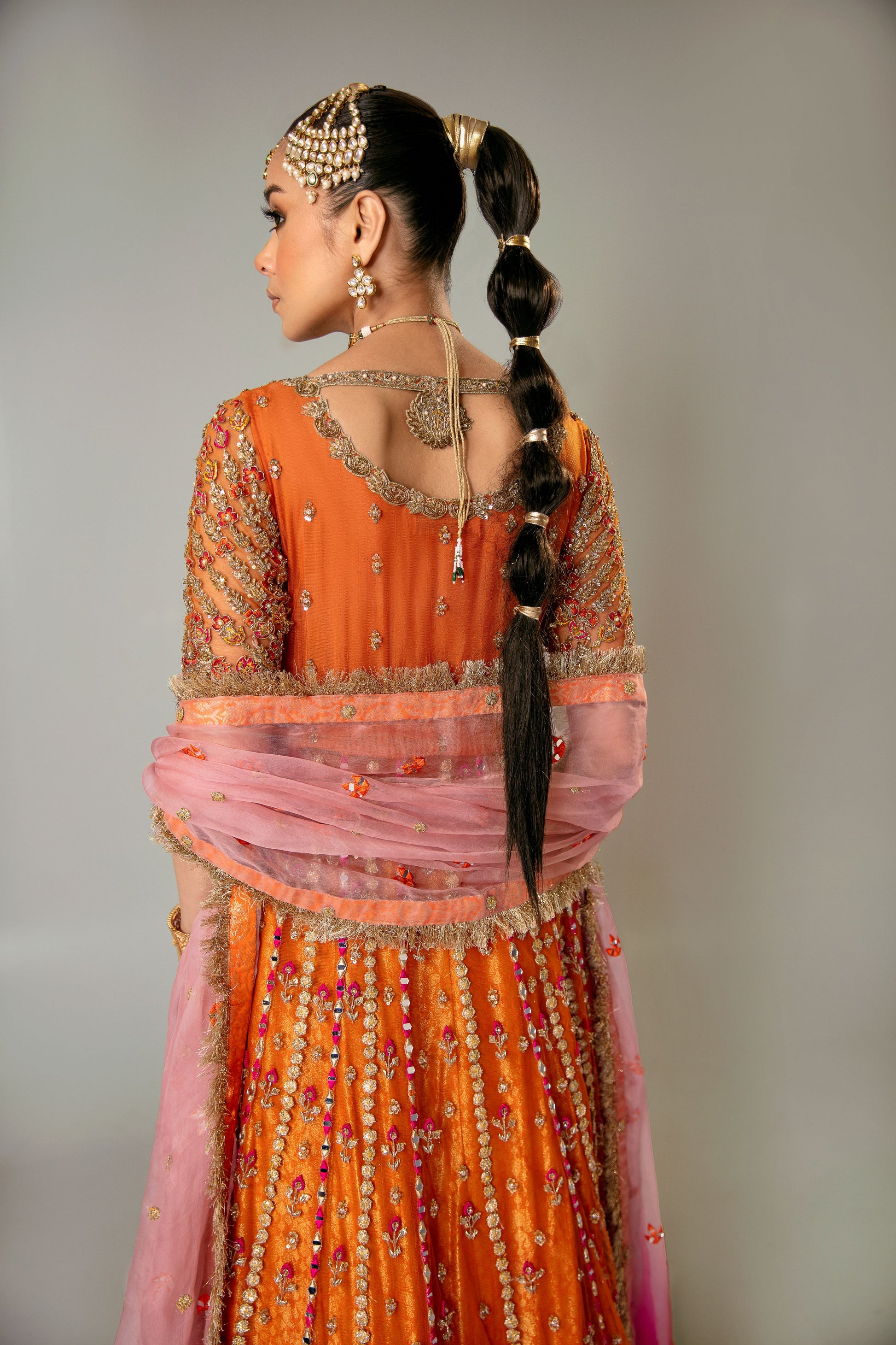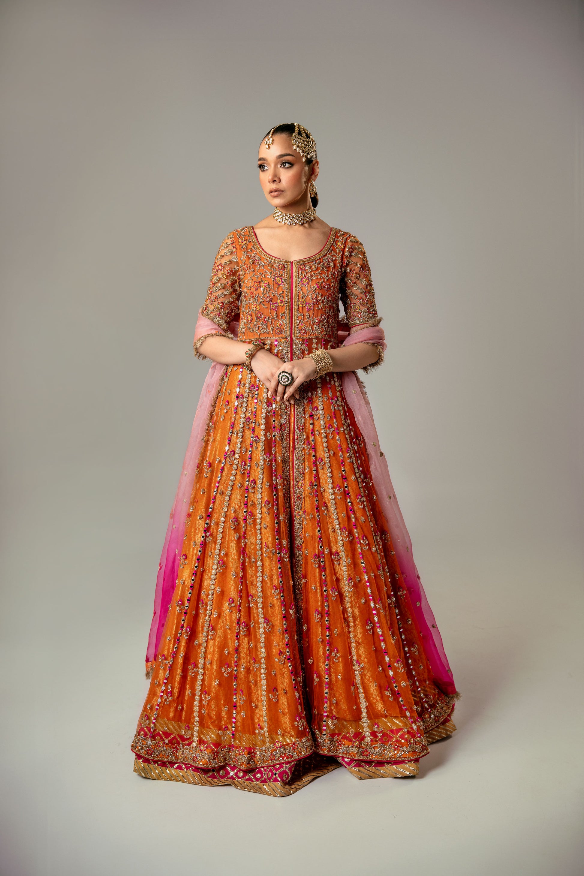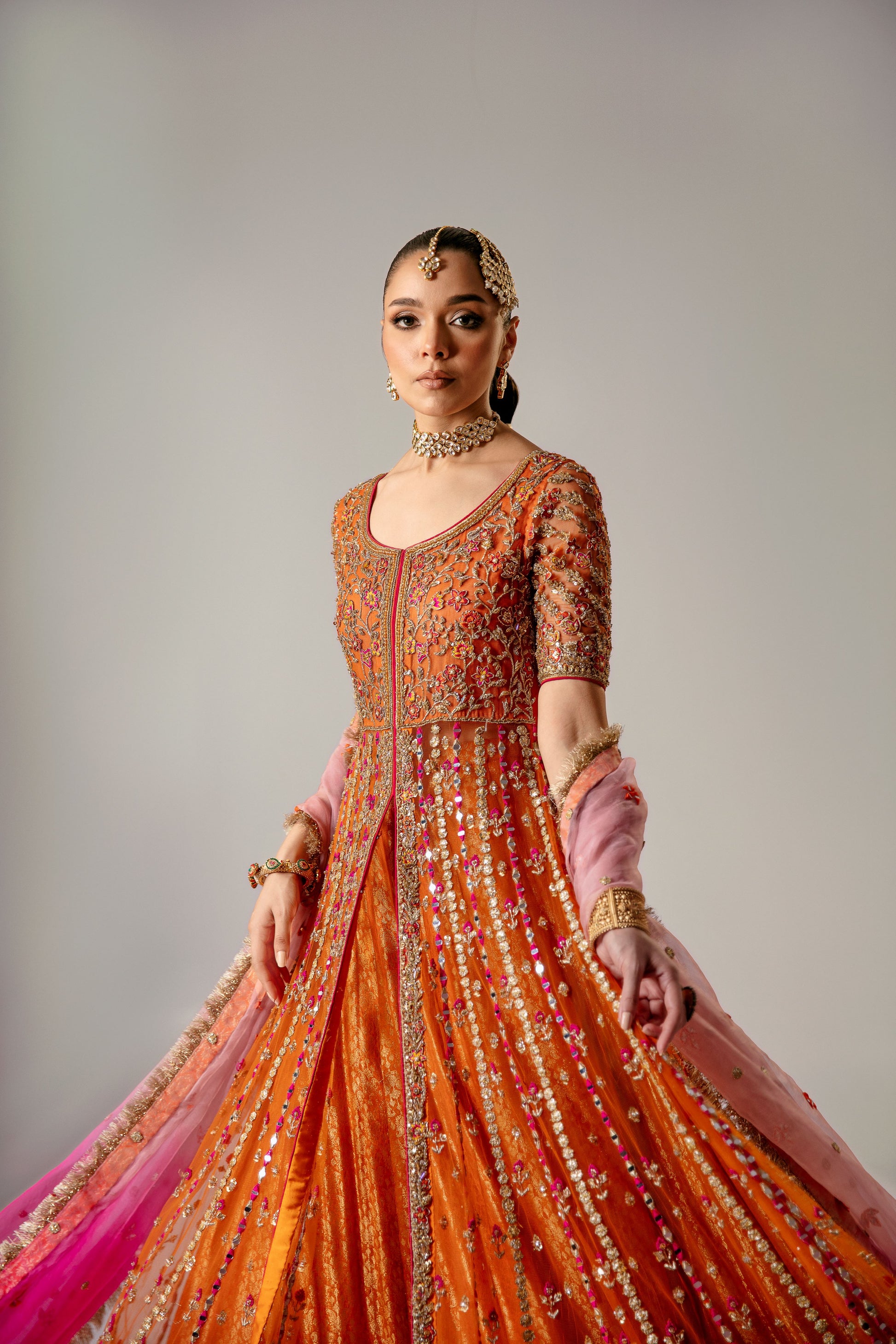 An orange kalidar worked with mirrors, resham, kora, dabka and nqashi work.